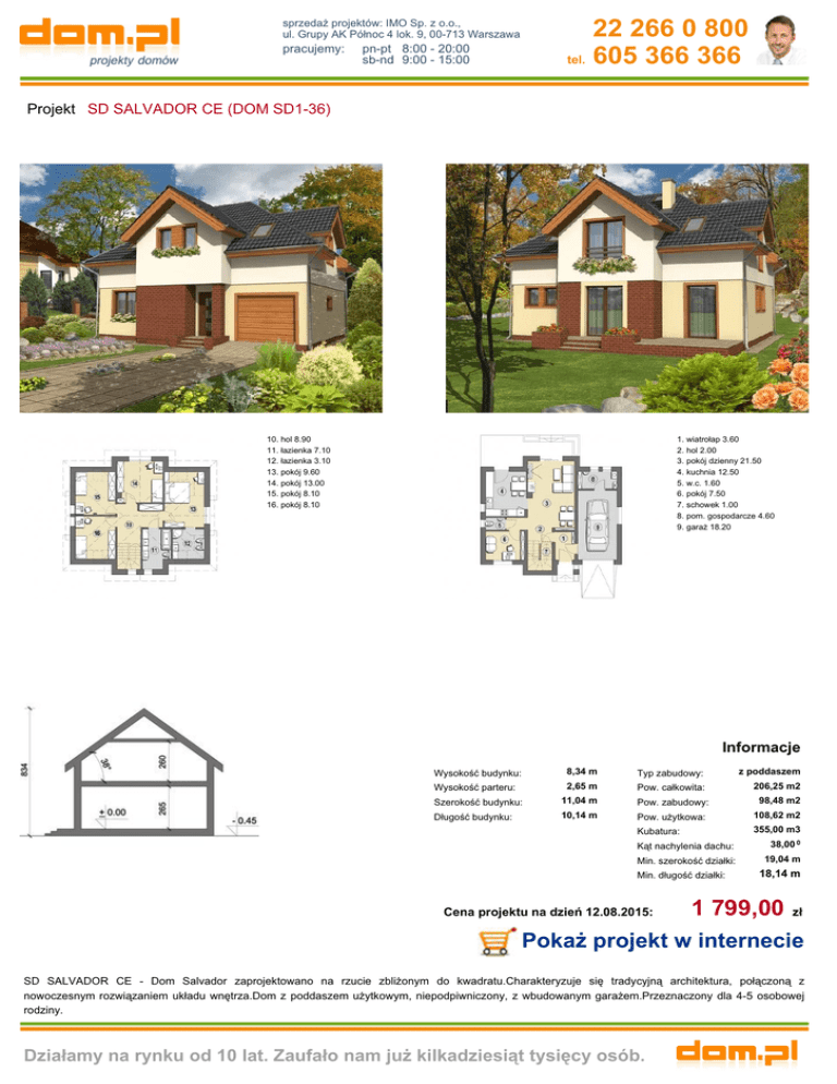 22 266 0 800 tel. 605 366 366 sprzedaż projektów: IMO Sp. z o.o., ul. Grupy AK Północ 4 lok. 9, 00-713 Warszawa pracujemy: pn-pt 8:00 - 20:00 sb-nd 9:00 - 15:00 Projekt SD SALVADOR CE (DOM SD1-36) 10. hol 8.90 11. łazienka 7.10 12. łazienka 3.10 13. pokój 9.60 14. pokój 13.00 15. pokój 8.10 16. pokój 8.10 1. wiatrołap 3.60 2. hol 2.00 3. pokój dzienny 21.50 4. kuchnia 12.50 5. w.c. 1.60 6. pokój 7.50 7. schowek 1.00 8. pom. gospodarcze 4.60 9. garaż 18.20 Informacje Wysokość budynku: 8,34 m Typ zabudowy: z poddaszem Wysokość parteru: 2,65 m Pow. całkowita: 206,25 m2 Szerokość budynku: 11,04 m Pow. zabudowy: 98,48 m2 Długość budynku: 10,14 m Pow. użytkowa: 108,62 m2 Kubatura: 355,00 m3 Kąt nachylenia dachu: 38,00 0 Min. szerokość działki: 19,04 m Min. długość działki: Cena projektu na dzień 12.08.2015: 18,14 m 1 799,00 zł Pokaż projekt w internecie SD SALVADOR CE - Dom Salvador zaprojektowano na rzucie zbliżonym do kwadratu.Charakteryzuje się tradycyjną architektura, połączoną z nowoczesnym rozwiązaniem układu wnętrza.Dom z poddaszem użytkowym, niepodpiwniczony, z wbudowanym garażem.Przeznaczony dla 4-5 osobowej rodziny. Działamy na rynku od 10 lat. Zaufało nam już kilkadziesiąt tysięcy osób.