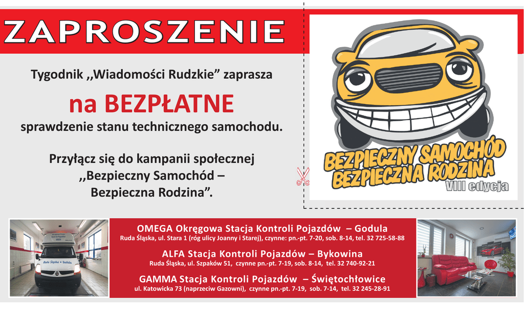 ZAPROSZENIE Tygodnik ,,Wiadomości Rudzkie” zaprasza na BEZPŁATNE sprawdzenie stanu technicznego samochodu. Przyłącz się do kampanii społecznej ,,Bezpieczny Samochód – Bezpieczna Rodzina”. OMEGA Okręgowa Stacja Kontroli Pojazdów – Godula Ruda Śląska, ul. Stara 1 (róg ulicy Joanny i Starej), czynne: pn.-pt. 7-20, sob. 8-14, tel. 32 725-58-88 ALFA Stacja Kontroli Pojazdów – Bykowina Ruda Śląska, ul. Szpaków 51, czynne pn.-pt. 7-19, sob. 8-14, tel. 32 740-92-21 GAMMA Stacja Kontroli Pojazdów – Świętochłowice ul. Katowicka 73 (naprzeciw Gazowni), czynne pn.-pt. 7-19, sob. 7-14, tel. 32 245-28-91 ___________________________________________ marka pojazdu ___________________________________________ ZAPROSZENIE Z tym zaproszeniem do 30 października 2015 r. bezpłatnie sprawdzisz swój samochód: model • w Stacji Kontroli Pojazdów ALFA – Bykowina, ul. Szpaków 51, tel. 32 740-92-21 ___________________________________________ rok produkcji • w Okręgowej Stacji Kontroli Pojazdów OMEGA – Godula, ul. Stara 1, tel. 32 725-58-88 ___________________________________________ kontakt (telefon lub e-mail) ___________________________________________ podpis • w Stacji Kontroli Pojazdów GAMMA – Świętochłowice, ul. Katowicka 73, tel. 32 245-28-91 Wyrażam zgodę na przetwarzanie i wykorzystywanie moich danych osobowych w celach marketingowych oraz umieszczenie ich w bazie danych Partnera kampanii ,,Bezpieczny Samochód – Bezpieczna Rodzina”, zgodnie z Ustawą o ochronie danych osobowych z dnia 29 sierpnia 1997 roku (Dz. U. Nr 133, pozycja 883). AKCJĘ WSPIERAJĄ: