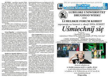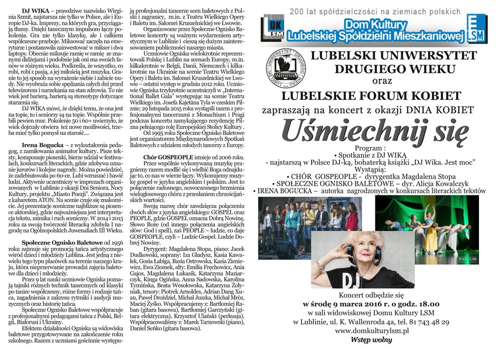 DJ WIKA – prawdziwe nazwisko Wirgi nia Szmit, najstarsza nie tylko w Polsce, ale i Eu ropie DJka. Imprezy, na których gra, przyciąga ją tłumy. Dzięki tanecznym impulsom łączy po kolenia. Gra nie tylko klasykę, ale i całkiem współczesne przeboje. Miksować zaczęła na eme ryturze i postanowiła zainwestować w mikser i dwa laptopy. Obecnie miksuje ramię w ramię ze zna nymi didżejami i podobnie jak oni ma swoich fa nów w różnym wieku. Podkreśla, że wszystko, co robi, robi z pasją, a jej miłością jest muzyka. Gra nie to jej sposób na wyrażenie siebie i zabicie nu dy. Nie wyobraża sobie spędzania całych dni przed telewizorem i narzekania na stan zdrowia. To nie wiek jest barierą, barierą są stereotypy dotyczące starzenia się. DJ WIKA mówi, że dzięki temu, że ona jest na topie, to i seniorzy są na topie. Wspólnie prze bili pewien mur. Pokolenie 50 i 60+ uwierzyło, że wiek dojrzały otwiera też nowe możliwości, trze ba mieć tylko pomysł na starość.... Irena Bogucka – z wykształcenia peda gog, z zamiłowania animator kultury. Pisze tek sty, komponuje piosenki, bierze udział w festiwa lach, konkursach literackich, gdzie zdobywa uzna nie jurorów i kolejne nagrody. Można powiedzieć, że zadebiutowała po 60ce. Lubi wzruszać i bawić ludzi. Aktywnie uczestniczy w imprezach organi zowanych w Lublinie z okazji Dni Seniora, Nocy Kultury, projektu „Miasto Poezji”. Związana jest z kabaretem ATON. Na scenie czuje się znakomi cie. Jej prezentacje sceniczne najbliższe są piosen ce aktorskiej, gdzie najważniejsza jest interpreta cja tekstu, mimika i ruch sceniczny. W 2014 i 2015 roku za swoją twórczość literacką zdobyła I na grodę na Ogólnopolskich Juwenaliach III Wieku. Społeczne Ognisko Baletowe od 1956 roku zajmuje się promocją tańca artystycznego wśród dzieci i młodzieży Lublina. Jest jedną z nie wielu tego typu placówek na terenie naszego kra ju, która nieprzerwanie prowadzi zajęcia baleto we dla dzieci i młodzieży. Przez 9 lat nauki uczniowie Ogniska pozna ją tajniki różnych technik tanecznych od klasyki po taniec współczesny, różne formy i rodzaje tań ca, zagadnienia z zakresu rytmiki i audycji mu zycznych oraz historię tańca. Społeczne Ognisko Baletowe współpracuje z profesjonalnymi pedagogami tańca z Polski, Bel gii, Białorusi i Ukrainy. Efektem działalności Ogniska są widowiska baletowe przygotowywane na zakończenie roku szkolnego. Razem z uczniami gościnnie występu ją profesjonalni tancerze scen baletowych z Pol ski i zagranicy, m.in. z Teatru Wielkiego Opery i Baletu im. Salomei Kruszelnickiej we Lwowie. Organizowane przez Społeczne Ognisko Ba letowe koncerty są ważnym wydarzeniem arty stycznym w Lublinie i cieszą się dużym zaintere sowaniem publiczności naszego miasta. Uczniowie Ogniska wielokrotnie reprezen towali Polskę i Lublin na scenach Europy, m.in. kilkakrotnie w Belgii, Danii, Niemczech i kilka krotnie na Ukrainie na scenie Teatru Wielkiego Opery i Baletu im. Salomei Kruszelnickiej we Lwo wie – ostatni występ w grudniu 2012 roku. Ucznio wie Ogniska trzykrotnie uczestniczyli w „Interna tional Ballet Gala” występując na scenie Teatru Wielkiego im. Josefa Kajetána Tyla w czeskim Pil znie; 29 listopada 2015 roku wystąpili razem z pro fesjonalnymi tancerzami z Monachium i Pragi podczas koncertu zamykającego rezydencję Pil zna pełniącego rolę Europejskiej Stolicy Kultury . Od 1995 roku Społeczne Ognisko Baletowe jest organizatorem Międzynarodowych Spotkań Baletowych z udziałem młodych tancerzy z Europy. Chór GOSPEOPLE istnieje od 2006 roku. Przez wspólnie wykonywaną muzykę pra gniemy razem modlić się i wielbić Boga odnajdu jąc to, co nas w wierze łączy. Wykonujemy muzy kę gospel w języku angielskim i polskim. Jest to połączenie radosnego, nowoczesnego brzmienia wielogłosowego chóru z przesłaniem chrześcijań skich wartości. Swoją nazwę chór zawdzięcza połączeniu dwóch słów z języka angielskiego: GOSPEL oraz PEOPLE, gdzie GOSPEL oznacza Dobrą Nowinę, Słowo Boże (od innego połączenia angielskich słów: God i spell), zaś PEOPLE – ludzie, co daje GOSPEOPLE, czyli – Ludzie Gospel. Ludzie Do brej Nowiny. Dyrygent: Magdalena Stopa, piano: Jacek Dudkowski, soprany: Iza Gładysz, Kasia Kawa łek, Gosia Łabiga, Basia Ostrowska, Kasia Zienie wicz, Ewa Ziomek, alty: Emilia Fręchowicz, Ania Gajos, Magdalena Łukasik, Katarzyna Maziar czyk, Kinga Ogińska, Anna Sadowska, Karolina Tymińska, Beata Wesołowska, Katarzyna Żoły niak, tenory: Piotrek Arnoldes, Adrian Dang Xu an, Paweł Droździel, Michał Juszka, Michał Mróz, Maciej Żyśko. Współpracujemy z: Bartłomiej Ra ban (gitara basowa), Bartłomiej Garczyński (gi tara elektryczna), Krzysztof Ulański (perkusja). Współpracowaliśmy z: Marek Tarnowski (piano), Daniel Seńko (gitara basowa). LUBELSKI UNIWERSYTET DRUGIEGO WIEKU oraz LUBELSKIE FORUM KOBIET zapraszają na koncert z okazji DNIA KOBIET Uśmiechnij się Program : • Spotkanie z DJ WIKĄ najstarszą w Polsce DJką, bohaterką książki „DJ Wika. Jest moc” Wystąpią: • CHÓR GOSPEOPLE dyrygentka Magdalena Stopa • SPOŁECZNE OGNISKO BALETOWE – dyr. Alicja Kowalczyk • IRENA BOGUCKA – autorka nagrodzonych w konkursach literackich tekstów Koncert odbędzie się w środę 9 marca 2016 r. o godz. 18.00 w sali widowiskowej Domu Kultury LSM w Lublinie, ul. K. Wallenroda 4a, tel. 81 743 48 29 www.domkulturylsm.pl W s t ę p w ol n y Lubelski Uniwersytet Drugiego Wieku LUBELSKI UNIWERSYTET DRUGIEGO WIEKU oraz LUBELSKIE FORUM KOBIET Lubelski Uniwersytet Drugiego Wieku przy Domu Kultury LSM to pro jekt edukacyjny skierowany do osób w wieku 45+ aktywnych i nieaktyw nych zawodowo LUDW: kreuje potrzeby rozwoju osobistego w każdym wieku dąży do zwiększenia aktywności obywatelskiej osób 45+ stwarza szansę szybkiego uzupełnienia wiedzy zwłaszcza w zakresie znajomości języka angielskiego, „oswoje