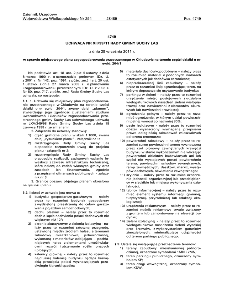 Dziennik Urzćdowy Województwa Wielkopolskiego Nr 294 – 28489 – Poz. 4749 4749 4 749 UCHWAŁA NR XII/99/11 RADY GMINY SUCHY LAS z dnia 29 wrzeċnia 2011 r. w sprawie miejscowego planu zagospodarowania przestrzennego w Chludowie na terenie części działki o nr ewid. 204/1 Na podstawie art. 18 ust. 2 pkt 5 ustawy z dnia 8 marca 1990 r. o samorządzie gminnym (Dz. U. z 2001 r. Nr 142, poz. 1591, z póżn. zm.) i art. 20 ust. 1 ustawy z dnia 27 marca 2003 r. o planowaniu i zagospodarowaniu przestrzennym (Dz. U. z 2003 r. Nr 80, poz. 717, z późn. zm.) Rada Gminy Suchy Las uchwala, co nastćpuje: § 1. 1. Uchwala sić miejscowy plan zagospodarowania przestrzennego w Chludowie na terenie czćċci działki o nr ewid. 204/1, zwany dalej „planem”, stwierdzając jego zgodnoċć z ustaleniami studium uwarunkowaĉ i kierunków zagospodarowania przestrzennego gminy Suchy Las uchwalonego uchwałą nr LXV/349/98 Rady Gminy Suchy Las z dnia 18 czerwca 1998 r. ze zmianami. 2. Załączniki do uchwały stanowią: 1) czćċć graficzna planu w skali 1:1000, zwana dalej „rysunkiem planu” - załącznik nr 1; 2) rozstrzygnićcie Rady Gminy Suchy Las o sposobie rozpatrzenia uwag do projektu planu - załącznik nr 2; 3) rozstrzygnićcie Rady Gminy Suchy Las o sposobie realizacji, zapisanych wplanie inwestycji z zakresu infrastruktury technicznej, które należą do zadaĉ własnych gminy oraz zasadach ich finansowania, zgodnie z przepisami ofinansach publicznych - załącznik nr 3. 3. Granice obszaru objćtego planem okreċlono na rysunku planu. § 2. Ilekroć w uchwale jest mowa o: 1) budynku gospodarczo-garażowym – należy przez to rozumieć budynek gospodarczy z wydzieloną przestrzenią do celów garażowania pojazdów samochodowych; 2) dachu płaskim – należy przez to rozumieć dach o kącie nachylenia połaci dachowych nie wićkszym niż 12º; 3) ekranie akustycznym z zielenią izolacyjną - należy przez to rozumieć sztuczną przegrodć, ustawioną mićdzy źródłem hałasu a terenami zabudowy mieszkaniowej jednorodzinnej, wykonaną z materiałów odbijająco – pochłaniających hałas z elementami umożliwiającymi rozwój i utrzymanie roċlin pnących i płożących; 4) kalenicy głównej - należy przez to rozumieć najdłuższą kalenicć budynku bćdąca krawćdzią przecićcia połaci wyznaczających przeciwległe kierunki spadku; 5) 6) 7) 8) 9) 10) 11) 12) 13) 14) materiale dachówkopodobnym – należy przez to rozumieć materiał o podobnych walorach estetycznych jak dachówka ceramiczna; nieprzekraczalnej linii zabudowy – należy przez to rozumieć linić ograniczającą teren, na którym dopuszcza sić usytuowanie budynku; parkingu w zieleni – należy przez to rozumieć urządzenie miejsc postojowych z udziałem wielogatunkowych nasadzeĉ zieleni wielopićtrowej oraz nawierzchni z elementów ażurowych lub nawierzchni trawiastej; ogrodzeniu pełnym – należy przez to rozumieć ogrodzenie, w którym udział powierzchni pełnej wynosi co najmniej 80%; pasie izolującym - należy przez to rozumieć obszar wyznaczony wymaganą przepisami prawa odległoċcią zabudowaĉ mieszkalnych od terenu cmentarza; powierzchni zabudowy – należy przez to rozumieć sumć powierzchni terenu wyznaczoną przez rzut pionowy zewnćtrznych krawćdzi budynku w stanie wykoĉczonym nie wliczając powierzchni obiektów budowlanych ani ich czćċci nie wystających ponad powierzchnić terenu, powierzchni schodów zewnćtrznych, ramp zewnćtrznych, daszków, markiz, wystćpów dachowych, oċwietlenia zewnćtrznego; szyldzie – należy przez to rozumieć oznaczenie jednostki organizacyjnej lub przedsićbiorcy w siedzibie lub miejscu wykonywania działalnoċci; tablicy informacyjnej – należy przez to rozumieć element systemu informacji gminnej, turystycznej, przyrodniczej lub edukacji ekologicznej; urządzeniu reklamowym – należy przez to rozumieć noċnik reklamowy trwale związany z gruntem lub zamontowany na elewacji budynku; zieleni izolacyjnej - należy przez to rozumieć wielogatunkowe nasadzenia zieleni wysokiej oraz krzewów, z wykorzystaniem gatunków zimozielonych, minimalizujące uciążliwoċci od terenu parkingu publicznego. § 3. Ustala sić nastćpujące przeznaczenie terenów: 1) tereny zabudowy mieszkaniowej jednorodzinnej, oznaczone symbolami 1MN i 2MN; 2) teren parkingu publicznego, oznaczony symbolem KP; 3) teren drogi wewnćtrznej, oznaczony symbolem KDW. Dziennik Urzćdowy Województwa Wielkopolskiego Nr 294 – 28490 – § 4. Ustala sić nastćpujące zasady ochrony i kształtowania ładu przestrzennego: 1) zakaz lokalizacji budynków w granicach działek budowlanych oraz w odległoċci 1,5m od tych granic; 2) zakaz wykonywania ogrodzeĉ pełnych od strony dróg; 3) zakaz lokalizowania urządzeĉ reklamowych; 4) nakaz lokalizacji zabudowy w obszarze ograniczonym przez ustalone nieprzekraczalne linie zabudowy; 5) dopuszczenie lokalizacji ogrodzeĉ o maksymalnej wysokoċci 1,8m; 6) dopuszczenie lokalizacji ogrodzeĉ pełnych, na terenie 1MN, od strony terenu KP; 7) dopuszczenie lokalizacji szyldów i tablic informacyjnych na terenach MN, o maksymalnej łącznej powierzchni nie przekraczającej 2m² na jednej działce budowlanej, umieszczanych na elewacji budynku na wysokoċci kondygnacji parteru lub na ogrodzeniu; 8) dopuszczenie lokalizacji maksymalnie dwóch wolnostojących tablic informacyjnych na terenie KP, o maksymalnej łącznej powierzchni - 6m². 3) 4) 5) 6) 7) 8) 9) 10) 11) § 5. Ustala sić nastćpujące zasady ochrony ċrodowiska, przyrody i krajobrazu kulturowego: 1) zakaz lokalizacji przedsićwzićć mogących zawsze znacząco oddziaływać na ċrodowisko oraz mogących potencjalnie znacząco oddziaływać na ċrodowisko z dopuszczeniem inwestycji celu publicznego, w rozumieniu przepisów odrćbnych; 2) nakaz zachowania, na terenach MN, dopuszczalnych poziomów hałasu wymaganych dla terenów zabudowy mieszkaniowej jednorodzinnej, zgodnie z przepisa