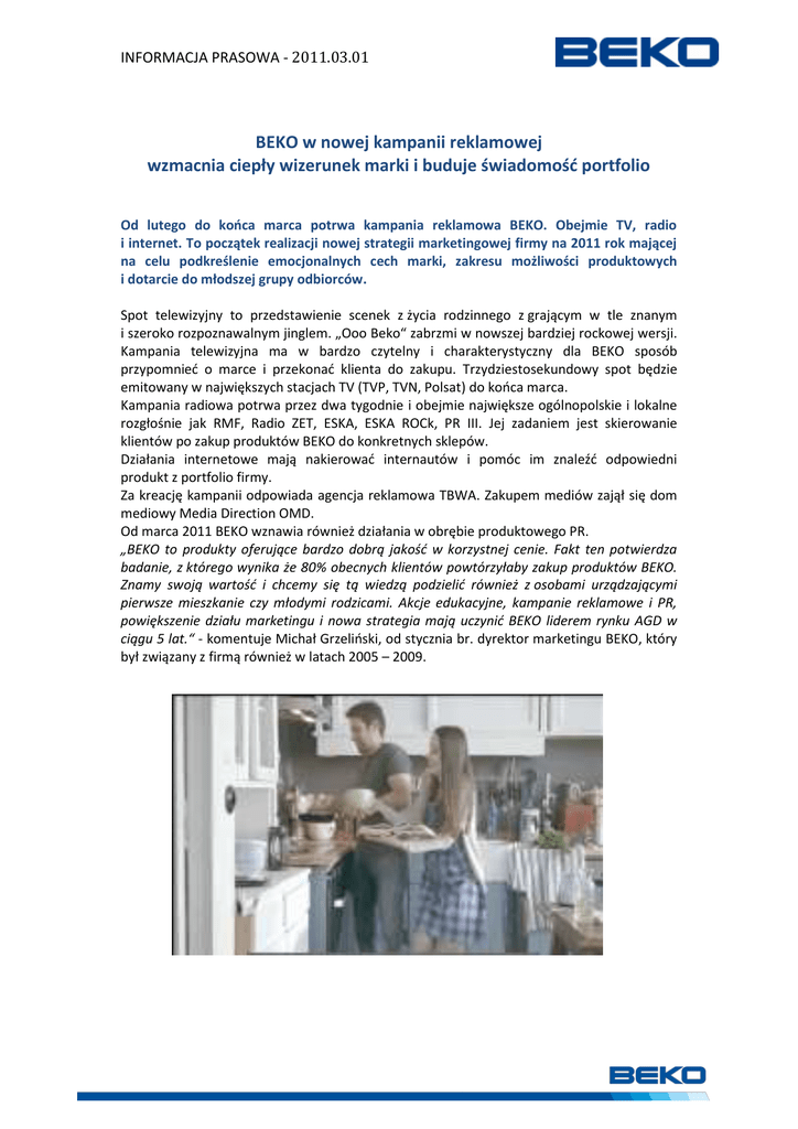 INFORMACJA PRASOWA - 2011.03.01 BEKO w nowej kampanii reklamowej wzmacnia ciepły wizerunek marki i buduje świadomośd portfolio Od lutego do kooca marca potrwa kampania reklamowa BEKO. Obejmie TV, radio i internet. To początek realizacji nowej strategii marketingowej firmy na 2011 rok mającej na celu podkreślenie emocjonalnych cech marki, zakresu możliwości produktowych i dotarcie do młodszej grupy odbiorców. Spot telewizyjny to przedstawienie scenek z życia rodzinnego z grającym w tle znanym i szeroko rozpoznawalnym jinglem. „Ooo Beko“ zabrzmi w nowszej bardziej rockowej wersji. Kampania telewizyjna ma w bardzo czytelny i charakterystyczny dla BEKO sposób przypomnied o marce i przekonad klienta do zakupu. Trzydziestosekundowy spot będzie emitowany w największych stacjach TV (TVP, TVN, Polsat) do kooca marca. Kampania radiowa potrwa przez dwa tygodnie i obejmie największe ogólnopolskie i lokalne rozgłośnie jak RMF, Radio ZET, ESKA, ESKA ROCk, PR III. Jej zadaniem jest skierowanie klientów po zakup produktów BEKO do konkretnych sklepów. Działania internetowe mają nakierowad internautów i pomóc im znaleźd odpowiedni produkt z portfolio firmy. Za kreację kampanii odpowiada agencja reklamowa TBWA. Zakupem mediów zajął się dom mediowy Media Direction OMD. Od marca 2011 BEKO wznawia również działania w obrębie produktowego PR. „BEKO to produkty oferujące bardzo dobrą jakośd w korzystnej cenie. Fakt ten potwierdza badanie, z którego wynika że 80% obecnych klientów powtórzyłaby zakup produktów BEKO. Znamy swoją wartośd i chcemy się tą wiedzą podzielid również z osobami urządzającymi pierwsze mieszkanie czy młodymi rodzicami. Akcje edukacyjne, kampanie reklamowe i PR, powiększenie działu marketingu i nowa strategia mają uczynid BEKO liderem rynku AGD w ciągu 5 lat.“ - komentuje Michał Grzelioski, od stycznia br. dyrektor marketingu BEKO, który był związany z firmą również w latach 2005 – 2009. INFORMACJA PRASOWA - 2011.03.01 BEKO to jedna z wiodących marek sprzętu AGD w Europie. Szacuje się, że na świecie co 2 sekundy sprzedawany jest jeden produkt tej marki. Urządzenia BEKO dostępne są w 101 krajach świata, m. in. w Wielkiej Brytanii, Francji, Hiszpanii, Niemczech i Rosji, a także Kongo. Beko S.A. istnieje w Polsce od 1998 roku, a od 2005 roku stało się centralą także dla biur w Czechach, na Węgrzech i Słowacji. Na polskim rynku BEKO oferuje szeroką gamę sprzętu AGD wolnostojącego oraz do zabudowy. Zgodnie z nową filozofią BEKO na każdy etap życia - BEKO for the new you, marka dąży do obecności ze swoimi produktami w przełomowych momentach życia klientów. Obecnie postrzegana jest jako synonim funkcjonalności, energooszczędności i światowych technologii w przystępnej cenie, na co dowodem jest przyznana dla BEKO przez konsumentów srebrna statuetka TRUSTED BRAND 2007 oraz nagroda "Produkt Roku 2007" kategorii Duże urządzenia AGD. W tym samym roku najszybsza pralka na świecie WMD 57122 BEKO zdobyła w europejskim konkursie prestiżową nagrodę "Plus X"; w kategorii Ekologia. Wszystkie urządzenia BEKO powstają z zachowaniem troski o środowisko naturalne i w zgodziez normą ISO 14001. Więcej informacji: www.beko.com.pl Kontakt dla prasy: Magda Zawada tel. +48 601 313 212 e-mail [email protected] Vesna Lorenc tel. +48 605 366 906 e-mail: [email protected]