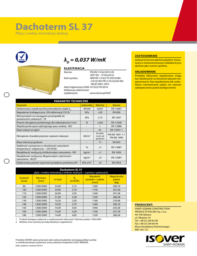 Dachoterm SL 37 Płyty z wełny mineralnej skalnej ZASTOSOWANIE λD = 0,037 W/mK Izolacja termiczna dachów płaskich. Stosowana w wielowarstwowym układzie krycia dachów jako warstw spodnia. KLASYFIKACJA Norma: PN-EN 13162:2013-05 (IDT. EN - 13162:2012) Kod wyrobu: MW-EN 13162-T5-DS(70,90)-CS(10/30)-TR7,5-PL(5)250-WS-WL(P)-MU1-AFr5 Atest higieniczny GUM:67/322/70/2016 Deklaracja właściwości użytkowych: www.isover.pl/DoP SKŁADOWANIE Produkty fabrycznie zapakowane mogą być składowane na otwartych placach magazynowych. Raz rozpakowana lub uszkodzona mechanicznie paleta nie stanowi zabezpieczenia przed zawilgoceniem. PARAMETRY TECHNICZNE Parametr Deklarowany współczynnik przewodzenia ciepła λD Naprężenie ściskające przy 10% deformacji CS(10) Wytrzymałość na rozciąganie prostopadłe do powierzchni czołowych - TR Poziom obciążenia punktowego dla odkształcenia 5 mm Współczynnik oporu dyfuzyjnego pary wodnej - MU Klasa reakcji na ogień Jednostka W/mK kPa Wartość 0,037 ≥30 Norma EN 12667 EN 826 kPa ≥7,5 EN 1607 N - ≥250 1 A1 EN 12430 EN 12086 EN 13501-1 kN/m3 W zależności od grubości PN-EN 1991-1-1 PN-EN 1990 - T5 EN 823 % ≤1 EN 12087 ≤1 EN 1609 ≤3 EN 12087 ≥5 EN 2953 Obciążenie charakterystyczne ciężarem własnym Klasa tolerancji grubości Stabilność wymiarowa w określonych warunkach temperatury i wilgotności – DS(70,90) Nasiąkliwość wodą przy krótkotrwałym zanurzeniu - WS Nasiąkliwość wodą przy długotrwałym częściowym zanurzeniu - WL(P) Deklarowany poziom oporności przepływu powietrza AFr kg/m2 kg/m 2 kPa s/m 3 Dachoterm SL 37 płyty z wełny mineralnej z włókien skalnych – wymiary i pakowanie Grubość [mm] Wymiary [mm] m2/pal. RD [m K/W] 80 100 110 120 130 140 150 160 180 1200/2000 1200/2000 1200/2000 1200/2000 1200/2000 1200/2000 1200/2000 1200/2000 1200/2000 33,60 24,00 24,00 21,60 19,20 19,20 14,40 14,40 14,40 2,15 2,70 2,95 3,20 3,50 3,75 4,05 4,30 4,85 2 Wysokość produkt + paleta [mm] 1260 1140 1240 1220 1180 1260 1040 1100 1220 1. Produkt dostępny wyłącznie w opakowaniach zbiorczych. Wymiary palety 1200x2000. 2. Możliwe inne wymiary po indywidualnym uzgodnieniu Produkty ISOVER wykorzystywane jako izolacja budynków pomagają zdobyć punkty w wielokryterialnych systemach oceny zielonych budynków LEED i BREEAM. Data wydania: wrzesień 2016 r. Waga brutto paleta [kg] 296,18 267,38 291,38 286,58 276,98 296,18 243,38 257,78 286,58 PRODUCENT: SAINT-GOBAIN CONSTRUCTION PRODUCTS POLSKA Sp. z o.o. 44-100 Gliwice ul. Okrężna 16 Tel. +48 32 339 63 00 Fax +48 32 339 64 44 Biuro Doradztwa Technicznego: 800 163 121