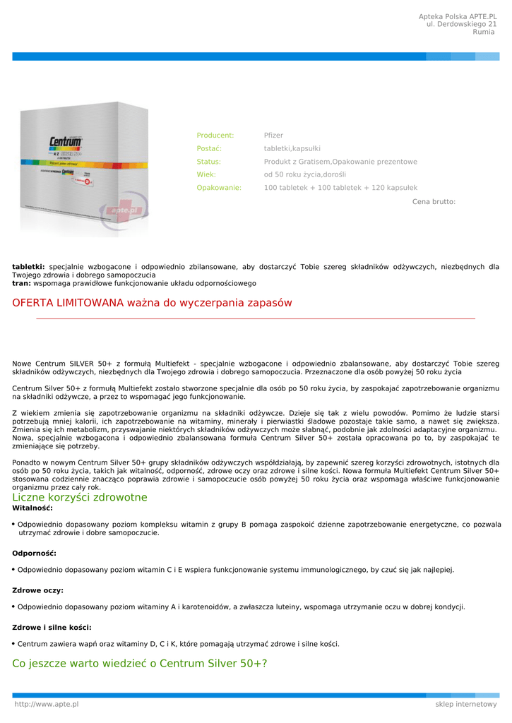 Apteka Polska APTE.PL ul. Derdowskiego 21 Rumia Producent: Pfizer Postać: tabletki,kapsułki Status: Produkt z Gratisem,Opakowanie prezentowe Wiek: od 50 roku życia,dorośli Opakowanie: 100 tabletek + 100 tabletek + 120 kapsułek Cena brutto: tabletki: specjalnie wzbogacone i odpowiednio zbilansowane, aby dostarczyć Tobie szereg składników odżywczych, niezbędnych dla Twojego zdrowia i dobrego samopoczucia tran: wspomaga prawidłowe funkcjonowanie układu odpornościowego OFERTA LIMITOWANA ważna do wyczerpania zapasów Nowe Centrum SILVER 50+ z formułą Multiefekt - specjalnie wzbogacone i odpowiednio zbalansowane, aby dostarczyć Tobie szereg składników odżywczych, niezbędnych dla Twojego zdrowia i dobrego samopoczucia. Przeznaczone dla osób powyżej 50 roku życia Centrum Silver 50+ z formułą Multiefekt zostało stworzone specjalnie dla osób po 50 roku życia, by zaspokajać zapotrzebowanie organizmu na składniki odżywcze, a przez to wspomagać jego funkcjonowanie. Z wiekiem zmienia się zapotrzebowanie organizmu na składniki odżywcze. Dzieje się tak z wielu powodów. Pomimo że ludzie starsi potrzebują mniej kalorii, ich zapotrzebowanie na witaminy, minerały i pierwiastki śladowe pozostaje takie samo, a nawet się zwiększa. Zmienia się ich metabolizm, przyswajanie niektórych składników odżywczych może słabnąć, podobnie jak zdolności adaptacyjne organizmu. Nowa, specjalnie wzbogacona i odpowiednio zbalansowana formuła Centrum Silver 50+ została opracowana po to, by zaspokajać te zmieniające się potrzeby. Ponadto w nowym Centrum Silver 50+ grupy składników odżywczych współdziałają, by zapewnić szereg korzyści zdrowotnych, istotnych dla osób po 50 roku życia, takich jak witalność, odporność, zdrowe oczy oraz zdrowe i silne kości. Nowa formuła Multiefekt Centrum Silver 50+ stosowana codziennie znacząco poprawia zdrowie i samopoczucie osób powyżej 50 roku życia oraz wspomaga właściwe funkcjonowanie organizmu przez cały rok. Liczne korzyści zdrowotne Witalność: Odpowiednio dopasowany poziom kompleksu witamin z grupy B pomaga zaspokoić dzienne zapotrzebowanie energetyczne, co pozwala utrzymać zdrowie i dobre samopoczucie. Odporność: Odpowiednio dopasowany poziom witamin C i E wspiera funkcjonowanie systemu immunologicznego, by czuć się jak najlepiej. Zdrowe oczy: Odpowiednio dopasowany poziom witaminy A i karotenoidów, a zwłaszcza luteiny, wspomaga utrzymanie oczu w dobrej kondycji. Zdrowe i silne kości: Centrum zawiera wapń oraz witaminy D, C i K, które pomagają utrzymać zdrowe i silne kości. Co jeszcze warto wiedzieć o Centrum Silver 50+? http://www.apte.pl sklep internetowy Apteka Polska APTE.PL ul. Derdowskiego 21 Rumia Centrum Silver 50+ jest kompletnym zestawem witamin i minerałów z luteiną, pomagającym w pełni cieszyć się życiem. może być zażywane przez osoby chore na cukrzycę nie zawiera sztucznych słodzików jest odpowiednie dla ludzi z nietolerancją glutenu Centrum SPECIAL TRAN x120 kapsułek Suplement diety wspomagający prawidłowe funkcjonowanie układu odpornościowego dla dorosłych i dzieci od 6 roku życia. Składniki olej z watroby dorsz (z ryby*), żelatyna, substancja utrzymująca wilgoć: E422, przeciwutleniacz: E306, woda. Właściwości składników Witamina A pomaga w utrzymaniu prawidłowego widzenia. Witamina D pomaga w utrzymaniu zdrowych kości. Kwasy tłuszczowe Omega3 (EPA i DHA) przyczyniają się do prawidłowego funkcjonowania serca. Korzystny efekt uzyskuje się przy dziennym spożyciu 250 mg EPA i DHA. Suplement diety Centrum Special Tran zaleca się w celu uzupełnienia codziennej diety w kwasy tłuszczowe Omega-3 (EPA i DHA) oraz witaminy A i D. Zalecane dzienne spożycie Dzieci powyżej 6 roku życia oraz dorośli 2 kapsułki dziennie. Przyjmować popijając wodą. http://www.apte.pl sklep internetowy