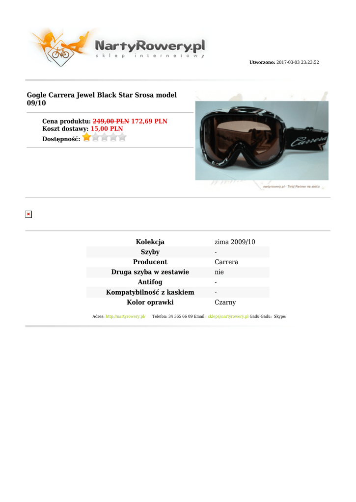 Utworzono: 2017-03-03 23:23:52 Gogle Carrera Jewel Black Star Srosa model 09/10 Cena produktu: 249,00 PLN 172,69 PLN Koszt dostawy: 15,00 PLN Dostępność: Kolekcja Szyby Producent Druga szyba w zestawie zima 2009/10 Carrera nie Antifog - Kompatybilność z kaskiem - Kolor oprawki Adres: http://nartyrowery.pl/ Czarny Telefon: 34 365 66 09 Email: [email protected] Gadu-Gadu: Skype: