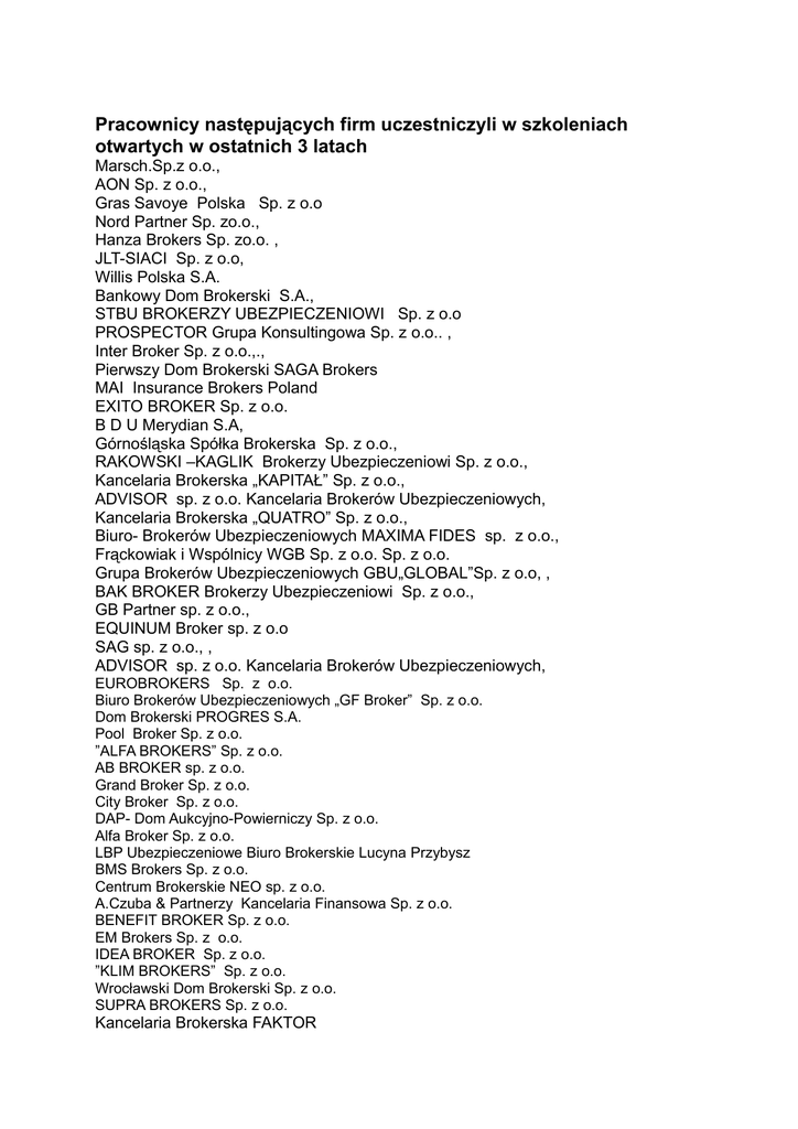 Pracownicy następujących firm uczestniczyli w szkoleniach otwartych w ostatnich 3 latach Marsch.Sp.z o.o., AON Sp. z o.o., Gras Savoye Polska Sp. z o.o Nord Partner Sp. zo.o., Hanza Brokers Sp. zo.o. , JLT-SIACI Sp. z o.o, Willis Polska S.A. Bankowy Dom Brokerski S.A., STBU BROKERZY UBEZPIECZENIOWI Sp. z o.o PROSPECTOR Grupa Konsultingowa Sp. z o.o.. , Inter Broker Sp. z o.o.,., Pierwszy Dom Brokerski SAGA Brokers MAI Insurance Brokers Poland EXITO BROKER Sp. z o.o. B D U Merydian S.A, Górnośląska Spółka Brokerska Sp. z o.o., RAKOWSKI –KAGLIK Brokerzy Ubezpieczeniowi Sp. z o.o., Kancelaria Brokerska „KAPITAŁ” Sp. z o.o., ADVISOR sp. z o.o. Kancelaria Brokerów Ubezpieczeniowych, Kancelaria Brokerska „QUATRO” Sp. z o.o., Biuro- Brokerów Ubezpieczeniowych MAXIMA FIDES sp. z o.o., Frąckowiak i Wspólnicy WGB Sp. z o.o. Sp. z o.o. Grupa Brokerów Ubezpieczeniowych GBU„GLOBAL”Sp. z o.o, , BAK BROKER Brokerzy Ubezpieczeniowi Sp. z o.o., GB Partner sp. z o.o., EQUINUM Broker sp. z o.o SAG sp. z o.o., , ADVISOR sp. z o.o. Kancelaria Brokerów Ubezpieczeniowych, EUROBROKERS Sp. z o.o. Biuro Brokerów Ubezpieczeniowych „GF Broker” Sp. z o.o. Dom Brokerski PROGRES S.A. Pool Broker Sp. z o.o. ”ALFA BROKERS” Sp. z o.o. AB BROKER sp. z o.o. Grand Broker Sp. z o.o. City Broker Sp. z o.o. DAP- Dom Aukcyjno-Powierniczy Sp. z o.o. Alfa Broker Sp. z o.o. LBP Ubezpieczeniowe Biuro Brokerskie Lucyna Przybysz BMS Brokers Sp. z o.o. Centrum Brokerskie NEO sp. z o.o. A.Czuba & Partnerzy Kancelaria Finansowa Sp. z o.o. BENEFIT BROKER Sp. z o.o. EM Brokers Sp. z o.o. IDEA BROKER Sp. z o.o. ”KLIM BROKERS” Sp. z o.o. Wrocławski Dom Brokerski Sp. z o.o. SUPRA BROKERS Sp. z o.o. Kancelaria Brokerska FAKTOR Biznes Serwis sp. z o.o. REGENT INSURANCE BROKERS ( Polska) Sp. z o.o. Majkowski Sp. z o.o. MEDBROKER Sp. z o.o. POL- Assistance Sp. z o.o. Miejska Agencja Ubezpieczeniowa „Secesja” Sp. z o.o. BROKERS UNION Sp. z o.o. Zachodni Dom Brokerski Sp. z o.o. Promesa Plus Sp. z o.o. Brokerski Dom Ubezpieczeniowy MERYDIAN S.A. VIC& Brokers Sp. z o.o. Towarzystwo Usług Ubezpieczeniowych i Obsługi Ryzyka „TUR” sp. z o.o. MUS Broker Sp. z o.o. Ubezpieczeniowy Dom Brokerski „M.A.K.” Sp. z o.o. PUHP „LOYD” sp. z o.o. GTG Sp. z o.o. Kancelaria Brokerska TASK Sp. z o.o OPTIMA Union Sp. z o.o. BROKER –IBL Sp.z o.o. Cyrul Dom Brokerski Sp z o.o. WAMA Brokerskie Biuro Ubezpieczeń Ogólnopolska Grupa Brokerska Sp. z o.o. DASHWOOD POLSKA BROKERS Sp.z o.o Kancelaria Brokerska Sawiko Sp. z o.o. P.W.S. KONSTANTA S.A. Adler Brokers Group Sp. z o.o. Polski Dom Brokerski Sp. z o.o : SPF Sp. z o.o. . BMK Broker Ubezpieczeniowy Sp. z o.o. Poszukiwania Naftowe „Diament” Sp. z o.o. WPBP NRZ „WROBIS” S.A. Gmina Wrocław Prochem S.A. KGHM Polska Miedź S.A. DAIMLERCHRYSLER Bank Polska S.A. PZU S.A. Towarzystwo Ubezpieczeń i Reasekuracji WARTA S.A. Towarzystwo Ubezpieczeń InterRisk S.A. Towarzystwo Ubezpieczeń Allianz Polska S.A. HDI ASEKURACJA Towarzystwo Ubezpieczeń S.A. SIGNAL - IDUNA Polska Towarzystwo Ubezpieczeń SA , Towarzystwo Ubezpieczeń INTER Polska S.A. Polskie Towarzystwo Ubezpieczeniowe S.A. HDI –Gerling Polska Towarzystwo Ubezpieczeń S.A. COMPENSA Towarzystwo Ubezpieczeń S.A. Vienna Insurance Group UNIQA TU SA ALLIANZ Polska Serwis Sp. z o.o. TUW SKOK, Towarzystwo Ubezpieczeń Wzajemnych „CUPRUM”, oraz pracownicy jedno osobowych firm brokerski, pośrednictwa lub spółek cywilnych