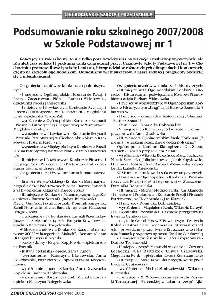 Podsumowanie roku szkolnego 2007/2008 w Szkole Podstawowej nr 1 Koƒczàcy si´ rok szkolny, to nie tylko pora oczekiwania na wakacje i zas∏u˝ony wypoczynek, ale równie˝ czas refleksji i podsumowania ca∏orocznej pracy. Uczniowie Szko∏y Podstawowej nr 1 w Ciechocinku promowali swojà szko∏´ i miasto, bioràc udzia∏ w ró˝norodnych olimpiadach i konkursach, cz´sto na szczeblu ogólnopolskim. OdnieÊliÊmy wiele sukcesów, a naszà radoÊcià pragniemy podzieliç si´ z mieszkaƒcami. Osiàgni´cia uczniów w konkursach polonistycznych: - I miejsce w Ogólnopolskim Konkursie Poezji i Prozy „ Zaczarowane Pióro” - Barbara WiÊniewska, opiekunka Iwona Janiszewska - I miejsce w I Powiatowym Konkursie Recytacji i Piosenki Patriotycznej w Ciechocinku - Magdalena Renk, opiekunka Teresa ˚ak - wyró˝nienie w Ogólnopolskim Konkursie Recytacji i Piosenki Patriotycznej i Legionowej w Warszawie Magdalena Renk j/w - wyró˝nienie w I Powiatowym Konkursie Recytacji i Piosenki Patriotycznej w Ciechocinku - Marcin Kaƒkowski i Justyna Feret - j/w - wyró˝nienie w Mi´dzyszkolnym Konkursie Poezji i PieÊni Patriotycznej we W∏oc∏awku - Marcin Kaƒkowski j/w - II miejsce w I Powiatowym Konkursie Piosenki i Recytacji Poezji Patriotycznej - Bartosz Szatanik - opiekunka Halina Andrzejewska Osiàgni´cia uczniów w konkursach matematycznych: - finalistà Wojewódzkiego Konkursu Matematycznego dla Szkó∏ Podstawowych zosta∏ Bartosz Szatanik z VI b - opiekun Katarzyna Dzi´gelewska - III miejsce w Konkursie Matematycznym Liga Zadaniowa - Bartosz Szatanik, Judyta Buczkowska, Maciej Gmiƒski, Jakub Florczak, Dominik Kurtysiak, Kamil Piotrowski, Micha∏ Baranik - opiekun Katarzyna Dzi´gelewska - wyró˝nienie w/w konkursie otrzymali Przemys∏aw Juszczak, Aleksander ¸yczak, Patrycja Kowalewska, opiekun Katarzyna Dzi´gelewska W Mi´dzynarodowym Konkursie, Kangur Matematyczny 2008” w kategoriach :Maluch”, „Beniamin” oraz „Kangurek” uzyskali wyniki : - bardzo dobry - Kacper Kopy∏owski - opiekun Anna Baranik - Justyna Stefaƒska - opiekun Ewa Luboƒ - wyró˝nienie - Katarzyna Ulaszewska, Anna Rzeczkowska, Piotr Pietrzak - opiekun Iwona Krzysztanowicz - wyró˝nienie - Joanna Sikorska, Anna Drzewucka - opiekun Barbara Kaƒkowska - wyró˝nienie - Bartosz Szatanik, Micha∏ Baranik opiekun Katarzyna Dzi´gelewska ZDRÓJ CIECHOCI¡SKI czerwiec 2008 Osiàgni´cia uczniów w konkursach historycznych: - III miejsce w IX Ogólnopolskim Konkursie Literacko - Historycznym poÊwi´conym Józefowi Pi∏sudskiemu zaj´∏a Barbara WiÊniewska - I miejsce w województwie w Ogólnopolskim Konkursie Historycznym „Kràg” zajà∏ Bartosz Szatanik; 8 laureatów - II miejsce w olimpiadzie historycznej „Olimpus” - Bartosz Szatanik - IV miejsce - Dominika Dobrosielska - V miejsce - Jan Klamecki ; 15 laureatów .Uczniów przygotowa∏a Anna Gradowska - III miejsce w Ogólnopolskim finale Konkursu „Z pieÊnià i wierszem przez dzieje or´˝a polskiego” Ogólnopolski Konkurs Ekologiczny „Dla Ziemi, dla siebie, zostaƒ przyjacielem Ziemi” - wyró˝nienie- Wiktoria Kuszyƒska, Marta Sochacka, Natalia Sarniecka, Julia Jankowska, Jakub Kopy∏owski, Dominika Dobrosielska, Barbara WiÊniewska - opiekunka Izabella Dziekoƒska W SP nr 1 nie brakowa∏o sukcesów artystycznych. - II miejsce w Ogólnopolskim Konkursie Piosenki i Recytacji Poezji i PieÊni Legionowej w Warszawie Dominika Dobrosielska - III miejsce - Micha∏ Modrzejewski, Jan Klamecki - I miejsce w I Powiatowym Konkursie Poezji i Piosenki Patriotycznej w Ciechocinku - Jan Klamecki - II miejsce - Dominika Dobrosielska - wyró˝nienie - Magdalena Renk, Wiktoria Kuszyƒska, Dominika Czerwiƒska .Uczniów przygotowa∏a Ewelina Centkowska. - nagrod´ Grand Prix w V Powiatowym Festiwalu Kol´d i Pastora∏ek w Ciechocinku otrzyma∏ zespó∏ Ajki - prowadzony przez Iwon´ Krzysztanowicz i Bartosz Szatanik przygotowany przez Ewelin´ Centkowskà - I miejsce w/w festiwalu - Daria Trojanowska Dariusz Trojanowski - II miejsce - zespó∏ Mamrotki w sk∏adzie : Zuzanna ¸ochocka, Julia Bartoszek, Oliwia Grabowska, Magdalena Renk - opiekunka Iwona Krzysztanowicz - III miejsce - Kasia Kowalska przygotowana przez Ewelin´ Centkowskà - wyró˝nienie - Micha∏ Modrzejewski i Wiktoria Kuszyƒska - I miejsce w XI Wojewódzkim Festiwalu Piosenki Turystycznej i Harcerskiej w Lubaniu - zespó∏ Ajki 16 - wyró˝nienie - Magdalena Renk - II miejsce w II Powiatowym Konkursie Piosenki Ludowej w Racià˝ku - Mamrotki - I miejsce w V Wojewódzkich Spotkaniach z Piosenkà Musicalowà i Filmowà „Szlagier 2008” w Bydgoszczy - Ajki - I miejsce w VIII Mi´dzyszkolnym Konkursie Poezji i PieÊni Patriotycznej we W∏oc∏awku - Ajki - II miejsce - Dominika Dobrosielska - I miejsce w X Konkursie M∏odych Talentów „Zostaƒ gwiazdà” - zespól Ajki - wyró˝nienia: Dominika Czerwiƒska, Dominika Dobrosielska, Wiktoria Kuszyƒska Opiekunkà wy˝ej wymienionych zespo∏ów i uczniów jest Iwona Krzysztanowicz - wyró˝nienie w I Gminnym Festiwalu Piosenki Dzieci´cej i M∏odzie˝owej „UÊmiech Dziecka” Dobre 2008 - Katarzyna Kowalska - opiekunka Ewelina Centkowska. - III miejsce w V Powiatowym Przeglàdzie Zespo∏ów Tanecznych w Bàdkowie zespó∏ Solinki, opiekunka Mirella Ko∏aczkowska - II miejsce w III Powiatowym Festiwalu Teatralnym Bajek i Legend w Wo∏uszewie - zespó∏ ZAG - wyró˝nienie w/w - Martyna Centkowska z zespo∏u „Skrzat”- opiekun Anna Gajewska Osiàgni´cia uczniów w konkursach plastycznych: - I miejsce w XVII Wojewódzkim Konkursie Plastycznym dla Dzieci „Gdybym by∏ malarzem” - Tymoteusz Kasprzak - wyró˝nienie - Daria Trojanowska - wyró˝nienie w Wojewódzkim Konkursie Plastycznym „OpowieÊci starego ogrodu” - Wiktoria Suczkow - wyró˝nienie pracy w wystawie pokonkursowej Katarzyna Krzemiƒska - wyró˝nienie w Wojewódzkim Plenerze Malarskim w Bobrownikach - Anna Drzewucka - I miejce w Powi