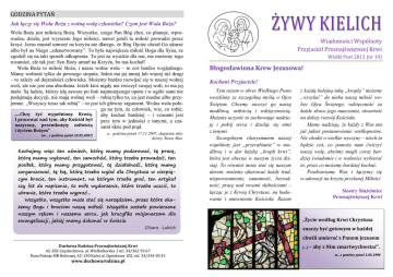 ŻYWY KIELICH GODZINA PYTAŃ Jak łączy się Wola Boża z wolną wolą człowieka? Czym jest Wola Boża? Wola Boża jest miłością Bożą. Wszystko, czego Pan Bóg chce, co planuje, wprowadza, działa, jest wyrazem Jego miłości, nawet jeżeli ta miłość prowadzi przez krzyż. Jezus musiał umrzeć na krzyżu nie dlatego, że Bóg Ojciec chciał Go ukarać albo był na Niego „zdenerwowany”. To była największa miłość Boga dla Syna, że zgodził się na taki sposób odkupienia. To jest za wysokie dla nas, nie możemy tego rozumieć, ale tak jest: Syn Boży umarł na Krzyżu, bo nas kochał! Wola Boża to miłość Boża, i nasza wolna wola – to coś bardzo względnego. Mamy wolność tylko do pewnego stopnia. Jeden ma jej mniej lub więcej niż drugi – to zależy od dojrzałości człowieka. Możemy bardzo rozwijać się w naszej wolnej woli, ale nie jest ona absolutna. Jeżeli ktoś nigdy nie ćwiczył swojej woli, to ma jej mało. Są ludzie, którzy idą zawsze po linii najmniejszego oporu i w ogóle sami nie podejmują decyzji, nie mają wolnej woli – robią tylko to, co jest modne albo przyjemne. „Wszyscy teraz tak robią” – to jest ich główny argument. Wolna wola polega na tym, że człowiek, wie, co robić, „...Chcę żyć wypełniony Krwią. aby kochać bardziej – i czasami jest I pracować nad tym, aby Kościół był przy tym w jedności z innymi, a czanasycony, przeniknięty miłością sami idzie pod prąd. i życiem Bożym” w., godzina pytań 17.11.2007, skupienie młodzieży, Rawa Maz. (w. , z godziny pytań 19.05.2007) Kochajmy więc ten uśmiech, który mamy podarować, tę pracę, którą mamy wykonać, ten samochód, który trzeba prowadzić, ten posiłek, który mamy przygotować, tę działalność, którą mamy zorganizować, tę łzę, którą trzeba wylać dla Chrystusa w cierpiącym bracie, ten instrument, na którym trzeba grać, ten artykuł czy list do napisania, to miłe wydarzenie, które trzeba uczcić, to ubranie, które trzeba wyprać... Wszystko, wszystko może stać się narzędziem, przez które okażemy Bogu i braciom naszą miłość. Wszystko zostało powierzone naszym rękom i naszemu sercu, jak krucyfiks misjonarzom dla ewangelizacji, jakiej mamy dokonać w świecie. Chiara Lubich Wiadomości Wspólnoty Przyjaciół Przenajświętszej Krwi Wielki Post 2013 (nr 10) Błogosławiona Krew Jezusowa! Kochani Przyjaciele! Tym razem w okres Wielkiego Postu weszliśmy ze szczególną myślą o Ojcu Świętym. Chcemy otoczyć go naszą modlitwą, miłością i wdzięcznością. Możemy uczynić to zachowując nadzieję i pokój serca i dzieląc się nimi z innymi. Szczególnym charyzmatem naszej wspólnoty jest „przerabianie” w modlitwę i w dar każdej „kropli krwi”, która jest obecna w naszym życiu dzisiaj. To również może stać się naszym darem: możemy ofiarować każdy trud, nieporozumienie, samotność, bezradność, pracę nad swoimi słabościami – łącząc je z Krwią Chrystusa, na budowanie i umocnienie Kościoła. Razem z każdą kolejną taką „kroplą” możemy „wysyłać” do nieba naszą miłość wobec Ojca Świętego, wdzięczność za każde słowo jego nauczania, otwartość na dalszy rozwój Kościoła. Mamy nadzieję, że każdy z Was ma już jakieś postanowienie wielkopostne. Nie chodzi o wielkie wyczyny – niech to będzie coś, co pomoże nam ćwiczyć naszą wolę, abyśmy mogli coraz bardziej świadomie i w wolności wybierać to, przez co możemy bardziej kochać. Pozdrawiamy Was i łączymy się w adoracji na krzyżu przelanej Miłości Siostry Służebnice Przenajświętszej Krwi „Życie według Krwi Chrystusa znaczy być gotowym w każdej chwili umierać z Panem Jezusem Duchowa Rodzina Przenajświętszej Krwi 42‐202 Częstochowa, ul. Wielkoborska 1 tel. 34/362 93 67 Dom Pokoju MB Bolesnej, 42‐130 Kalej ul. Ogrodowa 102, tel. 34/344 05 41 www.duchowarodzina.pl (...) – aby z Nim zmartwychwstać”. w., z godziny pytań 1.05.1996 HOMILIA Mocni w prześladowaniach Drodzy Bracia i Siostry, jak zwykle nie wybrałem tego fragmentu – kieruję się tym, co akurat podaje kalendarz liturgiczny. Ale na Mszy świętej wotywnej o Krwi Chrystusa akurat ten fragment, który przedstawia prześladowanie chrześcijan (Mt 10, 16-23), jest bardzo trafny. Przecież Krew Chrystusa to jest nie miły temat. Krew zawsze przypomina o ranach, o boleści, a nawet o śmierci. Krew to życie! Krew Zmartwychwstałego to cała nasza siła i nadzieja, ale musimy ciągle na nowo przechodzić przez otwarte rany do ran Zmartwychwstałego. I prześladowanie jest dla chrześcijanina czymś normalnym. Trzeba to nieraz powiedzieć sobie samemu i sobie nawzajem, aby nie zapomnieć. To też należy do Dobrej Nowiny. Dobra Nowina, Ewangelia to nie zbiór tematów, aby dobrze się czuć, aby być „happy”. Dobra Nowina jest podsumowaniem prawdy o zbawieniu, odkupieniu, i akurat na tym miejscu, gdzie czcimy w szczególny sposób koronę cierniową, gdzie jest czczona Krew Zbawiciela, chcemy pamiętać o tym, że udział w zbawieniu, udział w odkupieniu wymaga też gotowości, aby razem z Chrystusem być nierozumianym, nieakceptowanym, niechwalonym, jeszcze gorzej – odrzuconym, prześladowanym, a czasami nawet zabitym. To jest podstawową prawdą dla każdego wierzącego i nie przekazywalibyśmy autentycznej wiary i nabożeństwa do Krwi Chrystusa, jeżeli nie mówilibyśmy o tym. Owszem, kto w pełni ufa Krwi Chrystusa, doświadcza tej uzdrawiającej, wyzwalającej mocy. Ale trzeba tę dobrą nowinę przyjąć w całości i do niej należy też gotowość na prześladowanie. Niestety, jeżeli powstają kłopoty, to ludzie ochrzczeni, którzy niby chcą pójść za Chrystusem, nieraz tchórzą, kryją wiarę albo udają, że są neutralni albo myślą, że świat się wali, że coś niewłaściwego się dzieje. Ale tak nie jest! Słuchamy się jeszcze raz dzisiejszej Ewangelii: Oto Ja was posyłam jak 