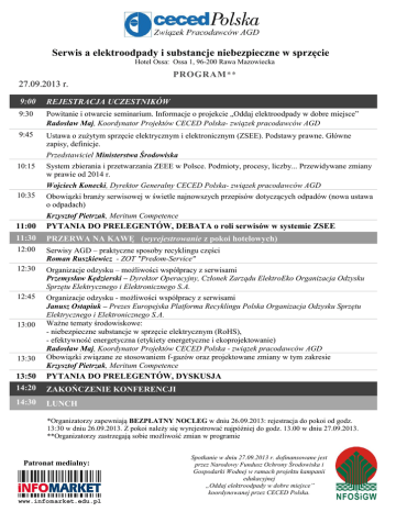 Serwis a elektroodpady i substancje niebezpieczne w sprzęcie Hotel Ossa: Ossa 1, 96-200 Rawa Mazowiecka PROGRAM ** 27.09.2013 r. 9:00 REJESTRACJA UCZESTNIKÓW 9:30 Powitanie i otwarcie seminarium. Informacje o projekcie „Oddaj elektroodpady w dobre miejsce” Radosław Maj, Koordynator Projektów CECED Polska- związek pracodawców AGD 9:45 Ustawa o zużytym sprzęcie elektrycznym i elektronicznym (ZSEE). Podstawy prawne. Główne zapisy, definicje. Przedstawiciel Ministerstwa Środowiska 10:15 System zbierania i przetwarzania ZEEE w Polsce. Podmioty, procesy, liczby... Przewidywane zmiany w prawie od 2014 r. Wojciech Konecki, Dyrektor Generalny CECED Polska- związek pracodawców AGD 10:35 Obowiązki branży serwisowej w świetle najnowszych przepisów dotyczących odpadów (nowa ustawa o odpadach) Krzysztof Pietrzak, Meritum Competence 11:00 PYTANIA DO PRELEGENTÓW, DEBATA o roli serwisów w systemie ZSEE 11:30 PRZERWA NA KAWĘ (wyrejestrowanie z pokoi hotelowych) 12:00 Serwisy AGD – praktyczne sposoby recyklingu części Roman Ruszkiewicz - ZOT "Predom-Service" 12:30 Organizacje odzysku – możliwości współpracy z serwisami Przemysław Kędzierski – Dyrektor Operacyjny, Członek Zarządu ElektroEko Organizacja Odzysku Sprzętu Elektrycznego i Elektronicznego S.A. 12:45 Organizacje odzysku - możliwości współpracy z serwisami Janusz Ostapiuk – Prezes Europejska Platforma Recyklingu Polska Organizacja Odzysku Sprzętu Elektrycznego i Elektronicznego S.A. Ważne tematy środowiskowe: - niebezpieczne substancje w sprzęcie elektrycznym (RoHS), - efektywność energetyczna (etykiety energetyczne i ekoprojektowanie) Radosław Maj, Koordynator Projektów CECED Polska - związek pracodawców AGD Obowiązki związane ze stosowaniem f-gazów oraz projektowane zmiany w tym zakresie Krzysztof Pietrzak, Meritum Competence 13:00 13:30 13:50 14:20 PYTANIA DO PRELEGENTÓW, DYSKUSJA 14:30 LUNCH ZAKOŃCZENIE KONFERENCJI *Organizatorzy zapewniają BEZPŁATNY NOCLEG w dniu 26.09.2013: rejestracja do pokoi od godz. 13:30 w dniu 26.09.2013. Z pokoi należy się wyrejestrować najpóźniej do godz. 13.00 w dniu 27.09.2013. **Organizatorzy zastrzegają sobie możliwość zmian w programie Patronat medialny: Spotkanie w dniu 27.09.2013 r. dofinansowane jest przez Narodowy Fundusz Ochrony Środowiska i Gospodarki Wodnej w ramach projektu kampanii edukacyjnej „Oddaj elektroodpady w dobre miejsce” koordynowanej przez CECED Polska.