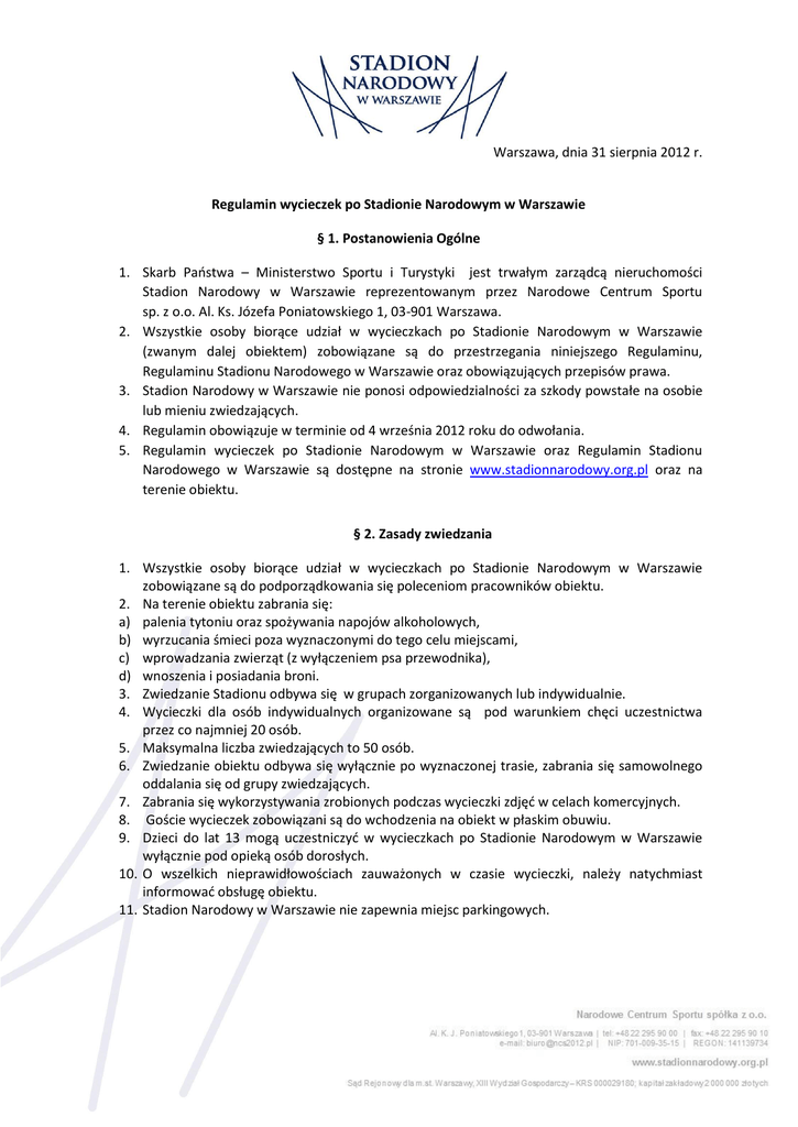 Warszawa, dnia 31 sierpnia 2012 r. Regulamin wycieczek po Stadionie Narodowym w Warszawie § 1. Postanowienia Ogólne 1. Skarb Państwa – Ministerstwo Sportu i Turystyki jest trwałym zarządcą nieruchomości Stadion Narodowy w Warszawie reprezentowanym przez Narodowe Centrum Sportu sp. z o.o. Al. Ks. Józefa Poniatowskiego 1, 03-901 Warszawa. 2. Wszystkie osoby biorące udział w wycieczkach po Stadionie Narodowym w Warszawie (zwanym dalej obiektem) zobowiązane są do przestrzegania niniejszego Regulaminu, Regulaminu Stadionu Narodowego w Warszawie oraz obowiązujących przepisów prawa. 3. Stadion Narodowy w Warszawie nie ponosi odpowiedzialności za szkody powstałe na osobie lub mieniu zwiedzających. 4. Regulamin obowiązuje w terminie od 4 września 2012 roku do odwołania. 5. Regulamin wycieczek po Stadionie Narodowym w Warszawie oraz Regulamin Stadionu Narodowego w Warszawie są dostępne na stronie www.stadionnarodowy.org.pl oraz na terenie obiektu. § 2. Zasady zwiedzania 1. Wszystkie osoby biorące udział w wycieczkach po Stadionie Narodowym w Warszawie zobowiązane są do podporządkowania się poleceniom pracowników obiektu. 2. Na terenie obiektu zabrania się: a) palenia tytoniu oraz spożywania napojów alkoholowych, b) wyrzucania śmieci poza wyznaczonymi do tego celu miejscami, c) wprowadzania zwierząt (z wyłączeniem psa przewodnika), d) wnoszenia i posiadania broni. 3. Zwiedzanie Stadionu odbywa się w grupach zorganizowanych lub indywidualnie. 4. Wycieczki dla osób indywidualnych organizowane są pod warunkiem chęci uczestnictwa przez co najmniej 20 osób. 5. Maksymalna liczba zwiedzających to 50 osób. 6. Zwiedzanie obiektu odbywa się wyłącznie po wyznaczonej trasie, zabrania się samowolnego oddalania się od grupy zwiedzających. 7. Zabrania się wykorzystywania zrobionych podczas wycieczki zdjęć w celach komercyjnych. 8. Goście wycieczek zobowiązani są do wchodzenia na obiekt w płaskim obuwiu. 9. Dzieci do lat 13 mogą uczestniczyć w wycieczkach po Stadionie Narodowym w Warszawie wyłącznie pod opieką osób dorosłych. 10. O wszelkich nieprawidłowościach zauważonych w czasie wycieczki, należy natychmiast informować obsługę obiektu. 11. Stadion Narodowy w Warszawie nie zapewnia miejsc parkingowych. § 3. Dostępność Stadionu 1. Stadion jest dostępny dla zwiedzających od wtorku do niedzieli w godzinach 10.00 - 18.00 z wyłączeniem wybranych dni wolnych od pracy. Wycieczki po Stadionie Narodowym w Warszawie nie będą organizowane w dni imprez masowych oraz w dni techniczne, w których obiekt będzie przygotowywany pod kątem imprez masowych. 2. Wycieczki odbywają się co godzinę, od godziny 10 do godziny 18. 3. Godziny 10.00, 12.00, 14.00, 16.00, 18.00 przeznaczone są dla osób indywidualnych, godziny 11.00, 13.00, 15.00, 17.00 przeznaczone są dla grup zorganizowanych. 4. Terminy oraz godziny zwiedzania mogą ulec zmianie. § 4. Zapisy 1. Zapisy na wycieczki oraz wszelkie zmiany terminów lub godzin zwiedzania odbywają się drogą elektroniczną , pod adresem: [email protected], lub telefoniczne pod numerem 22 295 95 95 2. Nie przyjmowane są rezerwacje dla klientów indywidualnych. 3. Rezerwacja jest możliwa pod warunkiem dostępności wolnych miejsc, kolejność zgłoszeń jest w tej kwestii decydująca. § 5. Odmowa wstępu 1. W trakcie wycieczki zabrania się robienia i wykorzystywania zdjęć w celach komercyjnych. Zdjęcia na użytek własny są dozwolone. 2. Organizator może odmówić wstępu na obiekt osobom: a) znajdującym się pod widocznym wpływem alkoholu, środków odurzających, psychotropowych lub innych podobnie działających środków, b) posiadającym broń lub inne przedmioty, materiały, wyroby, napoje, środki lub substancje, które mogą zagrażać bezpieczeństwu pozostałych uczestników i pracowników Stadionu Narodowego w Warszawie, c) zachowującym się agresywnie, prowokacyjnie albo w inny sposób stwarzającym zagrożenie bezpieczeństwa lub porządku wydarzenia, d) posiadającym inne niebezpieczne przedmioty. e) nieprzestrzegającym zasad Regulaminu. 3. Na terenie obiektu zabrania się: a) palenia tytoniu oraz spożywania napojów alkoholowych, b) wyrzucania śmieci poza wyznaczonymi do tego celu miejscami, c) wprowadzania zwierząt (z wyłączeniem psa przewodnika), d) wnoszenia i posiadania broni. 4. Osoby niepełnosprawne prosimy o kontakt z Koordynatorem ds. wycieczek w celu ustalenia terminu oraz trasy zwiedzania. 5. O wszelkich nieprawidłowościach zauważonych w czasie wycieczki, należy natychmiast informować obsługę obiektu. 6. Odwiedzający zobowiązani są do wykonywania poleceń wydawanych przez pracowników obiektu również w sprawach nieobjętych niniejszym regulaminem.