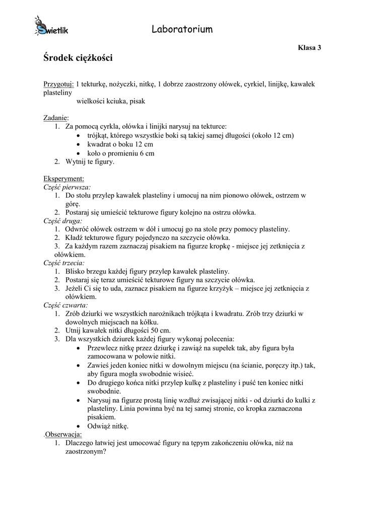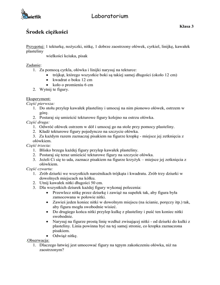 Laboratorium Klasa 3 Środek ciężkości Przygotuj: 1 tekturkę, nożyczki, nitkę, 1 dobrze zaostrzony ołówek, cyrkiel, linijkę, kawałek plasteliny wielkości kciuka, pisak Zadanie: 1. Za pomocą cyrkla, ołówka i linijki narysuj na tekturce: trójkąt, którego wszystkie boki są takiej samej długości (około 12 cm) kwadrat o boku 12 cm koło o promieniu 6 cm 2. Wytnij te figury. Eksperyment: Część pierwsza: 1. Do stołu przylep kawałek plasteliny i umocuj na nim pionowo ołówek, ostrzem w górę. 2. Postaraj się umieścić tekturowe figury kolejno na ostrzu ołówka. Część druga: 1. Odwróć ołówek ostrzem w dół i umocuj go na stole przy pomocy plasteliny. 2. Kładź tekturowe figury pojedynczo na szczycie ołówka. 3. Za każdym razem zaznaczaj pisakiem na figurze kropkę - miejsce jej zetknięcia z ołówkiem. Część trzecia: 1. Blisko brzegu każdej figury przylep kawałek plasteliny. 2. Postaraj się teraz umieścić tekturowe figury na szczycie ołówka. 3. Jeżeli Ci się to uda, zaznacz pisakiem na figurze krzyżyk – miejsce jej zetknięcia z ołówkiem. Część czwarta: 1. Zrób dziurki we wszystkich narożnikach trójkąta i kwadratu. Zrób trzy dziurki w dowolnych miejscach na kółku. 2. Utnij kawałek nitki długości 50 cm. 3. Dla wszystkich dziurek każdej figury wykonaj polecenia: Przewlecz nitkę przez dziurkę i zawiąż na supełek tak, aby figura była zamocowana w połowie nitki. Zawieś jeden koniec nitki w dowolnym miejscu (na ścianie, poręczy itp.) tak, aby figura mogła swobodnie wisieć. Do drugiego końca nitki przylep kulkę z plasteliny i puść ten koniec nitki swobodnie. Narysuj na figurze prostą linię wzdłuż zwisającej nitki - od dziurki do kulki z plasteliny. Linia powinna być na tej samej stronie, co kropka zaznaczona pisakiem. Odwiąż nitkę. .Obserwacja: 1. Dlaczego łatwiej jest umocować figury na tępym zakończeniu ołówka, niż na zaostrzonym? Laboratorium 2. Dlaczego punkty podparcia figur w drugiej i trzeciej części doświadczenia (czyli kropki i krzyżyki) nie znajdują się w tym samym miejscu? 3. W którym miejscu przecinają się wszystkie narysowane przez Ciebie linie na jednej figurze? 4. Jak daleko znajduje się to przecięcie od kropki zaznaczanej przez Ciebie w pierwszej części doświadczenia? 5. Czy punkty przecięcia są jakimiś szczególnymi punktami badanych przez Ciebie figur? Komentarz: Wszystkie linie poprowadzone pionowo w dół z punktów zawieszenia dowolnej figury (dziurek) powinny przeciąć się w jednym punkcie, zwanym środkiem ciężkości figury. Jeżeli podeprzemy ciało dokładnie w tym punkcie, to nie będzie ono przekręcało się na żadną stronę, a więc będzie w równowadze. W figurach takich jak kwadrat, trójkąt równoboczny, czy koło, środek ciężkości pokrywa się dokładnie ze środkiem geometrycznym figury. Środek ciężkości jest bardzo ważny np. w transporcie. Jeżeli środek ciężkości wypełnionego towarami lub bagażami pojazdu znajduje się daleko od jego środka geometrycznego, to pojazd ten może się wywrócić na zakręcie. Jeżeli środek ciężkości statku nie będzie się znajdował blisko jego środka geometrycznego, to statek łatwo może zatonąć. Dlatego bagaż w pojazdach, statkach czy samolotach musi być rozłożony równomiernie. Człowiek naturalnie utrzymuje swoje ciało w równowadze, dzięki zmysłowi równowagi. Kontroluje on zmiany ułożenia Twojego ciała oraz położenie dodatkowych ciężarów, które na sobie zawieszasz. Natychmiast wysyła do mózgu sygnał, dzięki któremu całe ciało dostosowuje się do nowej sytuacji. Ułożenie ciała musi się tak zmienić, aby z powrotem środek ciężkości pokrył się ze środkiem geometrycznym.