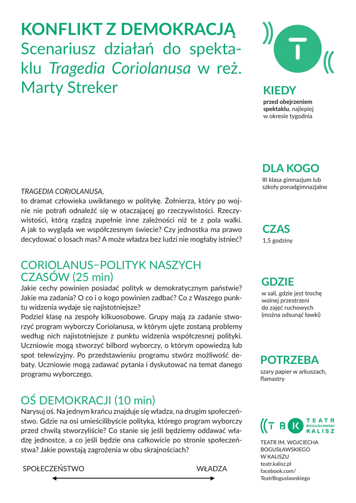 KONFLIKT Z DEMOKRACJĄ Scenariusz działań do spektaklu Tragedia Coriolanusa w reż. Marty Streker KIEDY przed obejrzeniem spektaklu, najlepiej w okresie tygodnia DLA KOGO TRAGEDIA CORIOLANUSA, to dramat człowieka uwikłanego w politykę. Żołnierza, który po wojnie nie potrafi odnaleźć się w otaczającej go rzeczywistości. Rzeczywistości, którą rządzą zupełnie inne zależności niż te z pola walki. A jak to wygląda we współczesnym świecie? Czy jednostka ma prawo decydować o losach mas? A może władza bez ludzi nie mogłaby istnieć? CORIOLANUS–POLITYK NASZYCH CZASÓW (25 min) Jakie cechy powinien posiadać polityk w demokratycznym państwie? Jakie ma zadania? O co i o kogo powinien zadbać? Co z Waszego punktu widzenia wydaje się najistotniejsze? Podziel klasę na zespoły kilkuosobowe. Grupy mają za zadanie stworzyć program wyborczy Coriolanusa, w którym ujęte zostaną problemy według nich najistotniejsze z punktu widzenia współczesnej polityki. Uczniowie mogą stworzyć bilbord wyborczy, o którym opowiedzą lub spot telewizyjny. Po przedstawieniu programu stwórz możliwość debaty. Uczniowie mogą zadawać pytania i dyskutować na temat danego programu wyborczego. III klasa gimnazjum lub szkoły ponadgimnazjalne CZAS 1,5 godziny GDZIE w sali, gdzie jest trochę wolnej przestrzeni do zajęć ruchowych (można odsunąć ławki) POTRZEBA szary papier w arkuszach, flamastry OŚ DEMOKRACJI (10 min) Narysuj oś. Na jednym krańcu znajduje się władza, na drugim społeczeństwo. Gdzie na osi umieścilibyście polityka, którego program wyborczy przed chwilą stworzyliście? Co stanie się jeśli będziemy oddawać władzę jednostce, a co jeśli będzie ona całkowicie po stronie społeczeństwa? Jakie powstają zagrożenia w obu skrajnościach? SPOŁECZEŃSTWO WŁADZA TEATR IM. WOJCIECHA BOGUSŁAWSKIEGO W KALISZU teatr.kalisz.pl facebook.com/ TeatrBoguslawskiego PSYCHOLOGIA TŁUMU (15 min) Pokaż uczniom kilka obrazów Pietera Bruegla: - „Przysłowia niderlandzkie” (https://www.google.com/culturalinstitute/beta/asset/the-dutch-proverbs/WwG8mD89xbELbQ?hl=pl) - „Wino w Dniu Świętego Marcina” (https://pl.wikipedia.org/wiki/Wino_w_Dniu_%C5%9Awi%C4%99tego_Marcina#/media/File:Brueghel_ The_Wine_Of_Saint_Martins_Day_Private_Collection_Madrid.jpg) - „Walka karnawału z postem” (https://www.google.com/culturalinstitute/beta/asset/the-fight-between-carnival-and-lent/ZwEty4gd9uLrUA?hl=pl) Co myślicie patrząc na te obrazy? W jaki sposób przedstawieni są ludzie na tych obrazach? Czy przypominasz sobie w jaki sposób tłum był traktowany w utworze Szekspira? Jaką moc ma tłum? Czy można nim manipulować? Czy przychodzą Wam do głowy jakieś sytuacje, w których tłum odegrał znaczącą rolę? INSTALACJE (15 min) Uczniowie losują w grupach cytaty, które odnoszą się kontekstowo do wcześniejszych rozważań. (Załącznik nr 1). Stwórzcie instalacje zainspirowaną wylosowanym tekstem, wykorzystując do tego znajdujące się w sali krzesła. PEDAGOG TEATRU OLA RAJSKA Mgr psychologii, arteterapeutka Polskiego Instytutu Ericksonowskiego, wykładowczyni Społecznej Akademii Nauk w Łodzi. Współautorka i koordynatorka projektów „Lata w teatrze” w Bralinie i Białym Zdroju. Współpracowała z Teatrem Dzieci Zagłębia im. Jana Dormana w Będzinie i Teatrem Brama w Goleniowe, pracując przy programach edukacyjnych. Współpracuje, jako tutor w projekcie „Teatroteka Szkolna”, z Instytutem Teatralnym im. Zbigniewa Raszewskiego w Warszawie. Obecnie opracowuje program edukacyjny dla Teatru im. Wojciecha Bogusławskiego w Kaliszu. ANALIZA SCEN (15 min) Podziel uczniów na grupy. Każda z grup otrzymuje scenę z dramatu do przeanalizowania. Przeczytajcie fragmenty scen z dramatu (Załącznik nr 2). Jak je rozumiecie? Co w tym tekście wydaje się dla Was istotne? Zastanówcie się, jakie cechy Coriolanusa są wyraźnie widoczne w czytanym przez Was fragmencie? TRAGEDIA CORIOLANUSA (10 min) Wróćmy do spektaklu. Na czym polegała Waszym zdaniem tragedia tytułowego bohatera? TEATR IM. WOJCIECHA BOGUSŁAWSKIEGO W KALISZU teatr.kalisz.pl facebook.com/ TeatrBoguslawskiego ZGODA OBYWATELI MUREM MIAST” ZAŁĄCZNIK NR 1 „GDZIE PYCHA TAM BĘDZIE I HAŃBA, A GDZIE POKORA TAM MĄDROŚĆ” „RÓWNIE DOBRZE MOŻECIE WZNIEŚĆ KIJE PRZECIW NIEBIOSOM, JAK PRZECIW PAŃSTWU, KTÓRE PÓJDZIE SWOJĄ DROGĄ” TEATR IM. WOJCIECHA BOGUSŁAWSKIEGO W KALISZU teatr.kalisz.pl facebook.com/ TeatrBoguslawskiego AKT II SCENA II (…) COMINIUS [COMINIA] Odrzucił z pogardą Nasze wojenne łupy i spoglądał na drogocenne przedmioty, jak gdyby Widział w nich tylko śmiecie tego świata. Chce mniej, niż nędza mogłaby udzielić: Nagrodę czynów widzi w ich spełnieniu I czas poświęca na to. (…) MENENIUS Coriolanie, jest wolą senatu, Abyś konsulem został ZAŁĄCZNIK NR 2 GRUPA I CORIOLANUS Życie moje I służba do nich należą niezłomnie MENENIUS Zostaje tylko jedno, byś przemówił Do ludu. CORIOLANUS Błagam, dajcie mi opuścić ten zwyczaj. Przecież nie mogę narzucić Tej szaty, stanąć przed nimi półnago I – powołując się na moje rany – Błagać o głosy ich. Proszę gorąco, Abym nie musiał tego czynić. SICINIUS [SICINIA] Panie, Lud musi oddać swe głosy. Nie zechce Ustąpić ani o włos od obrzędu. MENENIUS Nie żądaj, aby ustąpili. Odejdź I uczyń wszystko, jak każe obyczaj, Przyjmując godność tak jak poprzednicy, Zgodnie z przyjętą tradycją. (…) CORIOLANUS Więc mam paplać do nich: „To uczyniłem, tego dokonałem” I ukazywać zagojone rany – Które winienem przecież kryć – jak gdybym Dawał się zranić jedynie dlatego By zyskać głos ich. TEATR IM. WOJCIECHA BOGUSŁAWSKIEGO W KALISZU teatr.kalisz.pl facebook.com/ TeatrBoguslawskiego AKT III, SCENA III (…) SICINIUS [SICINIA] Wiec oskarżamy cię o to, że chciałeś, Zniszczywszy Rzymu odwieczne urzędy, Przywłaszczyć władzę i zostać tyranem, Co cię 