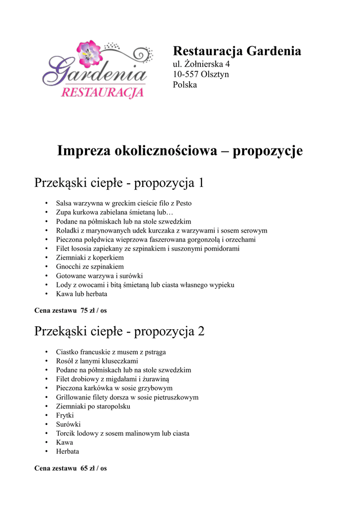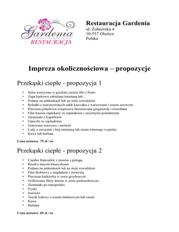 Restauracja Gardenia ul. Żołnierska 4 10-557 Olsztyn Polska Impreza okolicznościowa – propozycje Przekąski ciepłe - propozycja 1 • • • • • • • • • • • Salsa warzywna w greckim cieście filo z Pesto Zupa kurkowa zabielana śmietaną lub… Podane na półmiskach lub na stole szwedzkim Roladki z marynowanych udek kurczaka z warzywami i sosem serowym Pieczona polędwica wieprzowa faszerowana gorgonzolą i orzechami Filet łososia zapiekany ze szpinakiem i suszonymi pomidorami Ziemniaki z koperkiem Gnocchi ze szpinakiem Gotowane warzywa i surówki Lody z owocami i bitą śmietaną lub ciasta własnego wypieku Kawa lub herbata Cena zestawu 75 zł / os Przekąski ciepłe - propozycja 2 • • • • • • • • • • • • Ciastko francuskie z musem z pstrąga Rosół z lanymi kluseczkami Podane na półmiskach lub na stole szwedzkim Filet drobiowy z migdałami i żurawiną Pieczona karkówka w sosie grzybowym Grillowanie filety dorsza w sosie pietruszkowym Ziemniaki po staropolsku Frytki Surówki Torcik lodowy z sosem malinowym lub ciasta Kawa Herbata Cena zestawu 65 zł / os Przekąski ciepłe - propozycja 3 • • • • • • • • • • • • Mała krucha sałata z ziołami i grillowanym łososiem lub carpaccio z łososiem i orzeszkami pini Krem z dyni z prażonym bekonem lub … Podane na półmiskach lub na stole szwedzkim Kaczka z prażonymi jabłkami i żurawiną – najlepsza w mieście Polędwica wieprzowa faszerowana podgrzybkami i serem lub szparagami w bekonie Filet sandacza zapiekany z duszonymi kurkami Ziemniaki po staropolsku Ziemniaki z koperkiem Gotowane na parze warzywa Surówki Naleśnik z gałką lodów waniliowych i sosem toffi lub ciasta Kawa lub herbata Cena zestawu 65 zł / os Propozycja dla dzieci • • • • • • Grzanki z ciepłymi pomidorkami Bulion z lanymi kluseczkami Pierś kurczaka w chrupkiej panierce Frytki Surówki Lody z owocami lub ciasta Cena zestawu 55 zł / os Przekąski zimne – propozycja 180 gr./os - 30 zł Przy zamówieniu 1 zest na 1 osobę udzielony będzie rabat na konsumpcję 10% • • • • • • • • • • • • • Tatar wołowy Pasztet wieprzowy lub z dziczyzny Rolada z kaczki z wiśniami Karkówka pieczona z kaparami i czosnkiem Schab z morelami i śliwkami Rolada z kurczaka z brokułami i omletem Sandacz faszerowany szpinakiem Łosoś z marynowaną kurką i dynią Wątróbka w bekonie ze śliwką Cocktail cups zap ze szpinakiem Kuleczki mięsna w ziarnach Polędwica marynowana na krakersach Kurczak w ciecie filo • Krewetki smażone z ananasem Dodatkowo - sałaty – proszę o wybór jednej • • • • • • • Sałata grecka Sałata lodowa z prażonymi warzywami z czosnkiem na oliwie Sałata z grillowanym kurczakiem i czosnkiem marynowanym Sałatki – proszę o wybór max dwóch Sałatka z soczewicy z grillowanym kurczakiem i duszonymi grzybami Sałatka makaronowa z wędzonym łososiem i świeżymi warzywami z patelni Sałatka bekonowa z marynatami i smażonymi ziemniakami Przekąski zimne – do wyboru Przekąski drobne : • • • • • • • • • • • • • • Drobne ciasteczka francuskie z różnymi pastami -3,5 zł /szt. Tartinki -3,5 zł / szt. Kanapki koktajlowe – 3,5 zł / szt. Roladki z ciasta pszennego z wędlinami i warzywami – 3 zł / szt. Coctail cups zapiekane ze szpinakiem – 2,5 zł /szt. Plastry polędwicy wieprzowej na francuskim cieście – 3,5 zł /szt. Koreczki z masy mięsnej z marynatami – 3 zł /szt. Tatar z polędwicy wołowej podany na grzankach- 4 zł /szt. Wątróbki drobiowe zapiekane ze śliwka w bekonie – 2,5 zł/szt. Koreczki z piersi kurczaka i owoców – 3 zł /szt. Indyk z gorgonzolą i orzechem włoskim w greckim cieście – 3 zł /szt. Pierożki z ciasta francuskiego z grzybami – 4 zł /szt. Tatar z łososia na grzankach – 4 zł /szt. Ser feta w paście rybnej z suszonymi pomidorami w vol au vents – 3 zł /szt. Sałaty i sałatki: • • • • Sałata z łososiem – 22 zł / porcja Sałata z kurczakiem – 19 zł / porcja Sałatka z soczewicy z grzybami i kurczakiem – 5,5 zł / 100 gr. Sałatka ryżowa z wędzonym łososiem – 7 zł /100 gr. Jako ewentualne kolejne danie gorące: • • • • Zupa gulaszowa – 8 zł /porcja Boeuf stroganow – 12 zł/porcja Żurek z bekonem – 8 zł/porcja Flaki wołowe – 10 zł /porcja Aby uniknąć dodatkowych kosztów jako II danie gorące można potraktować zabraną z zestawu podstawowego zupę i zamienić ją na gulaszową, żurek lub flaki wołowe. Ciasta do wyboru (jeżeli nie zamiast deseru z zestawu) – 35 zł/ kg • Tort o dowolnym smaku – 40 zł / kg • Fontanna czekoladowa 4 zł / os + owoce 3 zł / os • Owoce różne – 22 zł / kg Napoje zimne: • Sok owocowy – 15 zł /l • Woda mineralna gaz – 3 zł / 0,3 l • Woda mineralna niegazowana 5 zł /l Pytania i rezerwacje: +48 515 114 652