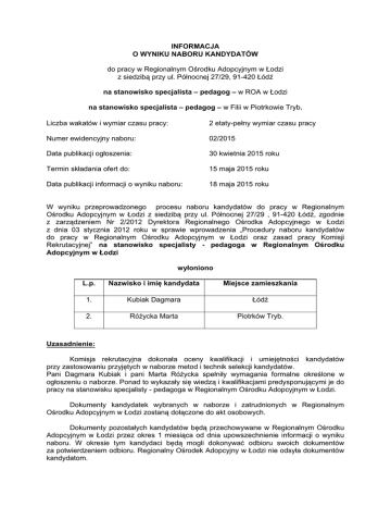 INFORMACJA O WYNIKU NABORU KANDYDATÓW do pracy w Regionalnym Ośrodku Adopcyjnym w Łodzi z siedzibą przy ul. Północnej 27/29, 91-420 Łódź na stanowisko specjalista – pedagog – w ROA w Łodzi na stanowisko specjalista – pedagog – w Filii w Piotrkowie Tryb. Liczba wakatów i wymiar czasu pracy: 2 etaty-pełny wymiar czasu pracy Numer ewidencyjny naboru: 02/2015 Data publikacji ogłoszenia: 30 kwietnia 2015 roku Termin składania ofert do: 15 maja 2015 roku Data publikacji informacji o wyniku naboru: 18 maja 2015 roku W wyniku przeprowadzonego procesu naboru kandydatów do pracy w Regionalnym Ośrodku Adopcyjnym w Łodzi z siedzibą przy ul. Północnej 27/29 , 91-420 Łódź, zgodnie z zarządzeniem Nr 2/2012 Dyrektora Regionalnego Ośrodka Adopcyjnego w Łodzi z dnia 03 stycznia 2012 roku w sprawie wprowadzenia „Procedury naboru kandydatów do pracy w Regionalnym Ośrodku Adopcyjnym w Łodzi oraz zasad pracy Komisji Rekrutacyjnej” na stanowisko specjalisty - pedagoga w Regionalnym Ośrodku Adopcyjnym w Łodzi wyłoniono L.p. Nazwisko i imię kandydata Miejsce zamieszkania 1. Kubiak Dagmara Łódź 2. Różycka Marta Piotrków Tryb. Uzasadnienie: Komisja rekrutacyjna dokonała oceny kwalifikacji i umiejętności kandydatów przy zastosowaniu przyjętych w naborze metod i technik selekcji kandydatów. Pani Dagmara Kubiak i pani Marta Różycka spełniły wymagania formalne określone w ogłoszeniu o naborze. Ponad to wykazały się wiedzą i kwalifikacjami predysponującymi je do pracy na stanowisku specjalisty - pedagoga w Regionalnym Ośrodku Adopcyjnym w Łodzi. Dokumenty kandydatek wybranych w naborze i zatrudnionych w Regionalnym Ośrodku Adopcyjnym w Łodzi zostaną dołączone do akt osobowych. Dokumenty pozostałych kandydatów będą przechowywane w Regionalnym Ośrodku Adopcyjnym w Łodzi przez okres 1 miesiąca od dnia upowszechnienie informacji o wyniku naboru. W okresie tym kandydaci będą mogli dokonywać odbioru swoich dokumentów za potwierdzeniem odbioru. Regionalny Ośrodek Adopcyjny w Łodzi nie odsyła dokumentów kandydatom. Po upływie okresu 1 miesiąca od dnia upowszechnienia informacji o wyniku naboru, nieodebrane przez kandydatów dokumenty zostaną protokolarnie zniszczone. Przewodniczący Komisji Rekrutacyjnej /-/ Anna Wysocka Stasiak