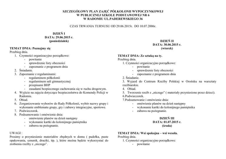 SZCZEGÓŁOWY PLAN ZAJĘĆ PÓŁKOLONII WYPOCZYNKOWEJ W PUBLICZNEJ SZKOLE PODSTAWOWEJ NR 6 W RADOMIU UL.PADEREWSKIEGO 36 CZAS TRWANIA TURNUSU OD 29.06.2015r. DO 10.07.2006r. DZIEŃ I DATA: 29.06.2015 r. (poniedziałek) TEMAT DNIA: Poznajmy się Przebieg dnia. 1. Czynności organizacyjno porządkowe: - powitanie - sprawdzenie listy obecności - zapoznanie z programem dnia 2. Śniadanie. 3. Zapoznanie z regulaminami: - regulaminem półkolonii - regulaminem sali gimnastycznej - przepisami BHP - zasadami bezpiecznego zachowania się w ruchu drogowym. 4. Wyjście na zajęcia dotyczące bezpieczeństwa do Komendy Policji w Radomiu. 5. Obiad. 6. Zorganizowanie wyborów do Rady Półkolonii, wybór nazwy grupy i wykonanie emblematu grupy, gry i zabawy integracyjne, sportowe. 7. Podwieczorek. 8. Podsumowanie i omówienie dnia: - omówienie planów na dzień następny - wykonanie kartki do kolonijnego pamiętnika - zabawa na pożegnanie. UWAGI : Prosimy o przyniesienie materiałów zbędnych w domu ( pudełka, puste opakowania, sznurek, druciki, itp. ), które można będzie wykorzystać do zrobienia rzeźby z „niczego”. DZIEŃ II DATA: 30.06.2015 r. (wtorek) TEMAT DNIA: Ze sztuką na ty. Przebieg dnia. 1. Czynności organizacyjno porządkowe: - powitanie - sprawdzenie listy obecności - zapoznanie z programem dnia 2. Śniadanie. 3. Wyjazd do Centrum Rzeźby Polskiej w Orońsku na warsztaty rzeźbiarskie. 4. Obiad. 5. Tworzenie rzeźb z „niczego” ( materiały przyniesione przez dzieci). 6.Podwieczorek. 7.Podsumowanie i omówienie dnia: - omówienie planów na dzień następny - wykonanie kartki do kolonijnego pamiętnika - zabawa na pożegnanie. DZIEŃ III DATA: 01.07.2015 r. (środa) TEMAT DNIA: Wsi spokojna – wsi wesoła. Przebieg dnia. 1. Czynności organizacyjno porządkowe: - powitanie - sprawdzenie listy obecności - zapoznanie z programem dnia 2. Śniadanie. 3. Wyjazd do Muzeum Wsi Radomskiej. Zwiedzanie muzeum, warsztaty. 4. Obiad. 5. Zabawy naszych rodziców i dziadków: gra w kapsle, toczenie „fajerki” (obręczy), ciuciubabka, itd. 6. Podwieczorek. 7. Podsumowanie i omówienie dnia: - omówienie planów na dzień następny - wykonanie kartki do kolonijnego pamiętnika - piosenki na pożegnanie. DZIEŃ IV DATA: 02.07.2015 r. (czwartek) TEMAT DNIA: Świat mistrza Jana. Przebieg dnia. 1. Czynności organizacyjno porządkowe: - powitanie - sprawdzenie listy obecności - zapoznanie z programem dnia - gimnastyka na wesoło przy muzyce 2. Śniadanie. 3. Wyjazd do Czarnolasu. Zwiedzanie muzeum. Zajęcia literackie w plenerze. 4. Obiad. 5. Prezentacje literackie. Tańce dawne i współczesne. 6. Podwieczorek. 7. Podsumowanie i omówienie dnia: - omówienie planów na dzień następny - wykonanie kartki do kolonijnego pamiętnika - zabawy relaksacyjne na pożegnanie. UWAGI: W związku z wyjściem na basen w dniu 03.07.2015 (piątek) prosimy o przygotowanie dla dzieci niezbędnych rzeczy: strój kąpielowy, klapki, czepek, ręcznik. DZIEŃ V DATA: 03.07.2015 r. (piątek) TEMAT DNIA: Kolorowe lato. Przebieg dnia. 1. Czynności organizacyjno porządkowe: - powitanie - sprawdzenie listy obecności - zapoznanie z programem dnia - poranna gimnastyka przy muzyce - zapoznanie z regulaminem pływalni 2. Śniadanie. 3. Wyjście na basen. 4. Obiad. 5. Konkurs plastyczny pt. „Kolorowe lato”, rysowanie kredą na asfalcie. 6. Podwieczorek 7. Podsumowanie i omówienie dnia: - omówienie planów na dzień następny - wykonanie kartki do kolonijnego pamiętnika - piosenki na pożegnanie. DZIEŃ VI DATA: 06.07.2015 r. (poniedziałek) TEMAT DNIA: Podróże kształcą. Przebieg dnia. 1. Czynności organizacyjno porządkowe: - powitanie, - sprawdzenie listy obecności, - zapoznanie z programem dnia, - poranne ćwiczenia na przebudzenie, 2. Śniadanie. 3. Wyjazd do Niekłania i Chlewisk. 4. Obiad. 5. Rozgrywki sportowe w sali gimnastycznej lub na placu zabaw. 6. Podwieczorek. 7. Podsumowanie i omówienie dnia: - omówienie planów na następny dzień - wykonanie kartki do kolonijnego pamiętnika - zabawa relaksacyjna na pożegnanie. UWAGI : W związku z wyjściem na basen w dniu 07.07.2015 (wtorek) prosimy o przygotowanie dla dzieci niezbędnych rzeczy: strój kąpielowy, klapki, czepek, ręcznik. DZIEŃ VII DATA: 07.07.2015 r. (wtorek) TEMAT DNIA: Młodzi kucharze na start. Przebieg dnia. 1. Czynności organizacyjno porządkowe: - powitanie - sprawdzenie listy obecności - zapoznanie z programem dnia - zabawa ruchowa na dzień dobry 2. Śniadanie. 3. Wyjście do pizzerii „Telepizza” (samodzielne przygotowanie pizzy, konsumpcja). 4. Ulubione danie pocięte na kawałki – prace plastyczne z kolorowych gazet. 5. Obiad. 6. Wyjście na basen. 7. Podwieczorek 8. Podsumowanie i omówienie dnia: - omówienie planów na dzień następny - wykonanie kartki do kolonijnego pamiętnika - zabawa relaksacyjna na pożegnanie. DZIEŃ VIII DATA: 08.07.2015 r. (środa) TEMAT DNIA: Z Orłem przez wieki. Przebieg dnia. 1. Czynności organizacyjno porządkowe: - powitanie - sprawdzenie listy obecności - zapoznanie z programem dnia - zabawa ruchowa na dzień dobry 2. Śniadanie. 3. Wyjazd do Muzeum Orła Białego w Skarżysku Kamiennej. 4. Obiad. 5. Konkurs techniczny - modele samolotów, spadochronu ( prace z papieru). 6. Podwieczorek 7. Podsumowanie i omówienie dnia: - omówienie planów na dzień następny, - wykonanie kartki do kolonijnego pamiętnika - zabawa relaksacyjna na pożegnanie. DZIEŃ IX DATA: 09.07.2015 r. (czwartek) TEMAT DNIA: W symbiozie z przyrodą. Przebieg dnia. 1. Czynności organizacyjno porządkowe: - powitanie - sprawdzenie listy obecności - zapoznanie z programem dnia - zabawa ruchowa na dzień dobry 2. Śniadanie. 3. Wycieczka do Puszczy Kozienickiej: - wędrówka szlakiem turystycznym w Puszczy Kozienickiej do Rezerwatu „Królewskie Źródła”, zajęcia przyrodnicze w terenie. 4. Obiad. 5. Gry zespołowe na boisku szkolnym, zabawy z chustą animacyjną „Klanza”. 6. Podwieczorek