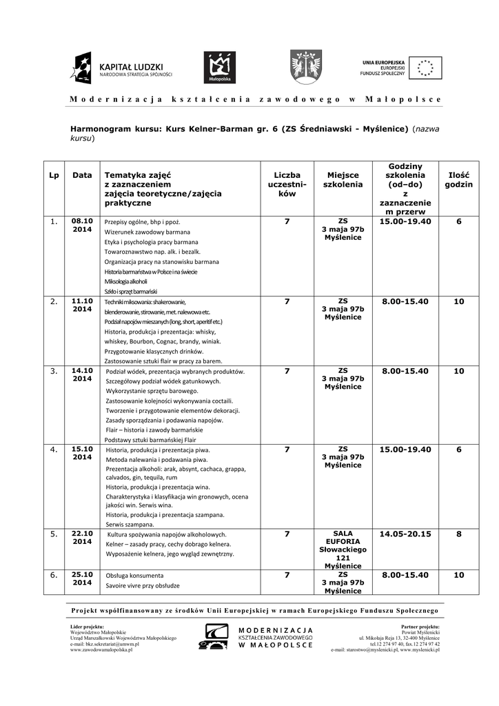 M o d e r n i z a c j a k s z t a ł c e n i a z a w o d o w e g o w M a ł o p o l s c e Harmonogram kursu: Kurs Kelner-Barman gr. 6 (ZS Średniawski - Myślenice) (nazwa kursu) Godziny szkolenia (od–do) z zaznaczenie m przerw 15.00-19.40 Lp Data Tematyka zajęć z zaznaczeniem zajęcia teoretyczne/zajęcia praktyczne Liczba uczestników Miejsce szkolenia 1. 08.10 2014 Przepisy ogólne, bhp i ppoż. Wizerunek zawodowy barmana Etyka i psychologia pracy barmana Towaroznawstwo nap. alk. i bezalk. Organizacja pracy na stanowisku barmana Historia barmaństwa w Polsce i na świecie Miksologia alkoholi Szkło i sprzęt barmański 7 ZS 3 maja 97b Myślenice 2. 11.10 2014 Techniki miksowania: shakerowanie, blenderowanie, stirowanie, met. nalewowa etc. Podział napojów mieszanych (long, short, aperitif etc.) Historia, produkcja i prezentacja: whisky, whiskey, Bourbon, Cognac, brandy, winiak. Przygotowanie klasycznych drinków. Zastosowanie sztuki flair w pracy za barem. 7 ZS 3 maja 97b Myślenice 8.00-15.40 10 3. 14.10 2014 7 ZS 3 maja 97b Myślenice 8.00-15.40 10 4. 15.10 2014 Podział wódek, prezentacja wybranych produktów. Szczegółowy podział wódek gatunkowych. Wykorzystanie sprzętu barowego. Zastosowanie kolejności wykonywania coctaili. Tworzenie i przygotowanie elementów dekoracji. Zasady sporządzania i podawania napojów. Flair – historia i zawody barmańskie Podstawy sztuki barmańskiej Flair Historia, produkcja i prezentacja piwa. Metoda nalewania i podawania piwa. Prezentacja alkoholi: arak, absynt, cachaca, grappa, calvados, gin, tequila, rum Historia, produkcja i prezentacja wina. Charakterystyka i klasyfikacja win gronowych, ocena jakości win. Serwis wina. Historia, produkcja i prezentacja szampana. Serwis szampana. 7 ZS 3 maja 97b Myślenice 15.00-19.40 6 5. 22.10 2014 Kultura spożywania napojów alkoholowych. Kelner – zasady pracy, cechy dobrago kelnera. Wyposażenie kelnera, jego wygląd zewnętrzny. 7 14.05-20.15 8 6. 25.10 2014 Obsługa konsumenta Savoire vivre przy obsłudze 7 SALA EUFORIA Słowackiego 121 Myślenice ZS 3 maja 97b Myślenice 8.00-15.40 10 P ro je kt ws półf i na nsowa ny z e śro d kó w Un ii E uro pe j s ki e j w ra ma c h E uro pe j s ki ego Fu nd u sz u S połe cz nego Lider projektu: Województwo Małopolskie Urząd Marszałkowski Województwa Małopolskiego e-mail: [email protected] www.zawodowamalopolska.pl Partner projektu: Powiat Myślenicki ul. Mikołaja Reja 13, 32-400 Myślenice tel.12 274 97 40, fax.12 274 97 42 e-mail: [email protected], www.myslenicki.pl Ilość godzin 6 M o d e r n i z a c j a 7. 26.10 2014 k s z t a ł c e n i a Prezentacja zastawy stołowej Przygotowanie stanowiska i organizacja czasu pracy Zasady przy przygotowywaniu: stołów, krzeseł, polerowania szkła i sztućców, nakrywania obrusów. Sztuka układania sztućców i serwetek. Zastosowanie tych zasad. Dekoracja stołu w zależności od przyjęcia. Zasady prawidłowego noszenia i zbierania talerzy, szkła, filiżanek, sztućców etc. Zastosowanie zasad noszenia zastawy. Metody serwowania, kolejność podawania potraw i napojów. Przyjmowanie i realizacja rezerwacji. Sprzątanie stolików – zasady Praktyczna obsługa gości indywidualnych. Organizacja bankietów – zasady i organizacja. Egzamin z a w o d o w e g o 7 w M a ł o p o l s c e Pod Parasolkami Klakurki 7a Myślenice 8.00-15.40 P ro je kt ws półf i na nsowa ny z e śro d kó w Un ii E uro pe j s ki e j w ra ma c h E uro pe j s ki ego Fu nd u sz u S połe cz nego Lider projektu: Województwo Małopolskie Urząd Marszałkowski Województwa Małopolskiego e-mail: [email protected] www.zawodowamalopolska.pl Partner projektu: Powiat Myślenicki ul. Mikołaja Reja 13, 32-400 Myślenice tel.12 274 97 40, fax.12 274 97 42 e-mail: [email protected], www.myslenicki.pl 10