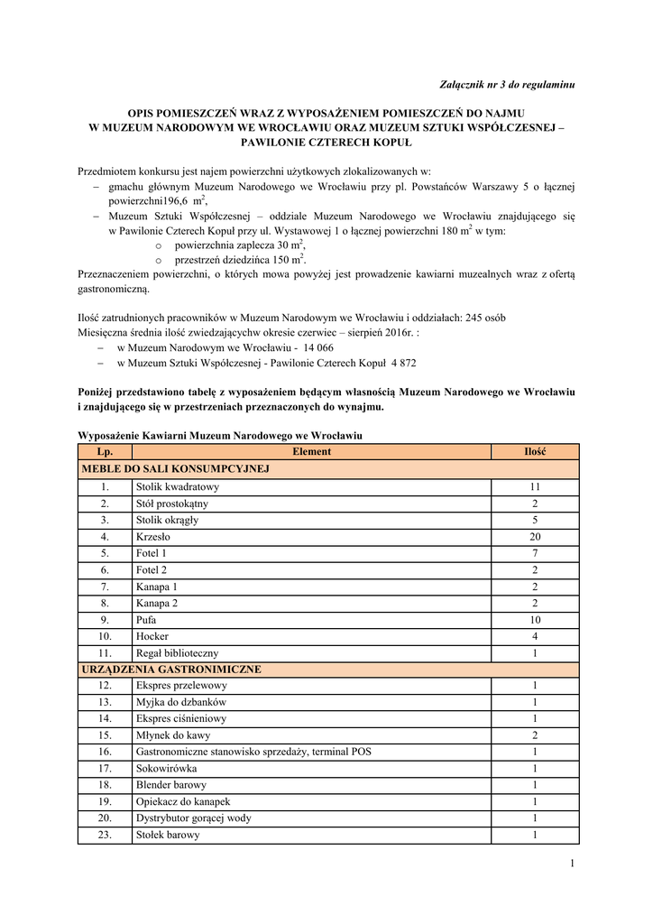 Załącznik nr 3 do regulaminu OPIS POMIESZCZEŃ WRAZ Z WYPOSAŻENIEM POMIESZCZEŃ DO NAJMU W MUZEUM NARODOWYM WE WROCŁAWIU ORAZ MUZEUM SZTUKI WSPÓŁCZESNEJ – PAWILONIE CZTERECH KOPUŁ Przedmiotem konkursu jest najem powierzchni użytkowych zlokalizowanych w: − gmachu głównym Muzeum Narodowego we Wrocławiu przy pl. Powstańców Warszawy 5 o łącznej powierzchni196,6 m2, − Muzeum Sztuki Współczesnej – oddziale Muzeum Narodowego we Wrocławiu znajdującego się w Pawilonie Czterech Kopuł przy ul. Wystawowej 1 o łącznej powierzchni 180 m2 w tym: o powierzchnia zaplecza 30 m2, o przestrzeń dziedzińca 150 m2. Przeznaczeniem powierzchni, o których mowa powyżej jest prowadzenie kawiarni muzealnych wraz z ofertą gastronomiczną. Ilość zatrudnionych pracowników w Muzeum Narodowym we Wrocławiu i oddziałach: 245 osób Miesięczna średnia ilość zwiedzającychw okresie czerwiec – sierpień 2016r. : − w Muzeum Narodowym we Wrocławiu - 14 066 − w Muzeum Sztuki Współczesnej - Pawilonie Czterech Kopuł 4 872 Poniżej przedstawiono tabelę z wyposażeniem będącym własnością Muzeum Narodowego we Wrocławiu i znajdującego się w przestrzeniach przeznaczonych do wynajmu. Wyposażenie Kawiarni Muzeum Narodowego we Wrocławiu Lp. Element Ilość MEBLE DO SALI KONSUMPCYJNEJ 1. Stolik kwadratowy 11 2. Stół prostokątny 2 3. Stolik okrągły 5 4. Krzesło 20 5. Fotel 1 7 6. Fotel 2 2 7. Kanapa 1 2 8. Kanapa 2 2 9. Pufa 10 10. Hocker 4 11. Regał biblioteczny URZĄDZENIA GASTRONIMICZNE 12. Ekspres przelewowy 1 1 13. Myjka do dzbanków 1 14. Ekspres ciśnieniowy 1 15. Młynek do kawy 2 16. Gastronomiczne stanowisko sprzedaży, terminal POS 1 17. Sokowirówka 1 18. Blender barowy 1 19. Opiekacz do kanapek 1 20. Dystrybutor gorącej wody 1 23. Stołek barowy 1 1 WYPOSAŻENIE GASTRONOMICZNE Bufet 24. Lada bufetowa 1 25. Witryna/ lada chłodnicza 1 26. Szuflada kasowa 1 27. Regał ekspozycyjny 1 28. Lodówka podladowa 2 29. Szafa mroźnicza podblatowa (zamrażarka) 1 30. Zlew stalowy jednokomorowy z ociekaczem i baterią 1 31. Umywalka z baterią stojącą 1 32. Szafka stojąca 3 33. Szafka stojąca pod zlew/umywalką 2 34. Blenda maskująca 4 35. Blat stalowy roboczy 2 36. Dozownik do ręczników 2 37. Dozownik do mydła 2 38. Odbijak do fusów 1 39. Kostkarka do lodu 1 Przygotowalnia 40. Szafka stojąca 3 41. Szafka stojąca z szufladami 1 42. Blenda maskująca 2 43. Blat stalowy roboczy 1 44. Stół ze zlewem 2 komorowym z baterią z wyciąganą wylewką 1 45. Stół z 2 półkami 1 46. Dozownik do ręczników 1 47. Dozownik do mydła 1 48. Szafa chłodnicza dwudrzwiowa (dwukomorowa) 1 49. Stół z 2 półkami 1 Zmywalnia 50. Szafa przelotowa z drzwiami suwanymi 1 51. Zmywarka z wyparzaczem 1 52. Stół ze zlewem 1 komorowym z baterią z wyciąganą wylewką 1 53. Stół z 2 półkami 1 54. Blat stalowy roboczy 1 55. Regał z 3 półkami regulowanymi 1 56. Dozownik do ręczników 1 57. Dozownik do mydła 1 Pokój socjalny 58. Zlewozmywak 1 komorowy z baterią stojącą 1 59. Szafka pod zlew 1 60. Szafka wisząca 1 61. Szafka ubraniowa dwudzielna 3 62. Stolik 1 63. Krzesło 1 64. Dozownik do ręczników 1 2 65. Dozownik do mydła 1 WC dla personelu 66. Dozownik do ręczników 1 67. Dozownik do mydła 1 68. Dozownik do papieru 1 69. Kosz na odpady 1 70. Lustro 1 71. Szczotka toaletowa 1 Magazyn podręczny 72. Regał magazynowy 1 Komunikacja wewnętrzna 73. Szafka na środki czystości i sprzęt porządkowy 1 Ponadto w skład wyposażenia pomieszczenia kawiarni w Muzeum Narodowym we Wrocławiu wchodzi zastawa stołowa typu: filiżanki, spodki, talerze, szklanki, sztućce karafki, szczypce do lodu, serwetniki mleczniki itp. Przestrzeń przeznaczona pod wynajem posiada połączenia do sieci elektrycznej, wodnokanalizacyjnej. Wynajmujący ma obowiązek we własnym zakresie i na własny koszt zawrzeć umowę w zakresie wywozu odpadów. Toalety dla klientów znajdują się w przestrzeni ogólnodostępnej budynku. Wyposażenie kawiarni Muzeum Sztuki Współczesnej w Pawilonie Czterech Kopuł we Wrocławiu Lp. Element Ilość Lada kawiarni 1. Zabudowa lady kawiarni 1 2. Lada chłodnicza niska 3 3. Lada chłodnicza wysoka 1 4. Ekspres kawowy z lodówką na mleko 1 5. Zmiękczacz wody manualny 1 6. Umywalka 1 7. Szuflada kasowa 1 8. Zabudowa podestu 1 Zaplecze kawiarni 9. Stół mycia wstępnego 1 10. Szafa przelotowa 1 11. Stół podstawa pod zmywarkę 1 12. Zmywarka komorowa do szkła 1 13. Zmywarka komorowa do naczyń 1 14. Stół z umywalką i półka 1 15. Stół zamykany drzwiami suwanymi 1 16. Szafa chłodnicza 370 l 1 17. Szafa chłodnicza 534 l 3 18. Regał 1 19. Stół z 2 komorami zlewozmywaka 1 20. Półka ociekowa Półka 1 21. Stół z komora zlewozmywaka 1 22. Stół odkładany z półką 1 3 23. Półka 1 24. Blat podawczy 2 25. Wózek dwupółkowy 1 26. Szafa ubraniowa 6 Wyposażenie ruchome 27. Fotele kawiarniane 52 28. Ławy kawiarniane 16 29. Stoliki kawiarniane 21 30. Hoker barowy dla pracowników 1 Ponadto w skład wyposażenia pomieszczenia kawiarni w Muzeum Sztuki Współczesnej – Pawilonie Czterech wchodzi zastawa stołowa typu: filiżanki, spodki, talerze, szklanki, sztućce karafki, szczypce do lodu, serwetniki mleczniki itp. Przestrzeń przeznaczona pod wynajem posiada podłączenia do sieci elektrycznej, wodnokanalizacyjnej. Wynajmujący ma obowiązek we własnym zakresie i na własny koszt zawrzeć umowę w zakresie wywozu odpadów. Toalety dla klientów znajdują się w przestrzeni ogólnodostępnej budynku. 4