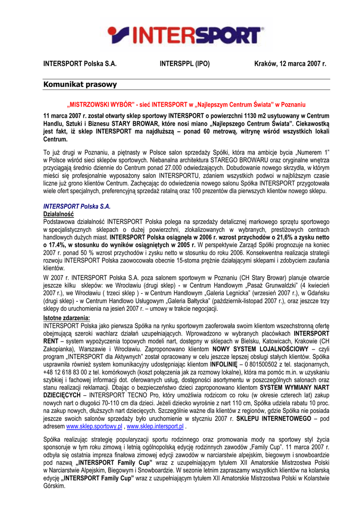 INTERSPORT Polska S.A. INTERSPPL (IPO) Kraków, 12 marca 2007 r. Komunikat prasowy „MISTRZOWSKI WYBÓR” - sieć INTERSPORT w „Najlepszym Centrum Świata” w Poznaniu 11 marca 2007 r. został otwarty sklep sportowy INTERSPORT o powierzchni 1130 m2 usytuowany w Centrum Handlu, Sztuki i Biznesu STARY BROWAR, które nosi miano „Najlepszego Centrum Świata”. Ciekawostką jest fakt, iż sklep INTERSPORT ma najdłuższą – ponad 60 metrową, witrynę wśród wszystkich lokali Centrum. To już drugi w Poznaniu, a piętnasty w Polsce salon sprzedaży Spółki, która ma ambicje bycia „Numerem 1” w Polsce wśród sieci sklepów sportowych. Niebanalna architektura STAREGO BROWARU oraz oryginalne wnętrza przyciągają średnio dziennie do Centrum ponad 27.000 odwiedzających. Dobudowanie nowego skrzydła, w którym mieści się profesjonalnie wyposażony salon INTERSPORTU, zdaniem wszystkich podwoi w najbliższym czasie liczne już grono klientów Centrum. Zachęcając do odwiedzenia nowego salonu Spółka INTERSPORT przygotowała wiele ofert specjalnych, preferencyjną sprzedaż ratalną oraz 100 prezentów dla pierwszych klientów nowego sklepu. INTERSPORT Polska S.A. Działalność Podstawowa działalność INTERSPORT Polska polega na sprzedaży detalicznej markowego sprzętu sportowego w specjalistycznych sklepach o dużej powierzchni, zlokalizowanych w wybranych, prestiżowych centrach handlowych dużych miast. INTERSPORT Polska osiągnęła w 2006 r. wzrost przychodów o 21,6% a zysku netto o 17.4%, w stosunku do wyników osiągniętych w 2005 r. W perspektywie Zarząd Spółki prognozuje na koniec 2007 r. ponad 50 % wzrost przychodów i zysku netto w stosunku do roku 2006. Konsekwentna realizacja strategii rozwoju INTERSPORT Polska zaowocowała obecnie 15-stoma prężnie działającymi sklepami i zdobyciem zaufania klientów. W 2007 r. INTERSPORT Polska S.A. poza salonem sportowym w Poznaniu (CH Stary Browar) planuje otwarcie jeszcze kilku sklepów: we Wrocławiu (drugi sklep) - w Centrum Handlowym „Pasaż Grunwaldzki” (4 kwiecień 2007 r.), we Wrocławiu ( trzeci sklep ) - w Centrum Handlowym „Galeria Legnicka” (wrzesień 2007 r.), w Gdańsku (drugi sklep) - w Centrum Handlowo Usługowym „Galeria Bałtycka” (październik-listopad 2007 r.), oraz jeszcze trzy sklepy do uruchomienia na jesień 2007 r. – umowy w trakcie negocjacji. Istotne zdarzenia: INTERSPORT Polska jako pierwsza Spółka na rynku sportowym zaoferowała swoim klientom wszechstronną ofertę obejmującą szeroki wachlarz działań uzupełniających. Wprowadzono w wybranych placówkach INTERSPORT RENT – system wypożyczenia topowych modeli nart, dostępny w sklepach w Bielsku, Katowicach, Krakowie (CH Zakopianka), Warszawie i Wrocławiu. Zaproponowano klientom NOWY SYSTEM LOJALNOŚCIOWY – czyli program „INTERSPORT dla Aktywnych” został opracowany w celu jeszcze lepszej obsługi stałych klientów. Spółka usprawniła również system komunikacyjny udostępniając klientom INFOLINIĘ – 0 801500502 z tel. stacjonarnych, +48 12 618 83 00 z tel. komórkowych (koszt połączenia jak za rozmowy lokalne), która ma pomóc m.in. w uzyskaniu szybkiej i fachowej informacji dot. oferowanych usług, dostępności asortymentu w poszczególnych salonach oraz stanu realizacji reklamacji. Dbając o bezpieczeństwo dzieci zaproponowano klientom SYSTEM WYMIANY NART DZIECIĘCYCH – INTERSPORT TECNO Pro, który umożliwia rodzicom co roku (w okresie czterech lat) zakup nowych nart o długości 70-110 cm dla dzieci. Jeżeli dziecko wyrośnie z nart 110 cm, Spółka udziela rabatu 10 proc. na zakup nowych, dłuższych nart dziecięcych. Szczególnie ważne dla klientów z regionów, gdzie Spółka nie posiada jeszcze swoich salonów sprzedaży było uruchomienie w styczniu 2007 r. SKLEPU INTERNETOWEGO – pod adresem www.sklep.sportowy.pl , www.sklep.intersport.pl . Spółka realizując strategię popularyzacji sportu rodzinnego oraz promowania mody na sportowy styl życia sponsoruje w tym roku zimową i letnią ogólnopolską edycję rodzinnych zawodów „Family Cup”. 11 marca 2007 r. odbyła się ostatnia impreza finałowa zimowej edycji zawodów w narciarstwie alpejskim, biegowym i snowboardzie pod nazwą „INTERSPORT Family Cup” wraz z uzupełniającym tytułem XII Amatorskie Mistrzostwa Polski w Narciarstwie Alpejskim, Biegowym i Snowboardzie. W sezonie letnim zapraszamy wszystkich klientów na kolarską edycję „INTERSPORT Family Cup” wraz z uzupełniającym tytułem XII Amatorskie Mistrzostwa Polski w Kolarstwie Górskim. Dodatkowych informacji udzielają: Relacje inwestorskie: Iwona Książek Kierownik Działu Informacji INTERSPORT Polska S.A. Tel. (012) 258 84 36, 600 401 271 E-mail: [email protected] Mirosław Gruca Dyrektor Pionu Relacji Inwestorskich Agencja Informacyjna PENETRATOR Sp. z o.o. Tel. (012) 429 47 77, 602 721 204 E-mail: [email protected] Media branżowe: Beata Ciechanowska Kierownik ds. Promocji i PR INTERSPORT Polska S.A. Tel. (012) 258 84 09, 600 070 968 E-mail: [email protected]
