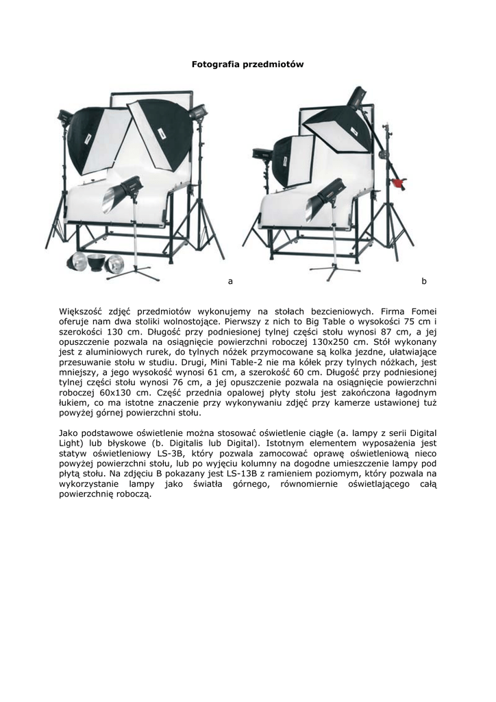 Fotografia przedmiotów a b Większość zdjęć przedmiotów wykonujemy na stołach bezcieniowych. Firma Fomei oferuje nam dwa stoliki wolnostojące. Pierwszy z nich to Big Table o wysokości 75 cm i szerokości 130 cm. Długość przy podniesionej tylnej części stołu wynosi 87 cm, a jej opuszczenie pozwala na osiągnięcie powierzchni roboczej 130x250 cm. Stół wykonany jest z aluminiowych rurek, do tylnych nóżek przymocowane są kolka jezdne, ułatwiające przesuwanie stołu w studiu. Drugi, Mini Table-2 nie ma kółek przy tylnych nóżkach, jest mniejszy, a jego wysokość wynosi 61 cm, a szerokość 60 cm. Długość przy podniesionej tylnej części stołu wynosi 76 cm, a jej opuszczenie pozwala na osiągnięcie powierzchni roboczej 60x130 cm. Część przednia opalowej płyty stołu jest zakończona łagodnym łukiem, co ma istotne znaczenie przy wykonywaniu zdjęć przy kamerze ustawionej tuż powyżej górnej powierzchni stołu. Jako podstawowe oświetlenie można stosować oświetlenie ciągłe (a. lampy z serii Digital Light) lub błyskowe (b. Digitalis lub Digital). Istotnym elementem wyposażenia jest statyw oświetleniowy LS-3B, który pozwala zamocować oprawę oświetleniową nieco powyżej powierzchni stołu, lub po wyjęciu kolumny na dogodne umieszczenie lampy pod płytą stołu. Na zdjęciu B pokazany jest LS-13B z ramieniem poziomym, który pozwala na wykorzystanie lampy jako światła górnego, równomiernie oświetlającego całą powierzchnię roboczą. Przedmioty z drewna W zdjęciach przedmiotów użytkowych staramy się przedstawić ich formę oraz strukturę materiału. Pod warstwami lakierów lub politur często gubią się charakterystyczne słoje drewna. Kształt przedmiotu oraz materiał i sposób wykończenia powierzchni narzucają sposób oświetlenia. Jeżeli małych przedmiotów nie można pokazać w ich naturalnym otoczeniu, zdjęcia najlepiej wykonywać na stole bezcieniowym. Pozorna jasność drewna często oszukuje nasze oczy, na zdjęciu będzie ono zawsze ciemniejsze od białej płaszczyzny stołu. W celu pokazania pełnego kształtu przedmiotu zdjęcie wykonujemy nieco z góry. Światło kluczowe zazwyczaj ustawiamy z lewej strony stołu w takim położeniu, aby promienie świetlne dobrze modelowały formę fotografowanego przedmiotu. Światło wypełniające ustawiamy po przeciwnej stronie stołu w celu zmniejszenia kontrastu oświetlenia, który dobieramy zależnie od stosowanego materiału zdjęciowego i przeznaczenia zdjęcia. Przy zdjęciach katalogowych stosujemy niższy kontrast oświetlenia, przy reklamowych lub artystycznych wyższy. W pierwszym przypadku stosujemy płaszczyzny rozpraszające, w drugim wykorzystujemy oprawy światła skierowanego. Tylko w wyjątkowych przypadkach kontrast zdjęciowy ustawiamy na poziomie 1:1. Takim przykładem może być zdjęcie płaskiej szkatułki, której najważniejszą cechą będzie piękne malowidło lub inkrustacja na jego górnej powierzchni. W celu uzyskania nieskazitelnej bieli tła płytę stołu podświetlamy światłem dolnym, z tak dobranym poziomem oświetlenia, aby na końcowym obrazie otrzymać biel tła. Zbyt wysoki poziom tego oświetlenia może spowodować nadmierne rozjaśnienie dolnej części przedmiotu, co sprawia nienaturalne wrażenie. Tkaniny W zależności od włókna, z którego jest wykonana tkanina, może być matowa lub lśniąca, gładka bądź wzorzysta. Na zdjęciach powinien być pokazany jej wzór, sposób łączenia nitek. Zdjęcia ubrań, powinny pokazać czytelnie jego krój, zdobienia i aplikacje oraz podkreślić strukturę materiału, z którego zostały wykonane. Zdjęcia tkaniny dwuwymiarowej możemy wykonać z góry w położeniu poziomym, lub pionowym. Tkaninę oświetlamy podobnie jak przy reprodukcji, starannie sprawdzając równomierność oświetlenia całej powierzchni. Jeżeli tanina jest zbyt dużą, aby na małym zdjęciu przedstawić jej fakturę, wykonujemy zdjęcia jej najbardziej charakterystycznego fragmentu. Dla zachowania właściwych proporcji zachowujemy warunek równoległości materiału zdjęciowego w stosunku do płaszczyzny fotografowanej tkaniny. Stosujemy obiektywy pozbawione dystorsji, a więc raczej obiektywy o stałej ogniskowej niż zoomy. Nie zawsze zachodzi potrzeba fotografowaniu tkanin jako dwuwymiarowych obrazów. Na ogół należy uwzględniać miękkość, jej sposób układania się w fałdy oraz sposób odbijania światła. Jako przykład pozornie paradoksalnego zachowania się materiału można podać aksamit, który przy konturowym oświetleniu światłem skierowanym, w miejscach gdzie nastąpiło całkowite odbicie promienie świetlnych od materiału na obrazie ukazuje czystą biel, a w miejscach pozostałych występuje pełna czerń (współczynnik odbicia światła dla aksamitu jest bliski 1%). W zdjęciach tkanin, w których wzór jest zróżnicowany splotem nici, widzimy go dzięki różnicowaniu w odbijaniu światła przez wzór i tło. Ponieważ różnice te są najczęściej bardzo subtelne, dla ich zróżnicowania stosujemy bardzo kierunkowe oświetlenie i tak dobieramy kierunek padania promieni świetlnych, aby ich kąt padania w stosunku do osi optycznej kamery zdjęciowej wynosił około 70-85º. Powstające cienie po stronie odświetlnej pozwalają dobrze przedstawić różnice we wzorze. Jeżeli chcemy zmniejszyć głębokość tych cieni, rozjaśniamy je światłem wypełniającym z dużą powierzchnią świecącą, ustawionym obok kamery zdjęciowej. Koronki fotografujemy podobnie jak tkaniny strukturalne. Niekiedy stosujemy inny sposób oświetlenia: podświetlamy opalową płytę stołu bezcieniowego i zdjęcie wykonujemy z góry. W celu zmniejszenia kontrastu oświetlenia stosujemy górne światło rozjaśniające, które uzyskujemy z dużej płaszczyzny rozpraszającej o znacznie niższym poziomie natężenia światła, niż światło dolne. Ten sposób oświetlenia koronek wymaga obiektyw