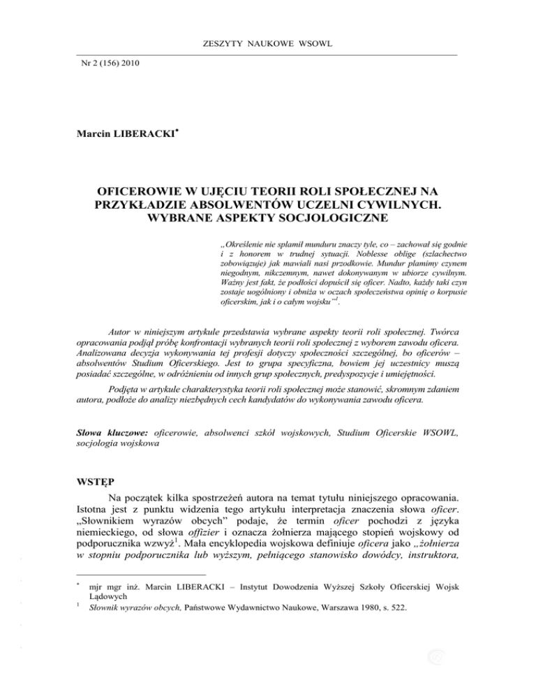 ZESZYTY NAUKOWE WSOWL Nr 2 (156) 2010 ISSN 1731-8157 Marcin LIBERACKI OFICEROWIE W UJĘCIU TEORII ROLI SPOŁECZNEJ NA PRZYKŁADZIE ABSOLWENTÓW UCZELNI CYWILNYCH. WYBRANE ASPEKTY SOCJOLOGICZNE „Określenie nie splamił munduru znaczy tyle, co – zachował się godnie i z honorem w trudnej sytuacji. Noblesse oblige (szlachectwo zobowiązuje) jak mawiali nasi przodkowie. Mundur plamimy czynem niegodnym, nikczemnym, nawet dokonywanym w ubiorze cywilnym. Ważny jest fakt, że podłości dopuścił się oficer. Nadto, każdy taki czyn zostaje uogólniony i obniża w oczach społeczeństwa opinię o korpusie oficerskim, jak i o całym wojsku”1. Autor w niniejszym artykule przedstawia wybrane aspekty teorii roli społecznej. Twórca opracowania podjął próbę konfrontacji wybranych teorii roli społecznej z wyborem zawodu oficera. Analizowana decyzja wykonywania tej profesji dotyczy społeczności szczególnej, bo oficerów – absolwentów Studium Oficerskiego. Jest to grupa specyficzna, bowiem jej uczestnicy muszą posiadać szczególne, w odróżnieniu od innych grup społecznych, predyspozycje i umiejętności. Podjęta w artykule charakterystyka teorii roli społecznej może stanowić, skromnym zdaniem autora, podłoże do analizy niezbędnych cech kandydatów do wykonywania zawodu oficera. Słowa kluczowe: oficerowie, absolwenci szkół wojskowych, Studium Oficerskie WSOWL, socjologia wojskowa - - - - - WSTĘP Na początek kilka spostrzeżeń autora na temat tytułu niniejszego opracowania. Istotna jest z punktu widzenia tego artykułu interpretacja znaczenia słowa oficer. „Słownikiem wyrazów obcych” podaje, że termin oficer pochodzi z języka niemieckiego, od słowa offizier i oznacza żołnierza mającego stopień wojskowy od podporucznika wzwyż1. Mała encyklopedia wojskowa definiuje oficera jako „żołnierza w stopniu podporucznika lub wyższym, pełniącego stanowisko dowódcy, instruktora, 1 mjr mgr inż. Marcin LIBERACKI – Instytut Dowodzenia Wyższej Szkoły Oficerskiej Wojsk Lądowych Słownik wyrazów obcych, Państwowe Wydawnictwo Naukowe, Warszawa 1980, s. 522. OFICEROWIE W UJĘCIU TEORII ROLI SPOŁECZNEJ NA PRZYKŁADZIE ABSOLWENTÓW… wychowawcy szeregowców i podoficerów, pracownika sztabu albo innej instytucji wojskowej”2. Podobne ujęcie terminu prezentuje również inna literatura3. Według A. Tanant’a oficer to „człowiek pełniący swoją powinność. Jakiż jest obowiązek oficera, oficera wolnego narodu? (…) Służyć ojczyźnie, zapewnić jej niezależność, strzec jej granic (…). Na wewnątrz: bronić instytucyj państwowych i zapewnić społeczeństwu spokój, rękojmie i warunki wszełakiej pracy, ogólny dobrobyt, pełnię rozwoju umysłowego; zapewnić poszanowanie (…) sprawiedliwości i prawa. Ojczyzna jako cel, honor jako godło, karność, wiedza i odwaga jako środki wiodące do celu. Nie masz obowiązku zaszczytniejszego w swej prostocie”4. Z punktu widzenia obowiązującego prawa polskiego, oficer zawodowy to osoba mianowana na stopień wojskowy podporucznika (podporucznika marynarki), po ukończeniu studiów w uczelni wojskowej. Jeżeli przemawiają za tym potrzeby armii, na stopień wojskowy podporucznika może być mianowany, po odbyciu szkolenia wojskowego i zdaniu egzaminu na oficera, podoficer zawodowy lub szeregowy zawodowy, który ukończył studia wyższe i posiada bardzo dobrą ogólną oceną z ostatniej opinii służbowej. Minimalnym wymaganiem wykształcenia, niezbędnym do wyznaczenia oficera, jest posiadanie dyplomu ukończenia studiów wyższych5. Na potrzeby artykułu zastosowano termin oficer w odniesieniu do osób promowanych na pierwszy stopień oficerski podporucznika (podporucznika marynarki), które ukończyły studia w Studium Oficerskim w Wyższej Szkole Oficerskiej Wojsk Lądowych we Wrocławiu. Uroczyste mianowanie na stopień podporucznika poprzedzone było spełnieniem szeregu wymogów formalnych w postaci pozytywnego złożenia egzaminów, testów i odbycia ćwiczeń praktycznych realizowanych w trakcie trwania procesu dydaktycznego. Przed rozpoczęciem kształcenia w uczelni wojskowej osoby te ukończyły cywilną szkołę wyższą i uzyskały tytuł zawodowy magistra (równorzędny). Kolejnym, użytym terminem, którego przybliżenia wymaga opracowanie, jest pojęcie absolwent. Zastosowane w tytule określenie absolwent uczelni cywilnych według Rozporządzenia Rady Ministrów z dnia 31 sierpnia 1983 roku w sprawie zatrudnienia absolwentów oznacza „absolwentów szkół wyższych studiów dziennych, podejmujących pracę zawodową w okresie trzech lat od ukończenia szkoły wyższej” 6. Ustawa z dnia 18 września 2001 r. o ułatwieniu zatrudnienia absolwentom szkół precyzuje absolwenta jako osobę „uczęszczającą w systemie dziennym do ponadpodstawowych oraz ponadgimnazjalnych szkół publicznych lub niepublicznych 2 3 - 4 - 5 - - - 6 Mała encyklopedia wojskowa, T 2, Wydawnictwo MON, Warszawa 1970, s. 496. Leksykon wiedzy wojskowej, Wydawnictwo MON, Warszawa 1979, s. 269. Encyklopedia wojskowa. Dowódcy i ich armie. Historia wojen i bitew. Technika wojskowa, Wydawnictwo Naukowe PWN SA; Wydawnictwo Bellona SA, Warszawa 2007, s. 47. A. Tanant, O powołaniu oficera, Wielkopolska Księgarnia Nakładowa Karola Rzepeckiego, Poznań 1927, s. 15. Ustawa z dnia 24 kwietnia 2009 r. o zmianie ustawy o służbie wojskowej żołnierzy zawodowych oraz niektórych innych ustaw (Dz. U. z 2009 r. nr 79, poz. 669). Ustawa z dnia 11 września 2003 r. o służbie wojskowej żołnierzy zawodowych (Dz. U. z 2003 r. nr 179, poz. 1750). Rozporządzenie Rady Ministrów z dnia 31 sierpnia 1983 roku w sprawie zatrudnienia absolwentów (Dz. U. Nr 11, poz. 62). 121 Marcin LIBERACKI o uprawnieniach szkoły publicznej albo szkoły wyższej” 7. Oświata i wychowanie w roku szkolnym 2008/2009. Informacje i opracowania statystyczne określają „absolwentów jako osoby, które ukończyły klasę programowo n
