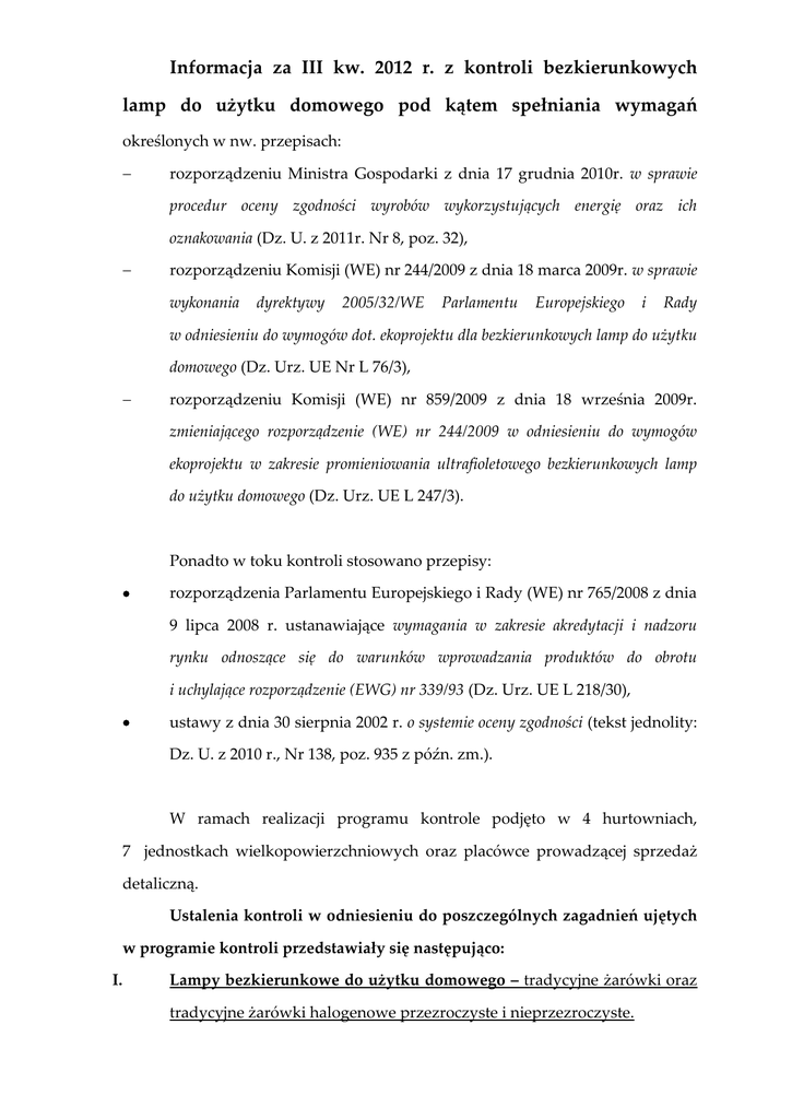 Informacja za III kw. 2012 r. z kontroli bezkierunkowych lamp do użytku domowego pod kątem spełniania wymagań określonych w nw. przepisach: rozporządzeniu Ministra Gospodarki z dnia 17 grudnia 2010r. w sprawie procedur oceny zgodności wyrobów wykorzystujących energię oraz ich oznakowania (Dz. U. z 2011r. Nr 8, poz. 32), rozporządzeniu Komisji (WE) nr 244/2009 z dnia 18 marca 2009r. w sprawie wykonania dyrektywy 2005/32/WE Parlamentu Europejskiego i Rady w odniesieniu do wymogów dot. ekoprojektu dla bezkierunkowych lamp do użytku domowego (Dz. Urz. UE Nr L 76/3), rozporządzeniu Komisji (WE) nr 859/2009 z dnia 18 września 2009r. zmieniającego rozporządzenie (WE) nr 244/2009 w odniesieniu do wymogów ekoprojektu w zakresie promieniowania ultrafioletowego bezkierunkowych lamp do użytku domowego (Dz. Urz. UE L 247/3). Ponadto w toku kontroli stosowano przepisy: rozporządzenia Parlamentu Europejskiego i Rady (WE) nr 765/2008 z dnia 9 lipca 2008 r. ustanawiające wymagania w zakresie akredytacji i nadzoru rynku odnoszące się do warunków wprowadzania produktów do obrotu i uchylające rozporządzenie (EWG) nr 339/93 (Dz. Urz. UE L 218/30), ustawy z dnia 30 sierpnia 2002 r. o systemie oceny zgodności (tekst jednolity: Dz. U. z 2010 r., Nr 138, poz. 935 z późn. zm.). W ramach realizacji programu kontrole podjęto w 4 hurtowniach, 7 jednostkach wielkopowierzchniowych oraz placówce prowadzącej sprzedaż detaliczną. Ustalenia kontroli w odniesieniu do poszczególnych zagadnień ujętych w programie kontroli przedstawiały się następująco: I. Lampy bezkierunkowe do użytku domowego – tradycyjne żarówki oraz tradycyjne żarówki halogenowe przezroczyste i nieprzezroczyste. Podczas przeprowadzonych producentów oraz importerów kontroli w zakresie sprawdzono, czy wprowadzania działania do obrotu tradycyjnych i halogenowych żarówek są zgodne z przepisami określonymi w art. 3 ust. 1 rozporządzenia WE nr 244/2009 i załączniku II pkt 1 tabela 1 i 2 do rozporządzenia. Na podstawie dokumentów zakupu ustalono, że wszystkie żarówki sprzedawane przez kontrolowane podmioty zostały wprowadzone do obrotu zgodnie z harmonogramem zawartym w rozporządzeniu WE nr 244/2009. II. Lampy bezkierunkowe do użytku domowego – ulepszone lampy halogenowe, kompaktowe lampy fluorescencyjne, lampy LED. Ze względu na brak na terenie działalności tut. Inspektoratu producentów i importerów lamp bezkierunkowych do użytku domowego kontrole prowadzono głównie w sklepach wielkopowierzchniowych i hurtowniach. W ramach kontroli sprawdzono, czy producenci umieszczają na opakowaniach lamp informacje dla użytkowników, o których mowa w pkt 3 załącznika II do rozporządzenia WE nr 244/2009 (dot. źródeł światła wprowadzonych do obrotu po 1 września 2010r.), m.in. nominalną moc lampy, okres trwałości, liczbę cykli włącz/wyłącz, temperaturę barwową, czas nagrzewania, dane dot. współpracy ze ściemniaczami, wymiary. Ponadto ustalono, czy świetlówki kompaktowe spełniają wymagania w zakresie skuteczności, zgodnie z tabelą 1 załącznika II rozporządzenia WE Nr 244/2009. Nieprawidłowości w powyższym zakresie stwierdzono w 2 rodzajach świetlówek. Przedmiotowe świetlówki nie spełniały wymagań ww. rozporządzenia z uwagi na: 2z5 brak informacji w języku polskim dotyczących liczby cykli włącz/wyłącz poprzedzającej przedwczesny koniec eksploatacji lampy, czasu nagrzewania się lampy do 60 % pełnego strumienia świetlnego, zawartości rtęci w lampie, zamieszczenie na opakowaniu zawyżonej wartości deklarowanej mocy żarówki równoważnej, tzn.: dla świetlówki 9W i strumieniu świetlnym 300 lm moc równoważnej „tradycyjnej” żarówki wynosi 30W - podano 40W, natomiast dla świetlówki 11W o strumieniu świetlnym 435 lm wynosi 40W - podano 60W (pkt 3.1. i załącznika II Rozporządzenia Komisji (WE) nr 244/2009), zamieszczenie w nazwie wyrobu określenia „lampa energooszczędna” mimo, iż ww. świetlówki nie spełniają wymagań w zakresie skuteczności mających zastosowanie do lamp nieprzezroczystych na etapie 1 zgodnie z tabelami 1, 2 i 3 załącznika II. brak wskazania strony internetowej, na której można znaleźć instrukcje dotyczące postępowania ze szczątkami lampy w razie przypadkowego jej uszkodzenia. W związku z powyższym, na podstawie art. 40k ust. 2 ww. ustawy o systemie oceny zgodności tut. Inspektorat, wystąpił do importera o usunięcie niezgodności poprzez uzupełnienie brakujących informacji lub wycofanie zakwestionowanych lamp z obrotu oraz przedstawienie dowodów podjętych działań. Importer podjął działania naprawcze polegające na zmianie opakowania wyrobów pochodzących z nowych dostaw. Natomiast przedmiotowe świetlówki znajdujące się w obrocie zostały uzupełnione poprzez naniesienie na opakowaniach stosownych etykiet. Do tut. Inspektoratu zostały nadesłane wzory nowego opakowania i etykiet. Do informacji zawartych na opakowaniach pozostałych objętych sprawdzeniem źródeł światła nie wniesiono uwag. 3z5 III. Oznakowanie CE Wszystkie kontrolowane wyroby wykorzystujące energię posiadały znak zgodności CE umieszczony w sposób czytelny i trwały, zgodny ze wzorem określonym w załączniku do rozporządzenia Ministra Gospodarki z dnia 17 grudnia 2010r. w sprawie procedur oceny zgodności wyrobów wykorzystujących energię oraz ich oznakowania (Dz. U. z 2011r., nr 8, poz. 32). Inne znaki umieszczone na wyrobach lub na ich opakowaniach nie zmniejszały widoczności i czytelności oznakowania CE. IV. Deklaracje zgodności Powyższe zagadnienie badano w oparciu o przepisy określone w § 10 rozporządzenia Ministra Gospodarki z dnia 17 grudnia 2010r. w sprawie procedur oceny zgodności wyrobów wykorzystujących energię oraz ich oznakowania (Dz. U. z 2011r., nr 8, poz. 32). Stwierdzono, że w deklaracjach zgodności energooszczędnych świetlówek kompaktowych oraz lamp energooszczędnyc