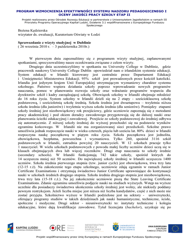 PROGRAM WZMOCNIENIA EFEKTYWNOŚCI SYSTEMU NADZORU PEDAGOGICZNEGO I OCENY JAKOŚCI PRACY SZKOŁY ETAP II Projekt realizowany przez Ośrodek Rozwoju Edukacji w partnerstwie z Uniwersytetem Jagiellońskim w ramach III Priorytetu Programu Operacyjnego Kapitał Ludzki, Działanie 3.1 współfinansowane z Europejskiego Funduszu Społecznego Bożena Kędzierska wizytator ds. ewaluacji, Kuratorium Oświaty w Łodzi Sprawozdanie z wizyty studyjnej w Dublinie ( 26 września 2010 r. – 3 października 2010r.) W pierwszym dniu zapoznaliśmy się z programem wizyty studyjnej, zaplanowanymi spotkaniami, sprecyzowaliśmy nasze oczekiwania związane z celem wizyty. Drugiego dnia uczestniczyliśmy w spotkaniu na University College w Dublinie, gdzie pracownik naukowy University College Dublin opowiedział nam o irlandzkim systemie edukacji. System edukacji w Irlandii kierowany jest centralnie przez Departament Edukacji i Umiejętności Ministerstwa Edukacji. 95% szkół jest prowadzonych przez kościół katolicki. Irlandia jest jedynym krajem Unii Europejskiej utrzymującym wyznaniowy charakter systemu szkolnego. Państwo wspiera działania szkoły poprzez wprowadzanie nowych programów nauczania, pomoc w planowaniu rozwoju szkoły oraz wdrażanie programów wsparcia dla dyrektorów szkół i kadry zarządzającej szkołą. Obowiązek szkolny w Irlandii obejmuje młodzież do 16 roku życia. System szkolny w Irlandii dzieli się na 2 etapy - sześcioklasową szkołę podstawową, i sześcioletnią szkołę średnią. Szkoła średnia jest dwuetapowa – trzyletnia niższa szkoła średnia (dla juniorów) i trzyletnia wyższa szkoła średnia (dla seniorów). Pomiędzy etapami szkoły średniej jest nieobowiązkowy rok przejściowy, gdzie uczniowie zapoznają się z metodami pracy akademickiej i pod okiem doradcy zawodowego przygotowują się do dalszej nauki oraz planowania ścieżki edukacyjnej i zawodowej. Przejście ze szkoły podstawowej do średniej odbywa się automatycznie. Z niższej szkoły średniej do wyższej przechodzi się na podstawie wyników egzaminu końcowego. W Irlandii nie ma zorganizowanej sieci przedszkoli. Szkolne prawo umożliwia jednak rozpoczęcie nauki w wieku czterech, pięciu lub sześciu lat. 80% dzieci w Irlandii rozpoczyna naukę początkową w piątym roku życia. Szkoła początkowa jest jednolita, obowiązkowa, bezpłatna, powszechna i wyznaniowa. Tylko 260, spośród 3116 szkół podstawowych w Irlandii, zatrudnia powyżej 20 nauczycieli. W 12 szkołach pracuje tylko 1 nauczyciel. W wielu szkołach podstawowych z powodu małej liczby uczniów dzieci uczą się w klasach obejmujących dwa lub więcej roczników. Drugi etap nauczania to szkoły średnie (secondary schools). W Irlandii funkcjonują 742 takie szkoły, spośród których do 14 uczęszcza mniej niż 50 uczniów. Do największej szkoły średniej w Irlandii uczęszcza 1400 uczniów. Szkoła średnia pierwszego stopnia (tzw. junior cycle) jest obowiązkowa, trwa trzy lata (12-15 r.ż). Na zakończenie tego etapu szkolnego, uczniowie zdają egzamin w ramach Junior Certificate Examinations i otrzymują świadectwo Junior Certificate uprawniające do kontynuacji nauki w szkołach średnich drugiego stopnia. Szkoła średnia drugiego stopnia jest nieobowiązkowa, trwa trzy lata (15-18 r.ż.). Na jej zakończenie uczniowie piszą the State Leaving Certificate Examinations. Zdanie egzaminu umożliwia podjęcie nauki na studiach wyższych. Wstęp na wyższe uczelnie dla posiadaczy świadectwa ukończenia szkoły średniej jest wolny, ale niekiedy poddany pewnym restrykcjom. Jeżeli liczba miejsc jest niższa niż liczba kandydatów, część z nich może nie zostać przyjęta. Szkolnictwo wyższe w Irlandii podzielone jest na sektory - uniwersytecki, oferujący programy studiów w takich dziedzinach jak nauki humanistyczne, techniczne, ścisłe, społeczne i medyczne. Drugi sektor - nieuniwersytecki to: instytuty techniczne i kolegia edukacyjne, które dają kwalifikacje zawodowe. Tytuł licencjata (bachelor), uzyskuje się po Projekt współfinansowany przez Unię Europejską w ramach Europejskiego Funduszu Społecznego PROGRAM WZMOCNIENIA EFEKTYWNOŚCI SYSTEMU NADZORU PEDAGOGICZNEGO I OCENY JAKOŚCI PRACY SZKOŁY ETAP II Projekt realizowany przez Ośrodek Rozwoju Edukacji w partnerstwie z Uniwersytetem Jagiellońskim w ramach III Priorytetu Programu Operacyjnego Kapitał Ludzki, Działanie 3.1 współfinansowane z Europejskiego Funduszu Społecznego ukończeniu 3-4 letnich studiów stacjonarnych. Następnie można ubiegać się o stopień magistra, który dostępny jest na wszystkich poziomach studiów (studia trwają od 1 do 3 lat). Stopień magistra nadawany jest po zdaniu odpowiednich egzaminów. Najwyższe kwalifikacje akademickie w Irlandii daje doktorat (3-4 lata). W kolejnym dniu wizyty zaproszono nas do Departamentu Edukacji i Umiejętności Ministerstwa Edukacji w Irlandii. Spotkanie prowadziła Deirdre Mathews - asystent głównego inspektora Krajowego inspektoratu w Departamencie Edukacji i Umiejętności. Zapoznano nas ze strukturą systemu oświaty oraz modelami inspekcji szkolnych. W Irlandii prowadzone są ewaluacje całościowe i przedmiotowe. W szkołach średnich w inspekcji uczestniczą inspektorzy - specjaliści poszczególnych przedmiotów nauczania. Procedura ewaluacji całościowej obejmuje obserwację, analizę dokumentacji, spotkania z podmiotami współpracującymi ze szkoła, analizę procesów zachodzących w szkole, ankietowanie uczniów i rodziców uwzględniana jest autoewaluacja szkoły. Procedury prowadzenia ewaluacji są określone przepisami prawa, sposób postępowania jest niezależny od typu i wielkości szkoły oraz jest ustalony przez inspektora. Inspekcje kończą się raportem, który zawiera informacje o szkole oraz rekomendacje. Wszyscy czekaliśmy na spotkanie w Ministerstwie. Byliśmy przekonani, że będzie to najatrakcyjniejszy dzień wizyty, bo poznamy od strony te