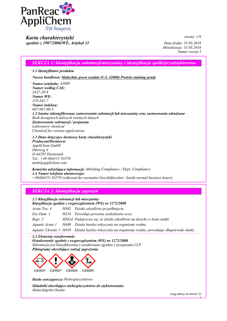 42.2.28 strona: 1/9 Karta charakterystyki zgodnie z 1907/2006/WE, Artykuł 31 Data druku: 31.05.2016 Aktualizacja: 31.05.2016 Numer wersji 3 SEKCJA 1: Identyfikacja substancji/mieszaniny i identyfikacja spółki/przedsiębiorstwa · 1.1 Identyfikator produktu · Nazwa handlowa: Malachite green oxalate (C.I. 42000) Protein staining grade · Numer artykułu: A3889 · Numer według CAS: 2437-29-8 · Numer WE: 219-441-7 · Numer indeksu: 607-007-00-3 · 1.2 Istotne zidentyfikowane zastosowania substancji lub mieszaniny oraz zastosowania odradzane Brak dostępnych dalszych istotnych danych · Zastosowanie substancji / preparatu Laboratory chemical Chemical for various applications · 1.3 Dane dotyczące dostawcy karty charakterystyki · Producent/Dostawca: AppliChem GmbH Ottoweg 4 D-64291 Darmstadt Tel.: +49 (0)6151 93570 [email protected] · Komórka udzielająca informacji: Abteilung Compliance / Dept. Compliance · 1.4 Numer telefonu alarmowego: +49(0)6151 93570 (während der normalen Geschäftszeiten / Inside normal business hours) SEKCJA 2: Identyfikacja zagrożeń · 2.1 Klasyfikacja substancji lub mieszaniny · Klasyfikacja zgodnie z rozporządzeniem (WE) nr 1272/2008 Acute Tox. 4 H302 Działa szkodliwie po połknięciu. Eye Dam. 1 H318 Powoduje poważne uszkodzenie oczu. Repr. 2 H361d Podejrzewa się, że działa szkodliwie na dziecko w łonie matki. Aquatic Acute 1 H400 Działa bardzo toksycznie na organizmy wodne. Aquatic Chronic 1 H410 Działa bardzo toksycznie na organizmy wodne, powodując długotrwałe skutki. · 2.2 Elementy oznakowania · Oznakowanie zgodnie z rozporządzeniem (WE) nr 1272/2008 Substancja jest klasyfikowana i oznakowana zgodnie z przepisami CLP. · Piktogramy określające rodzaj zagrożenia GHS05 GHS07 GHS08 GHS09 · Hasło ostrzegawcze Niebezpieczeństwo · Składniki określające niebezpieczeństwo do etykietowania: Malachitgrün Oxalat (ciąg dalszy na stronie 2) PL 42.2.28 Karta charakterystyki zgodnie z 1907/2006/WE, Artykuł 31 strona: 2/9 Data druku: 31.05.2016 Aktualizacja: 31.05.2016 Numer wersji 3 Nazwa handlowa: Malachite green oxalate (C.I. 42000) Protein staining grade (ciąg dalszy od strony 1) · Zwroty wskazujące rodzaj zagrożenia H302 Działa szkodliwie po połknięciu. H318 Powoduje poważne uszkodzenie oczu. H361d Podejrzewa się, że działa szkodliwie na dziecko w łonie matki. H410 Działa bardzo toksycznie na organizmy wodne, powodując długotrwałe skutki. · Zwroty wskazujące środki ostrożności P281 Stosować wymagane środki ochrony indywidualnej. P273 Unikać uwolnienia do środowiska. P305+P351+P338 W PRZYPADKU DOSTANIA SIĘ DO OCZU: Ostrożnie płukać wodą przez kilka minut. Wyjąć soczewki kontaktowe, jeżeli są i można je łatwo usunąć. Nadal płukać. P308+P313 W przypadku narażenia lub styczności: Zasięgnąć porady/zgłosić się pod opiekę lekarza. · 2.3 Inne zagrożenia · Wyniki oceny właściwości PBT i vPvB · PBT: Nie nadający się do zastosowania. · vPvB: Nie nadający się do zastosowania. SEKCJA 3: Skład/informacja o składnikach · 3.1 Charakterystyka chemiczna: Substancje · Nazwa wg nr CAS 2437-29-8 Malachitgrün Oxalat · Numer(y) identyfikacyjny(e) · Numer WE: 219-441-7 · Numer indeksu: 607-007-00-3 SEKCJA 4: Środki pierwszej pomocy · 4.1 Opis środków pierwszej pomocy · Po wdychaniu: Dostarczyć świeże powietrze lub tlen; wezwać lekarza. · Po styczności ze skórą: Zmyć dużą ilością wody. Odzież zanieczyszczoną produktem należy niezwłocznie usunąć. Odwieźć do lekarza. · Po styczności z okiem: Płukać oczy z otwartą powieką przez kilka minut pod bieżącą wodą. Natychmiast wezwać lekarza. · Po przełknięciu: podać poszkodowanemu wodę do picia ( przynajmniej dwie szklanki). Odwieźć do lekarza. · 4.2 Najważniejsze ostre i opóźnione objawy oraz skutki narażenia Brak dostępnych dalszych istotnych danych · 4.3 Wskazania dotyczące wszelkiej natychmiastowej pomocy lekarskiej i szczególnego postępowania z poszkodowanym Brak dostępnych dalszych istotnych danych SEKCJA 5: Postępowanie w przypadku pożaru · 5.1 Środki gaśnicze · Przydatne środki gaśnicze: CO2, proszek gaśniczy lub strumień wody. Większy pożar zwalczać strumieniem wody lub pianą odporną na działanie alkoholu. · 5.2 Szczególne zagrożenia związane z substancją lub mieszaniną palny. W razie pożaru możliwe powstawanie niebezpiecznych palnych gazów lub par. Podczas pożaru mogą uwolnić się: Tlenki azotu (NOx) (ciąg dalszy na stronie 3) PL 42.2.28 Karta charakterystyki zgodnie z 1907/2006/WE, Artykuł 31 strona: 3/9 Data druku: 31.05.2016 Aktualizacja: 31.05.2016 Numer wersji 3 Nazwa handlowa: Malachite green oxalate (C.I. 42000) Protein staining grade (ciąg dalszy od strony 2) tlenki węgla (CO, CO2) · 5.3 Informacje dla straży pożarnej · Specjalne wyposażenie ochronne: Nosić urządzenie ochrony dróg oddechowych niezależnie od powietrza otoczenia. · Inne dane Pozostałości po pożarze i skażona woda muszą być usunięte zgodnie z przepisami. Pokrywać uciekające pary wodą. SEKCJA 6: Postępowanie w przypadku niezamierzonego uwolnienia do środowiska · 6.1 Indywidualne środki ostrożności, sprzęt ochronny i procedury w sytuacjach awaryjnych Unikać kurzu. Nie wdychać pylów. Unikać zanieczyszczenia substancją. Zadbać o wystarczające wietrzenie. · 6.2 Środki ostrożności w zakresie ochrony środowiska: Nie dopuścić do przeniknięcia do kanalizacji /wód powierzchniowych /wód gruntowych. · 6.3 Metody i materiały zapobiegające rozprzestrzenianiu się skażenia i służące do usuwania skażenia: Zdjąć mechanicznie. Avoid generation of dusts. Materiał skażony usunąć jako odpad wg punktu 13. Oczyścić skażone miejsce. · 6.4 Odniesienia do innych sekcji Informacje na temat bezpiecznej obsługi patrz rozdział 7. Informacje na temat osobistego wyposażenia ochronnego patrz rozdział 8. Informacje na temat utylizacji patrz rozdzia