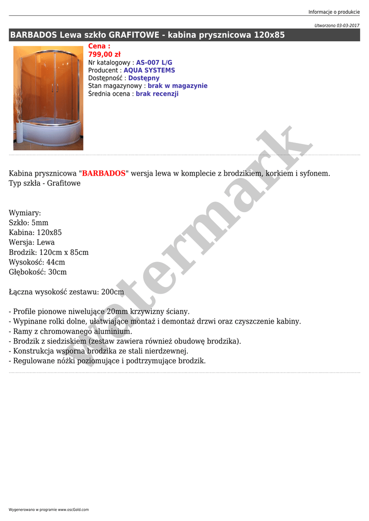 Informacje o produkcie Utworzono 03-03-2017 BARBADOS Lewa szkło GRAFITOWE - kabina prysznicowa 120x85 Cena : 799,00 zł er m ar k Nr katalogowy : AS-007 L/G Producent : AQUA SYSTEMS Dostępność : Dostępny Stan magazynowy : brak w magazynie Średnia ocena : brak recenzji Kabina prysznicowa "BARBADOS" wersja lewa w komplecie z brodzikiem, korkiem i syfonem. Typ szkła - Grafitowe Wymiary: Szkło: 5mm Kabina: 120x85 Wersja: Lewa Brodzik: 120cm x 85cm Wysokość: 44cm Głębokość: 30cm at Łączna wysokość zestawu: 200cm w - Profile pionowe niwelujące 20mm krzywizny ściany. - Wypinane rolki dolne, ułatwiające montaż i demontaż drzwi oraz czyszczenie kabiny. - Ramy z chromowanego aluminium. - Brodzik z siedziskiem (zestaw zawiera również obudowę brodzika). - Konstrukcja wsporna brodzika ze stali nierdzewnej. - Regulowane nóżki poziomujące i podtrzymujące brodzik. Wygenerowano w programie www.oscGold.com