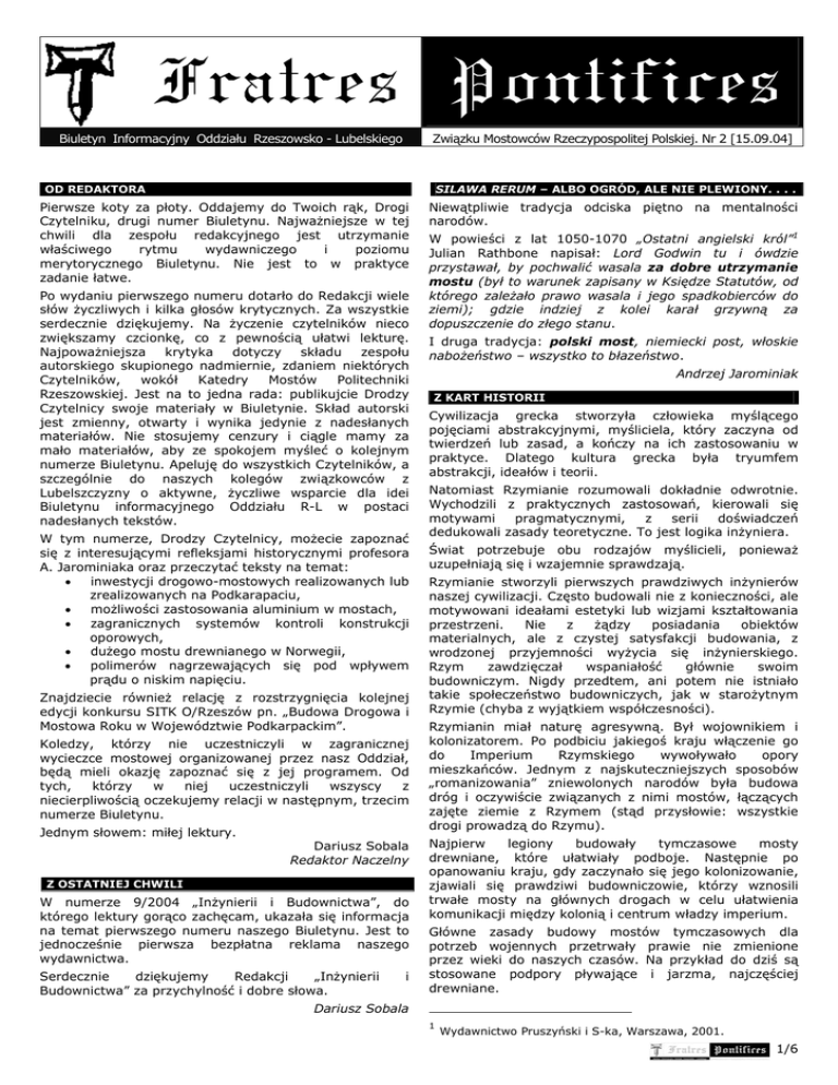Fratres Pontifices Biuletyn Informacyjny Oddziału Rzeszowsko - Lubelskiego Związku Mostowców Rzeczypospolitej Polskiej. Nr 2 [15.09.04] OD REDAKTORA SILAWA RERUM – ALBO OGRÓD, ALE NIE PLEWIONY. . . . Pierwsze koty za płoty. Oddajemy do Twoich rąk, Drogi Czytelniku, drugi numer Biuletynu. Najważniejsze w tej chwili dla zespołu redakcyjnego jest utrzymanie właściwego rytmu wydawniczego i poziomu merytorycznego Biuletynu. Nie jest to w praktyce zadanie łatwe. Po wydaniu pierwszego numeru dotarło do Redakcji wiele słów życzliwych i kilka głosów krytycznych. Za wszystkie serdecznie dziękujemy. Na życzenie czytelników nieco zwiększamy czcionkę, co z pewnością ułatwi lekturę. Najpoważniejsza krytyka dotyczy składu zespołu autorskiego skupionego nadmiernie, zdaniem niektórych Czytelników, wokół Katedry Mostów Politechniki Rzeszowskiej. Jest na to jedna rada: publikujcie Drodzy Czytelnicy swoje materiały w Biuletynie. Skład autorski jest zmienny, otwarty i wynika jedynie z nadesłanych materiałów. Nie stosujemy cenzury i ciągle mamy za mało materiałów, aby ze spokojem myśleć o kolejnym numerze Biuletynu. Apeluję do wszystkich Czytelników, a szczególnie do naszych kolegów związkowców z Lubelszczyzny o aktywne, życzliwe wsparcie dla idei Biuletynu informacyjnego Oddziału R-L w postaci nadesłanych tekstów. W tym numerze, Drodzy Czytelnicy, możecie zapoznać się z interesującymi refleksjami historycznymi profesora A. Jarominiaka oraz przeczytać teksty na temat: • inwestycji drogowo-mostowych realizowanych lub zrealizowanych na Podkarapaciu, • możliwości zastosowania aluminium w mostach, • zagranicznych systemów kontroli konstrukcji oporowych, • dużego mostu drewnianego w Norwegii, • polimerów nagrzewających się pod wpływem prądu o niskim napięciu. Znajdziecie również relację z rozstrzygnięcia kolejnej edycji konkursu SITK O/Rzeszów pn. „Budowa Drogowa i Mostowa Roku w Województwie Podkarpackim”. Koledzy, którzy nie uczestniczyli w zagranicznej wycieczce mostowej organizowanej przez nasz Oddział, będą mieli okazję zapoznać się z jej programem. Od tych, którzy w niej uczestniczyli wszyscy z niecierpliwością oczekujemy relacji w następnym, trzecim numerze Biuletynu. Jednym słowem: miłej lektury. Dariusz Sobala Redaktor Naczelny Z OSTATNIEJ CHWILI W numerze 9/2004 „Inżynierii i Budownictwa”, do którego lektury gorąco zachęcam, ukazała się informacja na temat pierwszego numeru naszego Biuletynu. Jest to jednocześnie pierwsza bezpłatna reklama naszego wydawnictwa. Serdecznie dziękujemy Redakcji „Inżynierii Budownictwa” za przychylność i dobre słowa. i Niewątpliwie tradycja odciska piętno na mentalności narodów. W powieści z lat 1050-1070 „Ostatni angielski król”1 Julian Rathbone napisał: Lord Godwin tu i ówdzie przystawał, by pochwalić wasala za dobre utrzymanie mostu (był to warunek zapisany w Księdze Statutów, od którego zależało prawo wasala i jego spadkobierców do ziemi); gdzie indziej z kolei karał grzywną za dopuszczenie do złego stanu. I druga tradycja: polski most, niemiecki post, włoskie nabożeństwo – wszystko to błazeństwo. Andrzej Jarominiak Z KART HISTORII Cywilizacja grecka stworzyła człowieka myślącego pojęciami abstrakcyjnymi, myśliciela, który zaczyna od twierdzeń lub zasad, a kończy na ich zastosowaniu w praktyce. Dlatego kultura grecka była tryumfem abstrakcji, ideałów i teorii. Natomiast Rzymianie rozumowali dokładnie odwrotnie. Wychodzili z praktycznych zastosowań, kierowali się motywami pragmatycznymi, z serii doświadczeń dedukowali zasady teoretyczne. To jest logika inżyniera. Świat potrzebuje obu rodzajów myślicieli, ponieważ uzupełniają się i wzajemnie sprawdzają. Rzymianie stworzyli pierwszych prawdziwych inżynierów naszej cywilizacji. Często budowali nie z konieczności, ale motywowani ideałami estetyki lub wizjami kształtowania przestrzeni. Nie z żądzy posiadania obiektów materialnych, ale z czystej satysfakcji budowania, z wrodzonej przyjemności wyżycia się inżynierskiego. Rzym zawdzięczał wspaniałość głównie swoim budowniczym. Nigdy przedtem, ani potem nie istniało takie społeczeństwo budowniczych, jak w starożytnym Rzymie (chyba z wyjątkiem współczesności). Rzymianin miał naturę agresywną. Był wojownikiem i kolonizatorem. Po podbiciu jakiegoś kraju włączenie go do Imperium Rzymskiego wywoływało opory mieszkańców. Jednym z najskuteczniejszych sposobów „romanizowania” zniewolonych narodów była budowa dróg i oczywiście związanych z nimi mostów, łączących zajęte ziemie z Rzymem (stąd przysłowie: wszystkie drogi prowadzą do Rzymu). Najpierw legiony budowały tymczasowe mosty drewniane, które ułatwiały podboje. Następnie po opanowaniu kraju, gdy zaczynało się jego kolonizowanie, zjawiali się prawdziwi budowniczowie, którzy wznosili trwałe mosty na głównych drogach w celu ułatwienia komunikacji między kolonią i centrum władzy imperium. Główne zasady budowy mostów tymczasowych dla potrzeb wojennych przetrwały prawie nie zmienione przez wieki do naszych czasów. Na przykład do dziś są stosowane podpory pływające i jarzma, najczęściej drewniane. Dariusz Sobala 1 Wydawnictwo Pruszyński i S-ka, Warszawa, 2001. 1/6 Starożytny Rzymianin, jak i inni dawni budowniczowie, początkowo stosował drewno. Nauczył się nasycać je ałunem, aby uodpornić na ogień. Nauczył się impregnować olejem i żywicą, aby zabezpieczyć przed suchym gniciem. Nauczył się jakie używać rodzaje drewna do różnych celów budowlanych – że dąb najlepiej nadaje się do fundamentów i podpór, olcha na pale podwodne, zaś cyprys i cedr do konstrukcji przęseł, gdy jest konieczna duża wytrzymałość na ściskanie. A potem rozpoczął budować w kamieniu. Andrzej Jarominiak Źródło: D.B. Steinman, S.R Watson: Bridges and Their Builders. Dover 