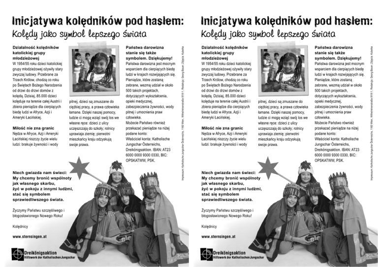 Inicjatywa kolędników pod haslem: Inicjatywa kolędników pod haslem: Działalność kolędników katolickiej grupy młodzieżowej W 1954/55 roku dzieci katolickiej grupy młodzieżowej ożywiły stary zwyczaj ludowy. Przebrane za Trzech Królow, chodzą co roku po Świętach Bożego Narodzenia od drzwi do drzwi domów z kolędą. Dzisiaj, 85.000 dzieci kolęduje na terenie całej Austrii i zbiera pieniądze dla cierpiących biedę ludzi w Afryce, Azji i Ameryki Łacińskiej. Działalność kolędników katolickiej grupy młodzieżowej W 1954/55 roku dzieci katolickiej grupy młodzieżowej ożywiły stary zwyczaj ludowy. Przebrane za Trzech Królow, chodzą co roku po Świętach Bożego Narodzenia od drzwi do drzwi domów z kolędą. Dzisiaj, 85.000 dzieci kolęduje na terenie całej Austrii i zbiera pieniądze dla cierpiących biedę ludzi w Afryce, Azji i Ameryki Łacińskiej. Niech gwiazda nam świeci: My chcemy bronić wspólnoty jak własnego skarbu, żyć w pokoju z innymi ludżmi, stać się symbolem sprawiedliwszego świata. ´ Koledy jako symbol lepszego swiata c Miłość nie zna granic Nędza w Afryce, Azji i Ameryki Łacińskiej niszczy życie wielu ludzi: brakuje żywności i wody pitnej, dzieci są zmuszane do ciężkiej pracy, a prawa człowieka łamane. Dzięki naszej pomocy, ludzie ci mogą wziąć swój los we własne ręce: dzieci z ulicy uczęszczają do szkoły; rolnicy uprawiaja ziemię; pierwotni mieszkańcy kraju odzyskują swoje prawa. Niech gwiazda nam świeci: My chcemy bronić wspólnoty jak własnego skarbu, żyć w pokoju z innymi ludżmi, stać się symbolem sprawiedliwszego świata. Życzymy Państwu szczęśliwego i błogosławionego Nowego Roku! Życzymy Państwu szczęśliwego i błogosławionego Nowego Roku! Kolędnicy Kolędnicy www.sternsingen.at www.sternsingen.at Państwa darowizna stanie się także symbolem. Dziękujemy! Państwa darowizna jest mocnym wsparciem dla cierpiących biedę ludzi w krajach rozwijających się. Pieniądze, które zostaną zebrane, wezmą udział w około 500 takich projektach, dotyczących wykształcenia, opieki medycznej, zabezpieczenia żywności, wody pitnej i umocnienia praw człowieka. Możecie Państwo również przekazać pieniądze na niżej podane konto: Właściciel konta: Katholische Jungschar Österreichs, Dreikönigsaktion. IBAN: AT23 6000 0000 9300 0330, BIC: OPSKATWW, PSK. Impressum: Katholische Jungschar Österreichs, 1160 Wien, Wilhelminenstraße 91/II f ; Redakcja: Georg Bauer; Zdjęcia: Kubelka Miłość nie zna granic Nędza w Afryce, Azji i Ameryki Łacińskiej niszczy życie wielu ludzi: brakuje żywności i wody pitnej, dzieci są zmuszane do ciężkiej pracy, a prawa człowieka łamane. Dzięki naszej pomocy, ludzie ci mogą wziąć swój los we własne ręce: dzieci z ulicy uczęszczają do szkoły; rolnicy uprawiaja ziemię; pierwotni mieszkańcy kraju odzyskują swoje prawa. Państwa darowizna stanie się także symbolem. Dziękujemy! Państwa darowizna jest mocnym wsparciem dla cierpiących biedę ludzi w krajach rozwijających się. Pieniądze, które zostaną zebrane, wezmą udział w około 500 takich projektach, dotyczących wykształcenia, opieki medycznej, zabezpieczenia żywności, wody pitnej i umocnienia praw człowieka. Możecie Państwo również przekazać pieniądze na niżej podane konto: Właściciel konta: Katholische Jungschar Österreichs, Dreikönigsaktion. IBAN: AT23 6000 0000 9300 0330, BIC: OPSKATWW, PSK. Impressum: Katholische Jungschar Österreichs, 1160 Wien, Wilhelminenstraße 91/II f ; Redakcja: Georg Bauer; Zdjęcia: Kubelka ´ Koledy jako symbol lepszego swiata c