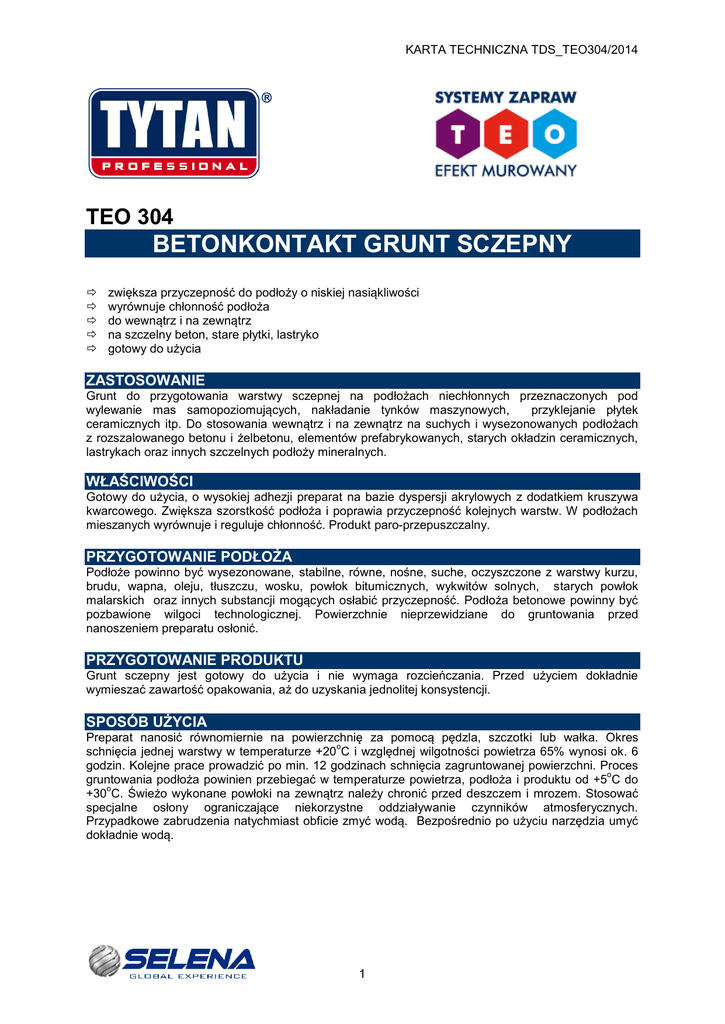 KARTA TECHNICZNA TDS_TEO304/2014 TEO 304 BETONKONTAKT GRUNT SCZEPNY zwiększa przyczepność do podłoży o niskiej nasiąkliwości wyrównuje chłonność podłoża do wewnątrz i na zewnątrz na szczelny beton, stare płytki, lastryko gotowy do użycia ZASTOSOWANIE Grunt do przygotowania warstwy sczepnej na podłożach niechłonnych przeznaczonych pod wylewanie mas samopoziomujących, nakładanie tynków maszynowych, przyklejanie płytek ceramicznych itp. Do stosowania wewnątrz i na zewnątrz na suchych i wysezonowanych podłożach z rozszalowanego betonu i żelbetonu, elementów prefabrykowanych, starych okładzin ceramicznych, lastrykach oraz innych szczelnych podłoży mineralnych. WŁAŚCIWOŚCI Gotowy do użycia, o wysokiej adhezji preparat na bazie dyspersji akrylowych z dodatkiem kruszywa kwarcowego. Zwiększa szorstkość podłoża i poprawia przyczepność kolejnych warstw. W podłożach mieszanych wyrównuje i reguluje chłonność. Produkt paro-przepuszczalny. PRZYGOTOWANIE PODŁOŻA Podłoże powinno być wysezonowane, stabilne, równe, nośne, suche, oczyszczone z warstwy kurzu, brudu, wapna, oleju, tłuszczu, wosku, powłok bitumicznych, wykwitów solnych, starych powłok malarskich oraz innych substancji mogących osłabić przyczepność. Podłoża betonowe powinny być pozbawione wilgoci technologicznej. Powierzchnie nieprzewidziane do gruntowania przed nanoszeniem preparatu osłonić. PRZYGOTOWANIE PRODUKTU Grunt sczepny jest gotowy do użycia i nie wymaga rozcieńczania. Przed użyciem dokładnie wymieszać zawartość opakowania, aż do uzyskania jednolitej konsystencji. SPOSÓB UŻYCIA Preparat nanosić równomiernie na powierzchnię za pomocą pędzla, szczotki lub wałka. Okres o schnięcia jednej warstwy w temperaturze +20 C i względnej wilgotności powietrza 65% wynosi ok. 6 godzin. Kolejne prace prowadzić po min. 12 godzinach schnięcia zagruntowanej powierzchni. Proces o gruntowania podłoża powinien przebiegać w temperaturze powietrza, podłoża i produktu od +5 C do o +30 C. Świeżo wykonane powłoki na zewnątrz należy chronić przed deszczem i mrozem. Stosować specjalne osłony ograniczające niekorzystne oddziaływanie czynników atmosferycznych. Przypadkowe zabrudzenia natychmiast obficie zmyć wodą. Bezpośrednio po użyciu narzędzia umyć dokładnie wodą. 1 KARTA TECHNICZNA TDS_TEO304/2014 ZUŻYCIE 2 Średnio zużywa się ok. 0,20-0,35 kg na 1m . Dokładne zużycie należy wyznaczyć poprzez dokonanie prób na danym podłożu. DANE TECHNICZNE temperatura stosowania (podłoża, powietrza, materiałów) o o od +5 C do +30 C 2 czas schnięcia ok. 0,20 – 0,35 kg na m w zależności od równości i nasiąkliwości podłoża. ok. 6 h możliwość nanoszenia kolejnej warstwy po 12 h od zagruntowania kolor wydajność z opakowania: 15 kg 7 kg biały zużycie 2 2 ok. 43 m do 75 m 2 2 ok. 20 m do 35 m SKŁADOWANIE I TRANSPORT Grunt należy przewozić i przechowywać w suchych warunkach i w oryginalnych, nie uszkodzonych o o opakowaniach w temperaturze od +5 C do +25 C. Chronić przed mrozem i bezpośrednim działaniem słońca. Tak przechowywany produkt posiada okres przydatności do użycia 12 miesiące. Opakowanie po otwarciu szczelnie zamknąć i pozostałą zawartość jak najszybciej zużyć ZGODNOŚĆ Z NORMAMI I WYMAGANIAMI JAKOŚCIOWYMI Produkt spełnia wymagania normy PN-C-81906. Aktualizacja 21.03.2014 Powyższe dane, zalecenia i wskazówki opierają się na naszej najlepszej wiedzy, badaniach oraz doświadczeniach i zostały udzielone w dobrej wierze zgodnie z zasadami obowiązującymi w naszej firmie i u naszych dostawców. Zaproponowane sposoby postępowania uznane są za powszechne, jednak każdy z użytkowników tego materiału powinien upewnić się na wszelkie możliwe sposoby, włącznie ze sprawdzeniem produktu końcowego w odpowiednich warunkach, o przydatności dostarczanych materiałów dla osiągnięcia celów przez niego zamierzonych. Ani Spółka, ani jej upoważnieni przedstawiciele nie mogą ponosić odpowiedzialności za jakiekolwiek straty poniesione na skutek nieprawidłowego, bądź błędnego użycia jej materiałów. 2