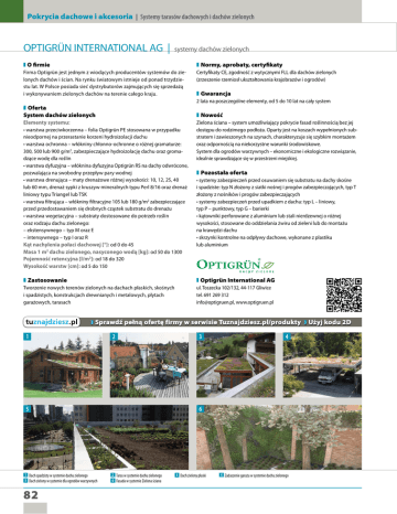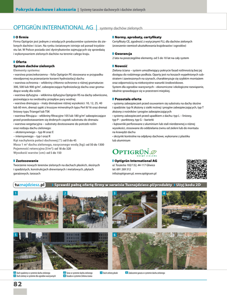 Pokrycia dachowe i akcesoria | Systemy tarasów dachowych i dachów zielonych OPTIGRÜN INTERNATIONAL AG | systemy dachów zielonych ❚ O firmie ❚ Normy, aprobaty, certyfikaty Firma Optigrün jest jednym z wiodących producentów systemów do zielonych dachów i ścian. Na rynku światowym istnieje od ponad trzydziestu lat. W Polsce posiada sieć dystrybutorów zajmujących się sprzedażą i wykonywaniem zielonych dachów na terenie całego kraju. Certyfikaty CE, zgodność z wytycznymi FLL dla dachów zielonych (zrzeszenie rzemiosł ukształtowania krajobrazów i ogrodów) ❚ Gwarancja 2 lata na poszczególne elementy, od 5 do 10 lat na cały system ❚ Oferta System dachów zielonych ❚ Nowość Elementy systemu: • warstwa przeciwkorzenna – folia Optigrün PE stosowana w przypadku nieodpornej na przerastanie korzeni hydroizolacji dachu • warstwa ochronna – włókniny chłonno-ochronne o różnej gramaturze: 300, 500 lub 900 g/m2, zabezpieczające hydroizolację dachu oraz gromadzące wodę dla roślin • warstwa dyfuzyjna – włóknina dyfuzyjna Optigrün RS na dachy odwrócone, pozwalająca na swobodny przepływ pary wodnej • warstwa drenująca – maty drenażowe różnej wysokości: 10, 12, 25, 40 lub 60 mm, drenaż sypki z kruszyw mineralnych typu Perl 8/16 oraz drenaż liniowy typu Triangel lub TSK • warstwa filtrująca – włókniny filtracyjne 105 lub 180 g/m2 zabezpieczające przed przedostawaniem się drobnych cząstek substratu do drenażu • warstwa wegetacyjna – substraty dostosowane do potrzeb roślin oraz rodzaju dachu zielonego: – ekstensywnego – typ M oraz E – intensywnego – typ I oraz R Kąt nachylenia połaci dachowej [°]: od 0 do 45 Masa 1 m2 dachu zielonego, nasyconego wodą [kg]: od 50 do 1300 Pojemność retencyjna [l/m2]: od 18 do 320 Wysokość warstw [cm]: od 5 do 150 Zielona ściana – system umożliwiający pokrycie fasad roślinnością bez jej dostępu do rodzimego podłoża. Oparty jest na koszach wypełnionych substratem i zawieszonych na szynach, charakteryzuje się szybkim montażem oraz odpornością na niekorzystne warunki środowiskowe. System dla ogrodów warzywnych – ekonomiczne i ekologiczne rozwiązanie, idealnie sprawdzające się w przestrzeni miejskiej. ❚ Zastosowanie ❚ Optigrün International AG Tworzenie nowych terenów zielonych na dachach płaskich, skośnych i spadzistych, konstrukcjach drewnianych i metalowych, płytach garażowych, tarasach ul. Toszecka 102/132, 44-117 Gliwice tel. 691 269 312 [email protected], www.optigruen.pl ❚ Pozostała oferta • systemy zabezpieczeń przed osuwaniem się substratu na dachy skośne i spadziste: typ N złożony z siatki nośnej i progów zabezpieczających, typ T złożony z nośników i progów zabezpieczających • systemy zabezpieczeń przed upadkiem z dachu: typ L – liniowy, typ P – punktowy, typ G – barierki • kątowniki perforowane z aluminium lub stali nierdzewnej o różnej wysokości, stosowane do oddzielania żwiru od zieleni lub do montażu na krawędzi dachu • skrzynki kontrolne na odpływy dachowe, wykonane z plastiku lub aluminium ❱ Sprawdź pełną ofertę firmy w serwisie Tuznajdziesz.pl/produkty ❱ Użyj kodu 2D 1 2 5 1 Dach spadzisty w systemie dachu zielonego 5 Dach zielony w systemie dla ogrodów warzywnych 82 3 4 6 2 Taras w systemie dachu zielonego 6 Fasada w systemie Zielona ściana 3 Dach zielony płaski 4 Zadaszenie garażu w systemie dachu zielonego