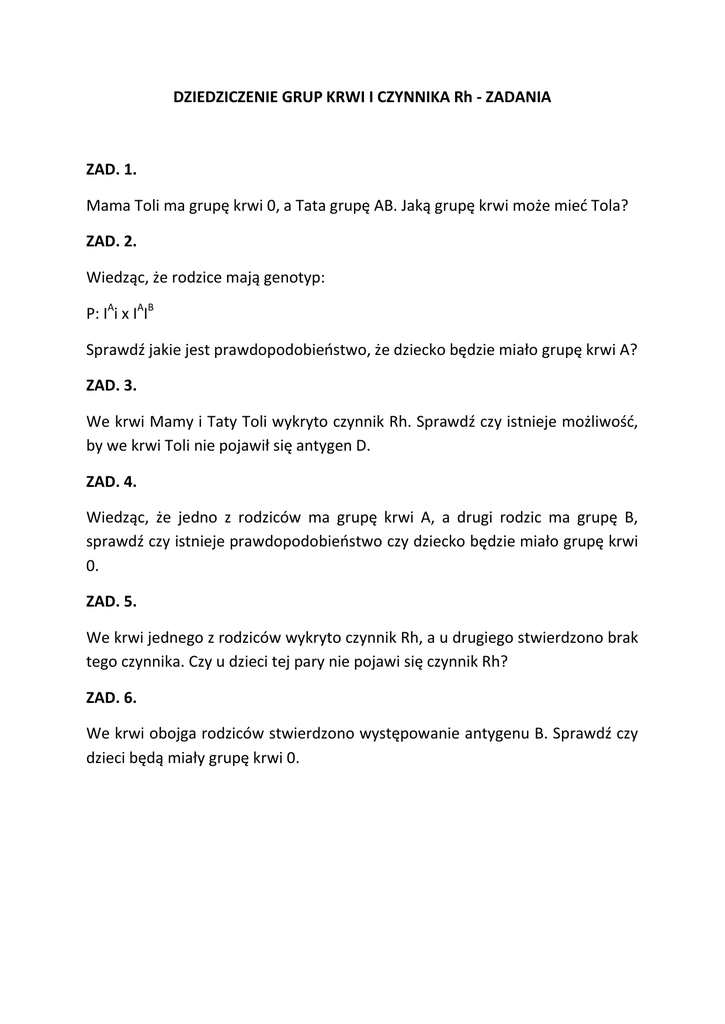 DZIEDZICZENIE GRUP KRWI I CZYNNIKA Rh - ZADANIA ZAD. 1. Mama Toli ma grupę krwi 0, a Tata grupę AB. Jaką grupę krwi może mieć Tola? ZAD. 2. Wiedząc, że rodzice mają genotyp: P: IAi x IAIB Sprawdź jakie jest prawdopodobieństwo, że dziecko będzie miało grupę krwi A? ZAD. 3. We krwi Mamy i Taty Toli wykryto czynnik Rh. Sprawdź czy istnieje możliwość, by we krwi Toli nie pojawił się antygen D. ZAD. 4. Wiedząc, że jedno z rodziców ma grupę krwi A, a drugi rodzic ma grupę B, sprawdź czy istnieje prawdopodobieństwo czy dziecko będzie miało grupę krwi 0. ZAD. 5. We krwi jednego z rodziców wykryto czynnik Rh, a u drugiego stwierdzono brak tego czynnika. Czy u dzieci tej pary nie pojawi się czynnik Rh? ZAD. 6. We krwi obojga rodziców stwierdzono występowanie antygenu B. Sprawdź czy dzieci będą miały grupę krwi 0. DZIEDZICZENIE CHORÓB ZWIĄZANYCH Z PŁCIĄ. ZADANIA ZAD. 1. Sprawdź jakie jest prawdopodobieństwo urodzenia się dziecka z hemofilią, jeżeli mama jest nosicielką, a tata jest zdrowy. ZAD. 2. Sprawdź jakie jest prawdopodobieństwo urodzenia się zdrowego dziecka, jeśli mama jest nosicielką genu warunkującego nieprawidłowe widzenie barw, a tata jest daltonistą. ZAD. 3. Tata Tosi jest chory na hemofilię, a mama jest zdrowa i nie jest nosicielką genu warunkującego zaburzenia krzepnięcia krwi. Sprawdź czy Tosia jest nosicielką hemofilii. ZAD. 4. Wiedząc, że rodzice Jasia nie rozróżniają barwy czerwonej i zielonej, sprawdź czy Jasio będzie daltonistą.