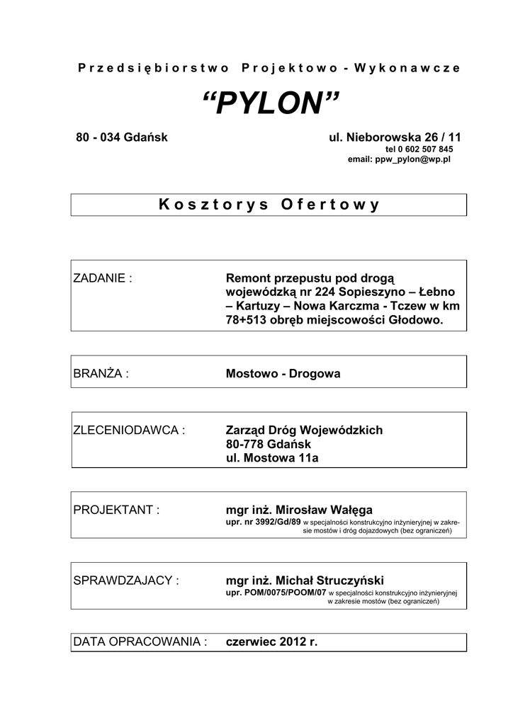 Przedsiębiorstwo Projektowo - Wykonawcze “PYLON” 80 - 034 Gdańsk ul. Nieborowska 26 / 11 tel 0 602 507 845 email: [email protected] Kosztorys Ofertowy ZADANIE : Remont przepustu pod drogą wojewódzką nr 224 Sopieszyno – Łebno – Kartuzy – Nowa Karczma - Tczew w km 78+513 obręb miejscowości Głodowo. BRANśA : Mostowo - Drogowa ZLECENIODAWCA : Zarząd Dróg Wojewódzkich 80-778 Gdańsk ul. Mostowa 11a PROJEKTANT : mgr inŜ. Mirosław Wałęga upr. nr 3992/Gd/89 w specjalności konstrukcyjno inŜynieryjnej w zakresie mostów i dróg dojazdowych (bez ograniczeń) SPRAWDZAJACY : mgr inŜ. Michał Struczyński upr. POM/0075/POOM/07 w specjalności konstrukcyjno inŜynieryjnej w zakresie mostów (bez ograniczeń) DATA OPRACOWANIA : czerwiec 2012 r. P.P. - W. "PYLON" Gdańsk Remont przepustu pod drogą wojewódzką nr 224 w km 78+513 obręb miejscowości Głodowo Kosztorys ofertowy Jednostka Lp. Nr SST Wyszczególnienie elementów rozliczeniowych Nazwa Ilość Cena Jednost. Łączna D.01.00.00. ROBOTY PRZYGOTOWAWCZE D.01.02.00. Roboty przygotowawcze D.01.02.04. Rozbiórka elmentów konstrukcji 1 Rozbiórka górnej powierzchni gzymsów ceglano betonowych z wywozem na wysypisko m3 1.7 2 Rozbiórka ścian czołowych z kamienia do poziomu góry sklepienia ze złoŜeniem na poboczu, do ponownego wbudowania m3 8.5 3 Rozbiórka balustrad stalowych z wywozem na złomowisko mb 10 4 Oczyszczenie powierzchni kamienno ceglanych z wywozem materiałów na wysypisko m2 47.8 D.06.00.00. ROBOTY WYKOŃCZENIOWE D.06.01.03. Umocnienie skarp 5 Umocnienie skarp i dna kamienną kostką na podsypce cem.-piask. gr. 10cm m2 46.1 6 Umocnienie skarp poprzez humusowanie gr. 10cm z obsianiem trawą m2 76.0 kpl 1 mb. 24.0 D.07.00.00. URZĄDZENIA BEZPIECZEŃSTWA RUCHU D.07.02.01. Oznakowanie pionowe 7 Wykonanie tymczasowej organizacji ruchu na czas budowy, utrzymanie jej przez okres budowy, rozbiórka po zakończeniu budowy D.07.05.01. Bariery ochronne stalowe 8 Bariery N2, W3, B ze słupkami kotwionymi w gruncie M.20.00.00. INNE ROBOTY MOSTOWE M.20.01.00. Roboty róŜne M.20.01.08. Przepust z rury HDPE 9 Wykonanie podsypki cementowo-- piask. zagęszczonej pod rurę przepustu m3 8.32 10 Wykonanie przepustu z rury HDPE φ1000 mb. 12.5 11 Wypełnienie przestrzeni między rurą i konstrukcją istniejącego przepustu betonem klasy C12/15 m3 17.7 12 Wykonanie ławy gr. 20cm z betonu C12/15 pod projektowaną kamienną ściankę czołową i skrzydełka m3 1.8 13 Wykonanie ścianki czołowej i skrzydełek z kamienia z rozbiórki m3 8.1 14 Wykonanie zasypki nad rurą przepustu poza istniejącą konstrukcją z profilowaniem i wykonaniem skarp m3 86 Razem [PLN] VAT …...% OGÓŁEM [PLN] Słownie:………………………………………………………………………………………………………………………………………… Remont przepustu w miejscowości Głodowo 1