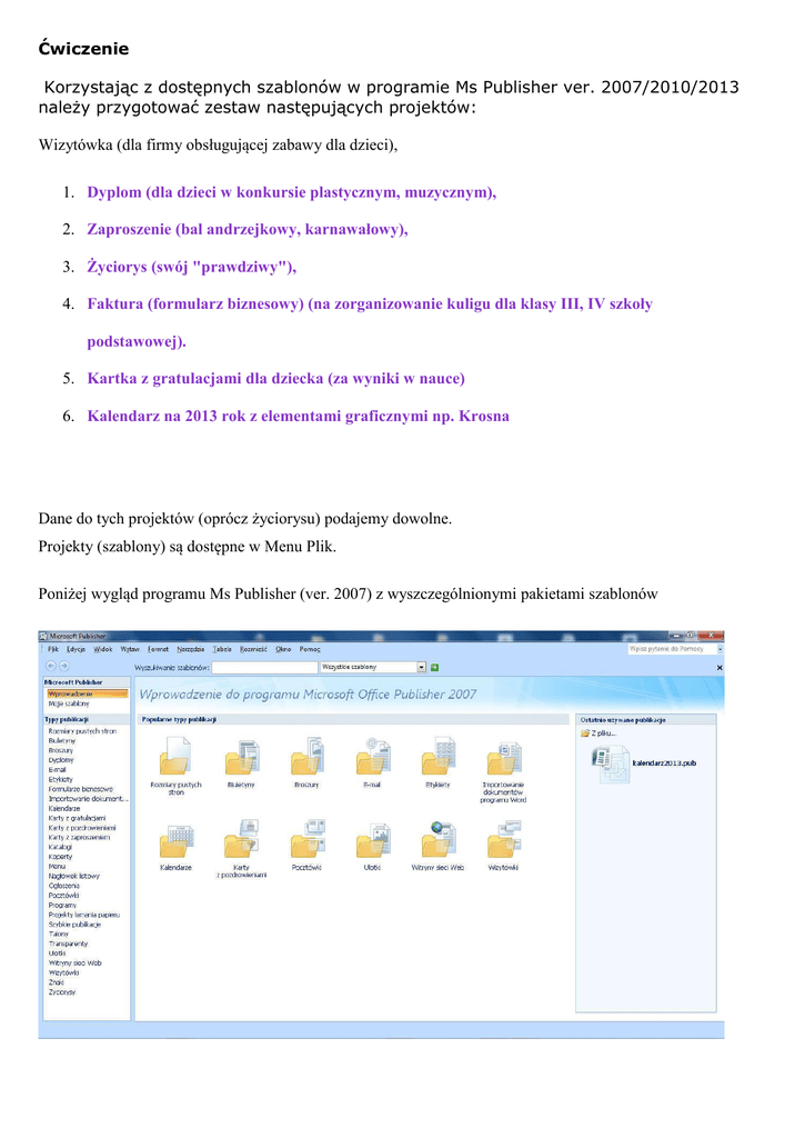 Ćwiczenie Korzystając z dostępnych szablonów w programie Ms Publisher ver. 2007/2010/2013 należy przygotować zestaw następujących projektów: Wizytówka (dla firmy obsługującej zabawy dla dzieci), 1. Dyplom (dla dzieci w konkursie plastycznym, muzycznym), 2. Zaproszenie (bal andrzejkowy, karnawałowy), 3. Życiorys (swój "prawdziwy"), 4. Faktura (formularz biznesowy) (na zorganizowanie kuligu dla klasy III, IV szkoły podstawowej). 5. Kartka z gratulacjami dla dziecka (za wyniki w nauce) 6. Kalendarz na 2013 rok z elementami graficznymi np. Krosna Dane do tych projektów (oprócz życiorysu) podajemy dowolne. Projekty (szablony) są dostępne w Menu Plik. Poniżej wygląd programu Ms Publisher (ver. 2007) z wyszczególnionymi pakietami szablonów i wygląd programu w najnowszej wersji 2013