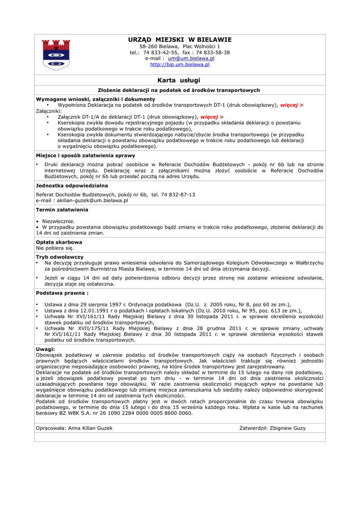 URZĄD MIEJSKI W BIELAWIE Karta usługi