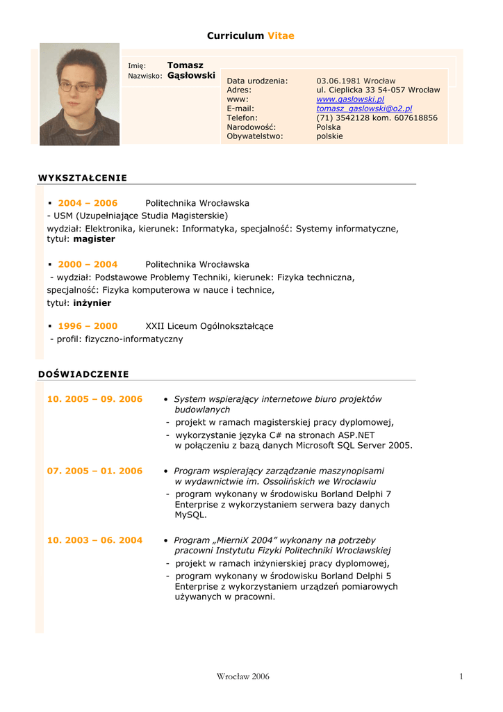 Curriculum Vitae Imię: Nazwisko: Tomasz Gąsłowski Data urodzenia: Adres: www: E-mail: Telefon: Narodowość: Obywatelstwo: 03.06.1981 Wrocław ul. Cieplicka 33 54-057 Wrocław www.gaslowski.pl [email protected] (71) 3542128 kom. 607618856 Polska polskie WYKSZTAŁCENIE 2004 – 2006 Politechnika Wrocławska - USM (Uzupełniające Studia Magisterskie) wydział: Elektronika, kierunek: Informatyka, specjalność: Systemy informatyczne, tytuł: magister 2000 – 2004 Politechnika Wrocławska - wydział: Podstawowe Problemy Techniki, kierunek: Fizyka techniczna, specjalność: Fizyka komputerowa w nauce i technice, tytuł: inżynier 1996 – 2000 XXII Liceum Ogólnokształcące - profil: fizyczno-informatyczny DOŚWIADCZENIE 10. 2005 – 09. 2006 • System wspierający internetowe biuro projektów budowlanych - projekt w ramach magisterskiej pracy dyplomowej, - wykorzystanie języka C# na stronach ASP.NET w połączeniu z bazą danych Microsoft SQL Server 2005. 07. 2005 – 01. 2006 • Program wspierający zarządzanie maszynopisami w wydawnictwie im. Ossolińskich we Wrocławiu - program wykonany w środowisku Borland Delphi 7 Enterprise z wykorzystaniem serwera bazy danych MySQL. 10. 2003 – 06. 2004 • Program „MierniX 2004” wykonany na potrzeby pracowni Instytutu Fizyki Politechniki Wrocławskiej - projekt w ramach inżynierskiej pracy dyplomowej, - program wykonany w środowisku Borland Delphi 5 Enterprise z wykorzystaniem urządzeń pomiarowych używanych w pracowni. Wrocław 2006 1 Curriculum Vitae DODATKOWE KWALIFIKACJE Prawo jazdy kategorii B Podstawowe umiejętności w zarządzaniu serwerami opartymi na systemie Microsoft Windows 2003 Server Professional (domeny, jednostki organizacyjne, grupy użytkowników, usługa Active Directory) Podstawy systemu Linux Narzędzia programistyczne i języki programowania: C#, Borland Delphi (Object Pascal), Turbo Pascal 7.0, Microsoft Fortran 77/90, C/C++ Inne języki skryptowe i umiejętności: PHP, ASP.NET, SQL, HTML, CSS, JavaScript Bazy danych: MySQL 3.22/3.23/4, Microsoft SQL Server 2005, InterBase 6.x, Paradox, Sybase AS Anywhere 8.0, Microsoft Access 95 & 97/2000 Podstawy języka UML (wykorzystywanie środowiska Sybase PowerDesigner 9/11 do wizualizacji i tworzenia diagramów przypadków użycia, sekwencji, itp.) Programy użytkowe: pakiet Microsoft Office (Word, Excel, PowerPoint, FrontPage), Adobe Photoshop 7/CSS/CSS2, podstawy Macromedia Flash MX, Macromedia Dreamweaver MX, AutoCAD 11/14/2002, CATIA R5 (modelowanie elementów konstrukcyjnych) JĘZYKI Angielski: w mowie – komunikatywny, w piśmie - dobry Niemiecki: w mowie – komunikatywny, w piśmie - dobry ZAINTERESOWANIA Piłka nożna, a w szczególności jej aktywne uprawianie Jazda na rowerze, różnego rodzaju wycieczki krajowe i zagraniczne Muzyka Wyrażam zgodę na przetwarzanie moich danych osobowych dla potrzeb niezbędnych do realizacji procesu rekrutacyjnego, zgodnie z przepisami ustawy z 29.08.1997 o ochronie danych osobowych (Dz.U. z 2002 r. Nr 101, poz. 926 z poź. zm.) Wrocław 2006 2