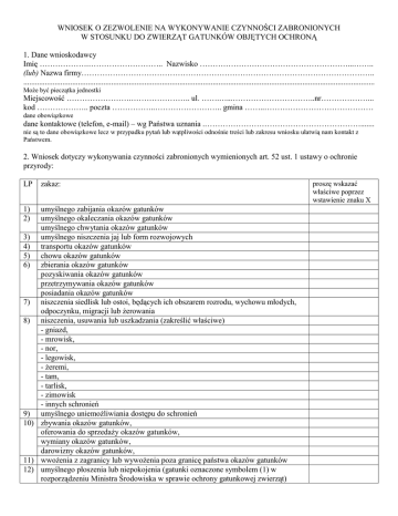 WNIOSEK O ZEZWOLENIE NA WYKONYWANIE CZYNNOŚCI ZABRONIONYCH W STOSUNKU DO ZWIERZĄT GATUNKÓW OBJĘTYCH OCHRONĄ 1. Dane wnioskodawcy Imię ……………….……………………….. Nazwisko …………………………………………………...…….. (lub) Nazwa firmy………………………………………………………………………………………………….. .................................................................................................................................................................................... Może być pieczątka jednostki Miejscowość …………………….………………….. ul. …….…...…………………………..nr………………... kod ……………….. poczta ……………..…………………….. gmina ……..…………………………………… dane obowiązkowe dane kontaktowe (telefon, e-mail) – wg Państwa uznania .……………………………………………………....... nie są to dane obowiązkowe lecz w przypadku pytań lub wątpliwości odnośnie treści lub zakresu wniosku ułatwią nam kontakt z Państwem. 2. Wniosek dotyczy wykonywania czynności zabronionych wymienionych art. 52 ust. 1 ustawy o ochronie przyrody: LP zakaz: umyślnego zabijania okazów gatunków umyślnego okaleczania okazów gatunków umyślnego chwytania okazów gatunków 3) umyślnego niszczenia jaj lub form rozwojowych 4) transportu okazów gatunków 5) chowu okazów gatunków 6) zbierania okazów gatunków pozyskiwania okazów gatunków przetrzymywania okazów gatunków posiadania okazów gatunków 7) niszczenia siedlisk lub ostoi, będących ich obszarem rozrodu, wychowu młodych, odpoczynku, migracji lub żerowania 8) niszczenia, usuwania lub uszkadzania (zakreślić właściwe) - gniazd, - mrowisk, - nor, - legowisk, - żeremi, - tam, - tarlisk, - zimowisk - innych schronień 9) umyślnego uniemożliwiania dostępu do schronień 10) zbywania okazów gatunków, oferowania do sprzedaży okazów gatunków, wymiany okazów gatunków, darowizny okazów gatunków, 11) wwożenia z zagranicy lub wywożenia poza granicę państwa okazów gatunków 12) umyślnego płoszenia lub niepokojenia (gatunki oznaczone symbolem (1) w rozporządzeniu Ministra Środowiska w sprawie ochrony gatunkowej zwierząt) 1) 2) proszę wskazać właściwe poprzez wstawienie znaku X 13) umyślnego płoszenia lub niepokojenia w miejscach noclegu, w okresie lęgowym w miejscach rozrodu lub wychowu młodych lub w miejscach żerowania zgrupowań ptaków migrujących lub zimujących (gatunki oznaczone symbolem (2) w rozporządzeniu Ministra Środowiska w sprawie ochrony gatunkowej zwierząt) 14) fotografowania mogącego powodować płoszenie lub niepokojenie filmowania mogącego powodować płoszenie lub niepokojenie obserwacji mogącej powodować płoszenie lub niepokojenie (gatunki oznaczone symbolem (3) w rozporządzeniu Ministra Środowiska w sprawie ochrony gatunkowej zwierząt) 15) umyślnego przemieszczania z miejsc regularnego przebywania na inne miejsca 16) umyślnego wprowadzania do środowiska przyrodniczego Wniosek dotyczy osobników dziko występujących: Tak Nie (wniosek dotyczy osobników innych niż dziko występujące) 3) Nazwa gatunkowa i liczba lub ilość osobników W przypadku wniosku dotyczącego więcej niż jednego gatunku należy podać liczbę lub ilość w rozbiciu na każdy gatunek. W przypadku braku możliwości określenia liczby lub ilości jakiej dotyczy wniosek wpisać brak możliwości określenia i dlaczego nie jest to możliwe. Gatunek…………..………………………………………Ilość:………………………………………………… Gatunek…………..………………………………………Ilość:………………………………………………… Gatunek…………..………………………………………Ilość:………………………………………………… W przypadku pozyskania wskazać czy wniosek dotyczy pozyskania osobników w całości lub w części Jeśli wniosek dotyczy produktów pochodnych proszę podać jakich:……………..……………………………… .................................................................................................................................................................................. Jeśli wniosek nie dotyczy pozyskania wpisać nie dotyczy 4) Miejsce i czas realizacji zezwolenia podać miejsca możliwie najdokładniej np. północna część jeziora............, powiat........, działka nr ... Obr ... gmina...; w przypadku pozyskania ślimaka winniczka podać lokalizację punktów skupu w tym punktów objazdowych; w przypadku przetrzymywania okazów spreparowanych podać miejsce ich przechowywania. W uzasadnionych przypadkach dołączyć załącznik mapowy. Miejsce:……………………………………………………………………………………………………......…… .………………………………………………………………………………………………………….….….…… ……………………………………………………………………………………………………………………… Termin realizacji zezwolenia: od …………………………………………………...........do…………………..………………………………… W przypadku wykonywania czynności w różnych miejscach i w czasie w stosunku do innych gatunków podać ww. informacje w rozbiciu na poszczególne gatunki. Gatunek ..................................................................................................................................................................... Miejsce:……………………………………………………………………………………………………......…… .…………………………………………………………