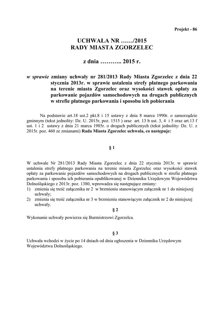 Projekt - 86 UCHWAŁA NR ……/2015 RADY MIASTA ZGORZELEC z dnia ……….. 2015 r. w sprawie zmiany uchwały nr 281/2013 Rady Miasta Zgorzelec z dnia 22 stycznia 2013r. w sprawie ustalenia strefy płatnego parkowania na terenie miasta Zgorzelec oraz wysokości stawek opłaty za parkowanie pojazdów samochodowych na drogach publicznych w strefie płatnego parkowania i sposobu ich pobierania Na podstawie art.18 ust.2 pkt.8 i 15 ustawy z dnia 8 marca 1990r. o samorządzie gminnym (tekst jednolity: Dz. U. 2015r, poz. 1515 ) oraz art. 13 b ust. 3, 4 i 5 oraz art.13 f ust. 1 i 2 ustawy z dnia 21 marca 1985r. o drogach publicznych (tekst jednolity: Dz. U. z 2015r. poz. 460 ze zmianami) Rada Miasta Zgorzelec uchwala, co następuje: §1 W uchwale Nr 281/2013 Rady Miasta Zgorzelec z dnia 22 stycznia 2013r. w sprawie ustalenia strefy płatnego parkowania na terenie miasta Zgorzelec oraz wysokości stawek opłaty za parkowanie pojazdów samochodowych na drogach publicznych w strefie płatnego parkowania i sposobu ich pobierania opublikowanej w Dzienniku Urzędowym Województwa Dolnośląskiego z 2013r. poz. 1380, wprowadza się następujące zmiany: 1) zmienia się treść załącznika nr 2 w brzmieniu stanowiącym załącznik nr 1 do niniejszej uchwały; 2) zmienia się treść załącznika nr 3 w brzmieniu stanowiącym załącznik nr 2 do niniejszej uchwały. §2 Wykonanie uchwały powierza się Burmistrzowi Zgorzelca. §3 Uchwała wchodzi w życie po 14 dniach od dnia ogłoszenia w Dzienniku Urzędowym Województwa Dolnośląskiego. Załącznik nr 1 do Uchwały Nr ............. Rady Miasta Zgorzelec z dnia ........................ Wysokość opłat za czas parkowania pojazdów samochodowych: 0,50zł do 30 min 2,00zł od 30 min do 60 min 2,40zł druga godzina 2,80zł trzecia godzina 2,00zł czwarta i każda kolejna godzina 12,00zł opłata za parkowanie w czasie funkcjonowania strefy płatnego parkowania 15,00zł miesięczny abonament typu „M” * za 1 pojazd (pierwszy) 150,00zł roczny abonament typu „M” * za 1 pojazd (pierwszy) 30,00zł miesięczny abonament typu „M” * za 2 pojazd (drugi) 300,00zł roczny abonament typu „M” * za 2 pojazd (drugi) 75,00zł miesięczny abonament typu „M” * za 3 i kolejny pojazd (trzeci i kolejny) 750,00zł. roczny abonament typu „M” * za 3 i kolejny pojazd (trzeci i kolejny) 100,00zł miesięczny abonament typu „O” ** wydawany na okaziciela 1000,00zł 15,00zł roczny abonament typu „O” ** wydawany na okaziciela miesięczny abonament typu „P” *** za 1 pojazd (pierwszy) 150,00zł roczny abonament typu „P” *** za 1 pojazd (pierwszy) 30,00zł miesięczny abonament typu „P” *** za 2 pojazd (drugi) 300,00zł roczny abonament typu „P” *** za 2 pojazd (drugi) 75,00zł miesięczny abonament typu „P” *** za 3 i kolejny pojazd (trzeci i kolejny) 750,00zł roczny abonament typu „P” *** za 3 i kolejny pojazd (trzeci i kolejny) 700,00zł zastrzeżenie stanowiska parkingowego - "koperty" w okresie miesięcznym. Objaśnienia: abonament typu „M” – wydawany na numer rejestracyjny dla pojazdu samochodowego osoby fizycznej zameldowanej na pobyt stały w na obszarze SPP lub posiadającej tytuł prawny do lokalu mieszkalnego zlokalizowanego na obszarze strefy płatnego parkowania, ** abonament typu „O” – wydawany na numer rejestracyjny dla pojazdu samochodowego dowolnego użytkownika drogi, *** abonament typu „P” – wydawany na numer rejestracyjny dla pojazdu samochodowego przedsiębiorcy posiadającego tytuł prawny do lokalu użytkowego zlokalizowanego na obszarze strefy płatnego parkowania. * Załącznik nr 2 do Uchwały Nr ............. Rady Miasta Zgorzelec z dnia ............................ r. REGULAMIN STREFY PŁATNEGO PARKOWANIA Regulamin niniejszy określa zasady funkcjonowania Strefy Płatnego Parkowania w Zgorzelcu. Użyty w Regulaminie skrót SPP – oznacza Strefę Płatnego Parkowania Rozdział I Przepisy ogólne §1 1. Ograniczenie parkowania polega na obowiązku wnoszenia opłat za czas postoju pojazdów w strefie płatnego parkowania w dni robocze od poniedziałku do piątku w godz. od 8 00 do 17 00 z wyłączeniem dni ustawowo wolnych od pracy. 2. Prawidłowy czas postoju, jest to możliwy do stwierdzenia, udokumentowany, opłacony czas parkowania samochodu w SPP. 3. Nieprawidłowy (nieopłacony) czas parkowania to stwierdzony czas pomiędzy wystawionym zawiadomieniem o nieopłaconym parkowaniu samochodu w SPP, a obowiązkiem uiszczenia opłaty. 4. Obsługa SPP odbywa się za pomocą Operatora SPP, upoważnionego przez Burmistrza Zgorzelca. §2 1. Wjazd do obszaru SPP oznakowany jest znakiem D-44 "strefa płatnego parkowania", natomiast wyjazd - znakiem D-45 "koniec strefy płatnego parkowania". 2. Parkowanie płatne niestrzeżone w obszarze SPP obejmuje wszystkie, ogólnodostępne miejsca postojowe w pasach drogowych dróg gminnych z wyłączeniem postojów taksówek i dotyczy: 1) przy krawężnikowego parkowania na ulicach oznaczonych znakiem D-18 "parking", a w przypadku innego sposobu ustawienia pojazdów również odpowiednią tabliczką T – 30; 2) parkowania na parkingach wydzielonych z wyłączeniem parkingów zakładowych, prywatnych i osiedlowych. §3 Opłaty za czas postoju uiszcza się poprzez: 1) samoobsługowy system biletów parkingowych (automaty parkingowe): a) monetami – opłaty naliczane są w sposób liniowy po wniesieniu opłaty minimalnej w wysokości 0,50 zł za pierwsze pół godziny parkowania’ 2) opłaty abonamentowe – wnoszone za cały miesiąc lub jego wielokrotność. Czas obowiązywania abonamentu obejmuje pełne miesiące; 3) telefon komórkowy - opłaty naliczane są za rzeczywisty czas parkowania. §4 Ustala się zerową stawkę opłaty za parkowanie w SPP dla następujących użytkowników dróg w SPP: 1) osób niepełnosprawnych legitymujących się kartą parkingową, kierujących pojazdami samochodowymi oznaczonymi tą kartą, kierującymi pojazdami, 