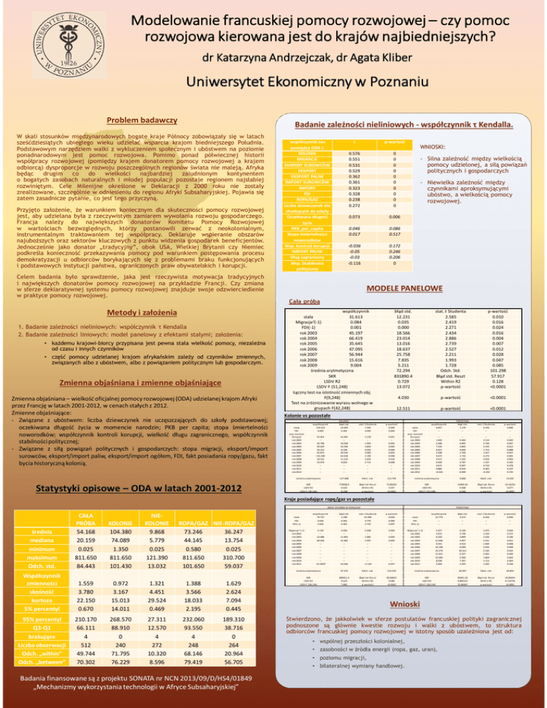 Modelowanie francuskiej pomocy rozwojowej – czy pomoc rozwojowa kierowana jest do krajów najbiedniejszych? dr Katarzyna Andrzejczak, dr Agata Kliber Uniwersytet Ekonomiczny w Poznaniu Problem badawczy Badanie zależności nieliniowych - współczynnik τ Kendalla. W skali stosunków międzynarodowych bogate kraje Północy zobowiązały się w latach sześćdziesiątych ubiegłego wieku udzielać wsparcia krajom biedniejszego Południa. Podstawowym narzędziem walki z wykluczeniem społecznym i ubóstwem na poziomie ponadnarodowym jest pomoc rozwojowa. Pomimo ponad półwiecznej historii współpracy rozwojowej (pomiędzy krajem donatorem pomocy rozwojowej a krajem odbiorcą) dysproporcje w rozwoju poszczególnych regionów świata nie maleją. Afryka będąc drugim co do wielkości najbardziej zaludnionym kontynentem o bogatych zasobach naturalnych i młodej populacji pozostaje regionem najsłabiej rozwiniętym. Cele Milenijne określone w Deklaracji z 2000 roku nie zostały zrealizowane, szczególnie w odniesieniu do regionu Afryki Subsaharyjskiej. Pojawia się zatem zasadnicze pytanie, co jest tego przyczyną. Przyjęto założenie, że warunkiem koniecznym dla skuteczności pomocy rozwojowej jest, aby udzielana była z rzeczywistym zamiarem wywołania rozwoju gospodarczego. Francja należy do największych donatorów Komitetu Pomocy Rozwojowej w wartościach bezwzględnych, którzy postanowili zerwać z neokolonialnym, instrumentalnym traktowaniem tej współpracy. Deklaruje wspieranie obszarów najuboższych oraz sektorów kluczowych z punktu widzenia gospodarek beneficjentów. Jednocześnie jako donator „tradycyjny”, obok USA, Wielkiej Brytanii czy Niemiec podkreśla konieczność przekazywania pomocy pod warunkiem postępowania procesu demokratyzacji u odbiorców borykających się z problemami braku funkcjonujących i podstawowych instytucji państwa, ograniczonych praw obywatelskich i korupcji. współczynnik tau pomiędzy ODA i: KOLONIE MIGRACJE EKSPORT SUROWCÓW EKSPORT EKSPORT PALIW IMPORT SUROWCÓW IMPORT FDI ROPA/GAZ Liczba dziewczynek nie chodzących do szkoły Oczekiwana długość życia PKB_per_capita Stopa śmiertelności noworodków Wsp. Kontroli korupcji IMPORT PALIW Dług zagraniczny Wsp. Stabilności politycznej τ p-wartość 0.576 0.551 0.531 0.529 0.362 0.361 0.323 0.328 0.238 0.272 0 0 0 0 0 0 0 0 0 0 0.073 0.006 0.046 0.017 0.086 0.517 -0.036 -0.05 -0.03 -0.116 0.172 0.246 0.206 0 WNIOSKI: Celem badania było sprawdzenie, jaka jest rzeczywista motywacja tradycyjnych i największych donatorów pomocy rozwojowej na przykładzie Francji. Czy zmiana w sferze deklaratywnej systemu pomocy rozwojowej znajduje swoje odzwierciedlenie w praktyce pomocy rozwojowej. - Silna zależność między wielkością pomocy udzielonej, a siłą powiązań politycznych i gospodarczych - Niewielka zależność między czynnikami aproksymującymi ubóstwo, a wielkością pomocy rozwojowej. MODELE PANELOWE Cała próba Metody i założenia 1. Badanie zależności nieliniowych: współczynnik τ Kendalla 2. Badanie zależności liniowych: model panelowy z efektami stałymi; założenia: • każdemu krajowi-biorcy przypisana jest pewna stała wielkość pomocy, niezależna od czasu i innych czynników • część pomocy udzielanej krajom afrykańskim zależy od czynników zmiennych, związanych albo z ubóstwem, albo z powiązaniem politycznym lub gospodarczym. Zmienna objaśniana i zmienne objaśniające Zmienna objaśniana – wielkość oficjalnej pomocy rozwojowej (ODA) udzielanej krajom Afryki przez Francję w latach 2001-2012, w cenach stałych z 2012. Zmienne objaśniające: - Związane z ubóstwem: liczba dziewczynek nie uczęszczających do szkoły podstawowej; oczekiwana długość życia w momencie narodzin; PKB per capita; stopa śmiertelności noworodków; współczynnik kontroli korupcji, wielkość długu zagranicznego, współczynnik stabilności politycznej; - Związane z siłą powiązań politycznych i gospodarczych: stopa migracji, eksport/import surowców, eksport/import paliw, eksport/import ogółem, FDI, fakt posiadania ropy/gazu, fakt bycia historyczną kolonią. Statystyki opisowe – ODA w latach 2001-2012 współczynnik stała 31.613 Migracje2(-1) 0.084 FDI(-1) 0.001 rok 2003 45.197 rok 2004 66.419 rok 2005 35.645 rok 2006 47.095 rok 2007 56.944 rok 2008 15.616 rok 2009 9.004 średnia arytmetyczna SKR LSDV R2 LSDV F (51,248) Łączny test na istotność zmiennych obj. F(9,248) Test na zróżnicowanie wyrazu wolnego w grupach F(42,248) błąd std. 12.231 0.035 0.000 18.566 23.014 13.016 18.637 25.758 7.835 5.211 72.294 831890.4 0.729 13.072 stat. t Studenta 2.585 2.419 2.271 2.434 2.886 2.739 2.527 2.211 1.993 1.728 Odch. Std. Błąd std. Reszt Within R2 p-wartość p-wartość 0.010 0.016 0.024 0.016 0.004 0.007 0.012 0.028 0.047 0.085 101.298 57.917 0.128 <0.0001 4.030 p-wartość <0.0001 12.511 p-wartość <0.0001 Kolonie vs pozostałe s ta ła FDI ws p. kontroli korupcji rok 2002 rok 2003 rok 2004 rok 2005 rok 2006 rok 2007 rok 2008 rok 2009 rok 2010 rok 2011 rok 2012 ws półczynnik 142.523 0.002 KOLONIE błąd s td. 19.405 0.001 s ta t. t Studenta 7.345 4.050 p-wa rtoś ć 0.000 0.000 91.401 -50.796 95.029 33.212 62.872 131.500 29.531 23.976 ---- 41.962 -16.958 33.296 8.196 20.544 62.618 11.233 8.832 ---- 2.178 -2.995 2.854 4.052 3.060 2.100 2.629 2.715 ---- 0.031 -0.003 0.005 0.000 0.003 0.038 0.010 0.008 ---- s ta ła FDI ws p. kontroli korupcji rok 2002 rok 2003 rok 2004 rok 2005 rok 2006 rok 2007 rok 2008 rok 2009 rok 2010 rok 2011 rok 2012 ws półczynnik 6.457 -- POZOSTAŁE błąd s td. 1.179 -- s ta t. t Studenta 5.476 -- p-wa rtoś ć 0.000 -- -1.444 2.286 7.234 6.921 5.308 5.673 4.311 6.400 0.672 0.884 −0.320 -0.462 0.845 2.845 4.040 2.769 1.733 1.423 4.787 0.947 0.919 0.909 -3.124 2.706 2.543 1.713 1.917 3.273 3.029 1.337 0.710 0.962 −0.352 -0.002 0.007 0.012 0.088 0.057 0.001 0.003 0.183 0.478 0.337 0.725 ś rednia a rytmetyczna 12