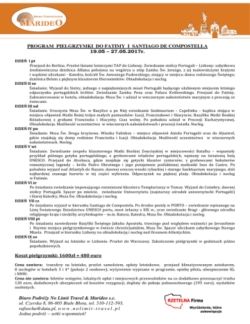 PROGRAM PIELGRZYMKI DO FATIMY I SANTIAGO DE COMPOSTELLA 19.05 – 27.05.2017r. DZIEŃ I pt Przejazd do Berlina. Przelot liniami lotniczymi TAP do Lizbony. Zwiedzanie stolicy Portugali – Lizbony: zabytkowa średniowieczna dzielnica Alfama położona na wzgórzu u stóp Zamku Św. Jerzego, z jej malowniczymi krętymi i wąskimi uliczkami - Katedra, kościół Św. Antoniego Padewskiego, stojący w miejscu domu rodzinnego Świętego; dzielnica Belem z pięknym klasztorem Hieronimitów. Obiadokolacja i nocleg. DZIEŃ II so Śniadanie. Wyjazd do Sintry, jednego z najpiękniejszych miast Portugalii będącego ulubionym miejscem letniego odpoczynku portugalskich królów. Zwiedzanie Zamku Pena oraz Pałacu Królewskiego. Przejazd do Fatimy. Zakwaterowanie w hotelu, obiadokolacja. Msza Św. i udział w wieczornym nabożeństwie maryjnym z procesją ze świecami. DZIEŃ III nd Śniadanie. Uroczysta Msza Św. w Bazylice a po Niej zwiedzanie Sanktuarium – Capelinha – kaplica stojąca w miejscu objawień Matki Bożej trójce małych pastuszków: Łucji, Franciszkowi i Hiacyncie; Bazylika Matki Boskiej Różańcowej z grobami Franciszka i Hiacynty. Czas wolny. Po południu udział w Procesji Eucharystycznej. Obiadokolacja. Możliwość uczestnictwa w wieczornych nabożeństwach i procesji światła. Nocleg. DZIEŃ IV pn Śniadanie. Msza Św. Droga krzyżowa. Wioska Valinhos – miejsce objawień Anioła Portugalii oraz do Aljustrel, gdzie znajdują się domy rodzinne Franciszka i Łucji. Obiadokolacja. Możliwość uczestnictwa w wieczornych nabożeństwach. Nocleg. DZIEŃ V wt Śniadanie. Zwiedzanie zespołu klasztornego Matki Boskiej Zwycięskiej w miejscowości Batalha – wspaniały przykład późnego gotyku portugalskiego, z grobowcami władców portugalskich, wpisany na światową listę UNESCO. Przejazd do Alcobaca, gdzie znajduje się gotycki klasztor cystersów, z grobowcami bohaterów romantycznej legendy – króla Pedro Okrutnego i jego potajemnie poślubionej małżonki Ines de Castro. Po południu wyjazd nad Atlantyk do Nazare, dawnej uroczej wioski rybackiej i starego Sanktuarium maryjnego, dziś najbardziej znanego kurortu w tej części wybrzeża. Odpoczynek na pięknej plaży. Obiadokolacja i nocleg w Fatimie. DZIEŃ VI śr Po śniadaniu zwiedzanie imponującego rozmiarami klasztoru Templariuszy w Tomar. Wyjazd do Coimbry, dawnej stolicy Portugalii. Spacer po mieście, zwiedzanie Uniwersytetu (najstarszy ośrodek uniwersytecki Portugalii) i Starej Katedry, Msza Św. Obiadokolacja i nocleg. DZIEŃ VII cz Po śniadaniu wyjazd w kierunku Santiago de Compostela. Po drodze postój w PORTO – zwiedzanie wpisanego na Listę Światowego Dziedzictwa UNESCO portu, most żelazny z XIX w., oraz zwiedzanie Bragi - głównego ośrodka religijnego kraju i siedziby arcybiskupów – m.in. Ratusz, Katedra, Msza Św. Obiadokolacja i nocleg. DZIEŃ VIII pt Po śniadaniu nawiedzenie Bazyliki Świętego Jakuba Apostoła, trzeciego pod względem ważności po Jerozolimie i Rzymie miejsca pielgrzymkowego w świecie chrześcijańskim, Msza Św. Spacer uliczkami zabytkowego Starego Miasta. Przejazd w kierunku Lizbony na obiadokolację i nocleg nad Oceanem Atlantyckim. DZIEŃ IX so Śniadanie. Wyjazd na lotnisko w Lizbonie. Przelot do Warszawy. Zakończenie pielgrzymki w godzinach późno popołudniowych. Koszt pielgrzymki: 1600zł + 480 euro Cena zawiera: transfery na lotnisko, przelot samolotem, opłaty lotniskowe, przejazd klimatyzowanym autokarem, 8 noclegów w hotelach 3 i 4* (pokoje 2 osobowe), wyżywienie wypisane w programie, opiekę pilota, ubezpieczenie KL i NNW; Cena nie zawiera: biletów wstępów, lokalnych opłat i miejscowych przewodników na co dodatkowo przeznaczyć trzeba 120 euro, dodatkowych ubezpieczeń od kosztów rezygnacji, dopłaty do pokoju jednoosobowego (195 euro), wydatków osobistych. Biuro Podróży No Limit Travel & Marideo s.c. ul. Czerska 8, 86-005 Białe Błota, tel. 510-112-593, [email protected], w w w . n o l i m i t - t r a v e l . p l Jedna podróż – setki wspomnień!