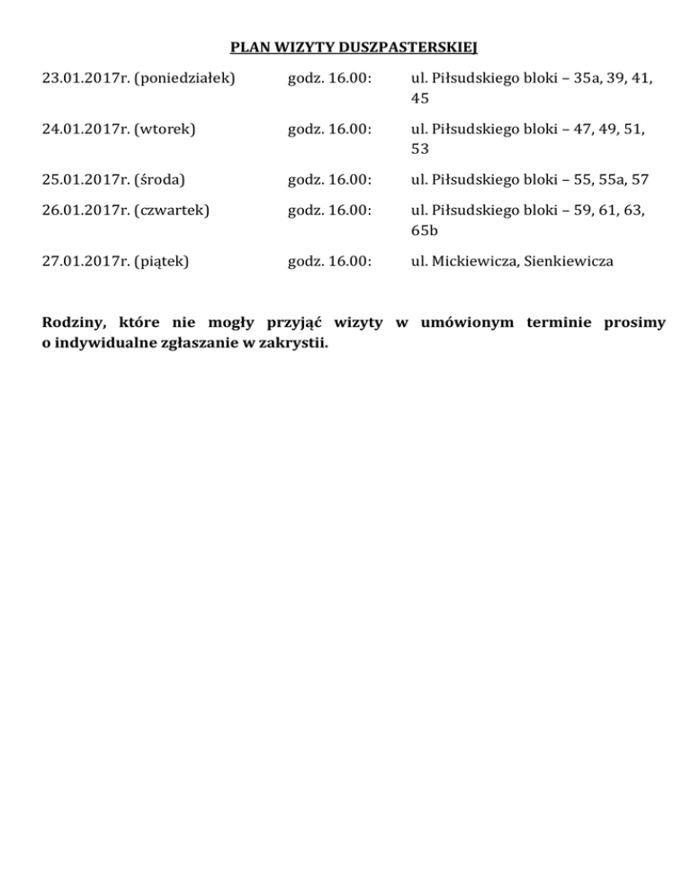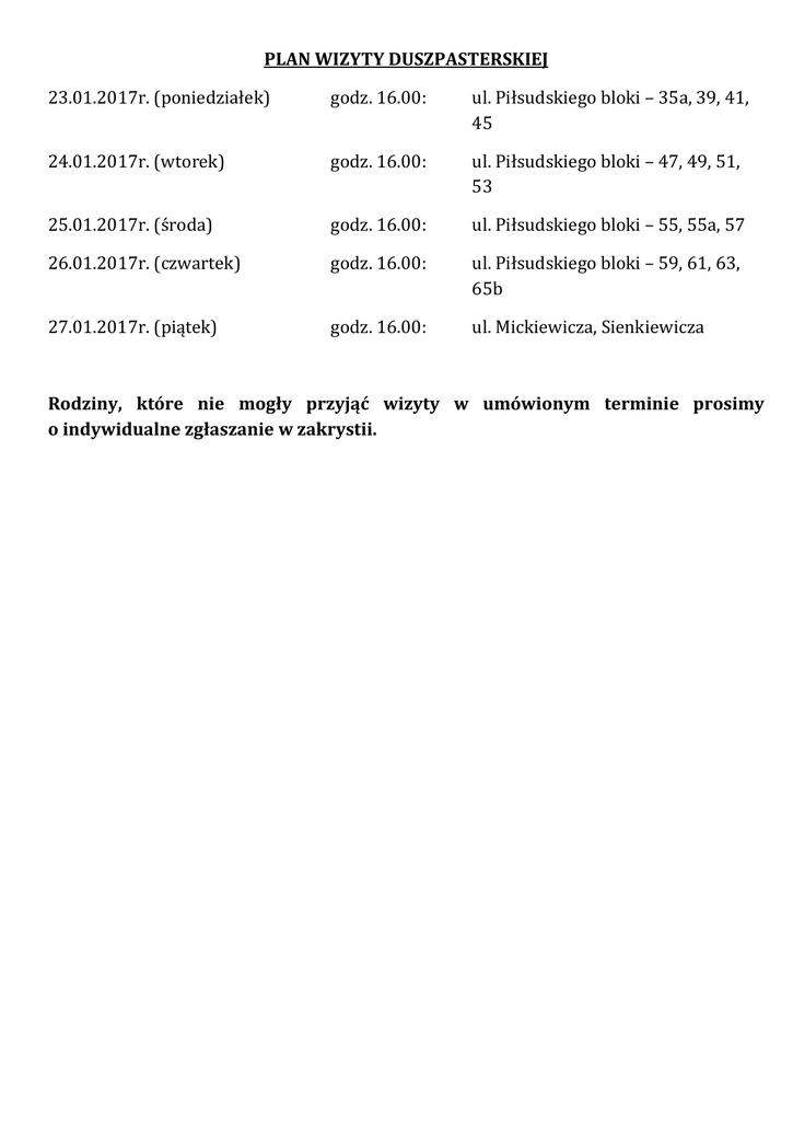 PLAN WIZYTY DUSZPASTERSKIEJ 23.01.2017r. (poniedziałek) godz. 16.00: ul. Piłsudskiego bloki – 35a, 39, 41, 45 24.01.2017r. (wtorek) godz. 16.00: ul. Piłsudskiego bloki – 47, 49, 51, 53 25.01.2017r. (środa) godz. 16.00: ul. Piłsudskiego bloki – 55, 55a, 57 26.01.2017r. (czwartek) godz. 16.00: ul. Piłsudskiego bloki – 59, 61, 63, 65b 27.01.2017r. (piątek) godz. 16.00: ul. Mickiewicza, Sienkiewicza Rodziny, które nie mogły przyjąć wizyty w umówionym terminie prosimy o indywidualne zgłaszanie w zakrystii.