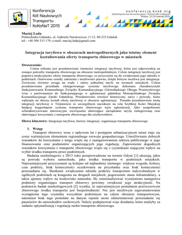 Maciej Łada Politechnika Gdańska, ul. Gabriela Narutowicza 11/12, 80-233 Gdańsk tel.: +48 500 315 179, e-mail: [email protected] Integracja taryfowa w obszarach metropolitarnych jako istotny element kształtowania oferty transportu zbiorowego w miastach Streszczenie: Celem referatu jest przedstawienie istotności integracji taryfowej, która jest odpowiedzią na rosnące potrzeby transportu zbiorowego na obszarze metropolitalnym. Celem integracji taryfowej jest poprawa atrakcyjności oferty transportu zbiorowego, co przyczynia się do zwiększania jego udziału w podróżach. Omówione zostały założenia i możliwości prawne, dzięki którym możliwa jest integracja. Zwrócono również uwagę na wady i zalety jednolitej taryfy na terenach miejskich. Celem przedstawienia przykładu zintegrowanego systemu taryfowego dokonano charakterystyki funkcjonowania Komunalnego Związku Komunikacyjnego Górnośląskiego Okręgu Przemysłowego wraz z porównaniem do funkcjonującego w aglomeracji gdańskiej Metropolitalnego Związku Komunikacyjnego Zatoki Gdańskiej. Przedstawiono również historyczny zarys i powody, które wpłynęły na obecny kształt oferty taryfowej w obszarze aglomeracji. Ponadto przedstawiono istotę integracji taryfowej w Trójmieście ze szczególnym naciskiem na rolę Szybkiej Kolei Miejskiej będącej kręgosłupem systemu transportu zbiorowego tejże aglomeracji. Jako uzupełnienie scharakteryzowano innowacyjne rozwiązania ułatwiające zarządzanie taryfą zintegrowaną oraz ułatwiające korzystanie z transportu zbiorowego dla użytkowników. Słowa kluczowe: Integracja taryfowa, bariery integracji, organizacja transportu zbiorowego 1. Wstęp Transport zbiorowy wraz z upływem lat i postępem urbanizacyjnym miast staje się coraz ważniejszym elementem regionalnego rozwoju gospodarczego. Umożliwienie dobrych warunków do korzystania z niego wiąże się z zaangażowaniem sektora publicznego w jego finansowanie oraz podmiotów organizujących jego regulację. Zapewnienie dogodnych warunków korzystania z transportu zbiorowego wiąże się z czynnikami mającymi wpływ na wybór środka transportu przez podróżnych. Badania marketingowe z 2013 roku przeprowadzone na terenie Gdyni [1] ukazują, jakie są powody wyboru samochodu, jako środka transportu w podróżach miejskich. Najważniejszymi przyczynami są kolejno od najbardziej istotnego: większa wygoda, krótszy czas podróży, brak konieczności oczekiwania na przystanku oraz brak konieczności przesiadania się. Skutkami zwiększenia udziału podróży transportem indywidualnym w ogólnych podróżach są kongestia na drogach miejskich, pogorszenie stanu infrastruktury, a także ujemny wpływ na środowisko naturalne. By zminimalizować wymienione następstwa podmioty organizujące transport zbiorowy powinny zwiększać jego atrakcyjność. Na podstawie badań marketingowych [2] wynika, że najważniejszym postulatem przewozowym zbiorowego środka transportu jest bezpośredniość. Nie jest możliwym zagwarantowanie wystąpienia tego czynnika wszystkim podróżnym na całym obszarze transportowym, natomiast brak tego postulatu na danym rejonie może zdeterminować przesiadanie się pasażerów do samochodów osobowych. Należy podejmować więc działania, które miałyby za zadanie optymalizację i regulację ruchu transportu zbiorowego. 2. Integracja taryfowa, a polityka transportowa, Pod pojęciem integracji transportu miejskiego rozumie się „proces organizacyjny, poprzez który elementy systemu transportu miejskiego (sieć i infrastruktura, taryfy i systemy biletowe, informacja i marketing) różnych przewoźników eksploatujących różne środki transportu coraz ściślej i sprawniej współdziałają, czego rezultatem jest ogólna poprawa jakości usług transportu miejskiego” [3] Integracja transportu miejskiego jest przyjęciem pewnej polityki transportowej, która zakładałaby, że zintegrowane przesiadki pomiędzy różnymi środkami transportu oraz liniami służyłyby zorganizowaniu przewozów poprzez zastąpienie tras bezpośrednich i długodystansowych na krótkie, lecz lepiej zaplanowane i uporządkowane. Służyłoby to zmniejszeniu nadpodaży świadczonych usług transportowych oraz eliminacji powtarzających się linii transportu zbiorowego, co ograniczy również dążenia pasażerów do podróży połączeniami bezpośrednimi. Polityka zrównoważonego rozwoju transportu ma za zadanie zapewnienie ułatwienia korzystania z transportu zbiorowego oraz dostosowania oferty do jego potrzeb, by mógł on stanowić alternatywę dla stosowania przemieszczenia transportem indywidualnym. By cele tej polityki udało się zrealizować potrzebna jest możliwie jak największa integracja w każdej z form transportu zbiorowego, obejmująca zjednoczenie taryfowe pomiędzy podmiotami organizującymi transport zbiorowy, tworzenie odpowiedniej infrastruktury umożliwiającej realizację założeń polityki transportowej, a także wpływ sektora publicznego oraz jego zaangażowanie. Integracja taryfowa to proces integracji różnych organizatorów transportu zbiorowego, którzy dzięki umowom oraz zaangażowaniu kapitałowemu ze strony sektora publicznego prowadzi do zintegrowania systemów biletowych oraz zwiększenia udziału transportu zbiorowego w ogólnych podróżach. Niewątpliwie, jednym z głównych założeń integracji taryfowej jest doprowadzenie do spójności obszarów miejskich, a także pozamiejskich. Dążąc do zintegrowania obszarów metropolii nie można zapomnieć o zrównoważonym rozwoju transportu. Stosowanie jednolitego cennika opłat za przejazd zwiększa komfort podróżowania, a to prowadzi do zwiększenia udziału podróży transportem zbiorowym oraz łączonym z elementami podróży indywidualnych. Integrowanie środków transportu względem wspólnej taryfy w pewnym stopniu wymusza na podróżnym wykonanie przesiadki. By umożliwić to pasażerom potrzebna jest odpowie