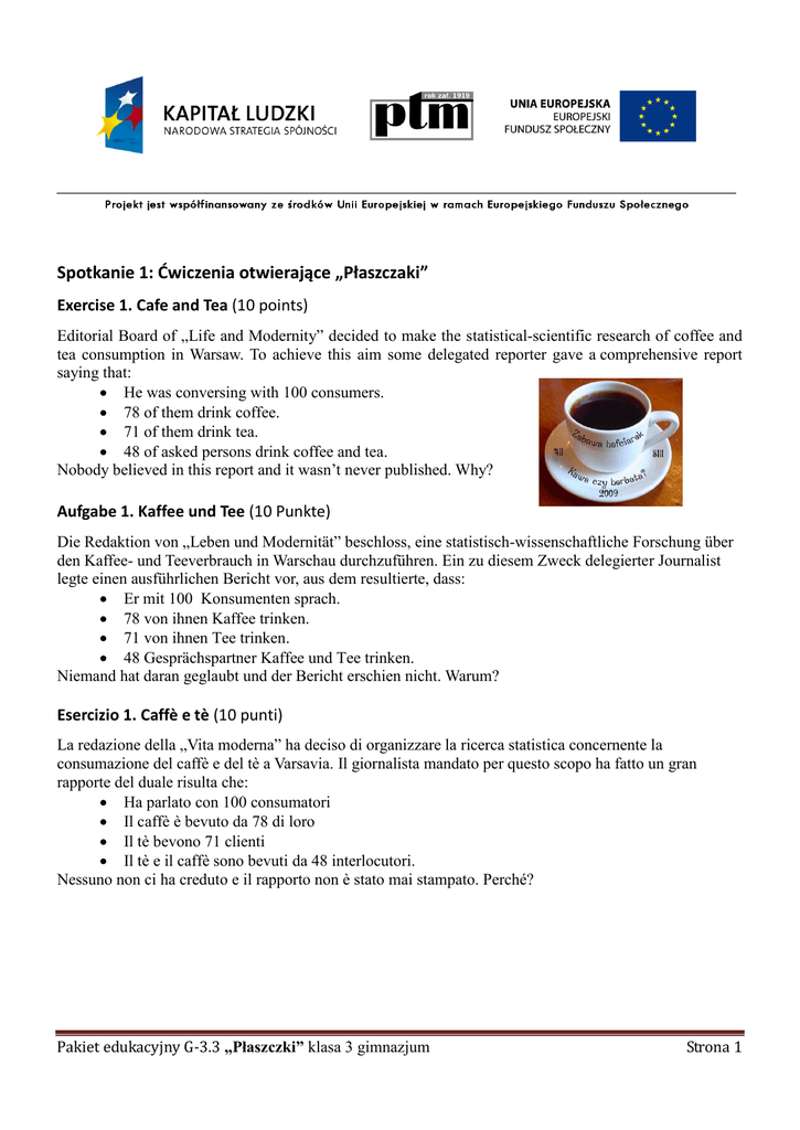 Spotkanie 1: Ćwiczenia otwierające „Płaszczaki” Exercise 1. Cafe and Tea (10 points) Editorial Board of „Life and Modernity” decided to make the statistical-scientific research of coffee and tea consumption in Warsaw. To achieve this aim some delegated reporter gave a comprehensive report saying that: He was conversing with 100 consumers. 78 of them drink coffee. 71 of them drink tea. 48 of asked persons drink coffee and tea. Nobody believed in this report and it wasn’t never published. Why? Aufgabe 1. Kaffee und Tee (10 Punkte) Die Redaktion von „Leben und Modernität” beschloss, eine statistisch-wissenschaftliche Forschung über den Kaffee- und Teeverbrauch in Warschau durchzuführen. Ein zu diesem Zweck delegierter Journalist legte einen ausführlichen Bericht vor, aus dem resultierte, dass: Er mit 100 Konsumenten sprach. 78 von ihnen Kaffee trinken. 71 von ihnen Tee trinken. 48 Gesprächspartner Kaffee und Tee trinken. Niemand hat daran geglaubt und der Bericht erschien nicht. Warum? Esercizio 1. Caffè e tè (10 punti) La redazione della „Vita moderna” ha deciso di organizzare la ricerca statistica concernente la consumazione del caffè e del tè a Varsavia. Il giornalista mandato per questo scopo ha fatto un gran rapporte del duale risulta che: Ha parlato con 100 consumatori Il caffè è bevuto da 78 di loro Il tè bevono 71 clienti Il tè e il caffè sono bevuti da 48 interlocutori. Nessuno non ci ha creduto e il rapporto non è stato mai stampato. Perché? Pakiet edukacyjny G-3.3 „Płaszczki” klasa 3 gimnazjum Strona 1 Tarea 1. Café y té (10 puntos) La redacción de „La vida y la modernidad” decidió de realizar las investigaciones estadístico-cientificas sobre el consumo del café y del té en Varsovia. El periodista delegado por esto, presentó un informe detallado del cuál resultaba que: Hablaba con 100 consumidores Café suelen beber 78 de ellos Té suelen beber 71 de ellos Café y té suelen beber 48 de sus interlocutores. Nadie se lo creyó y el informe no fue publicado. ¿Por qué? Zadanie 2. Przy okrągłym stole (4 punkty) Okrągły stół o średnicy 2m przykryty został kwadratowym obrusem o długości boku 2,5m. Środek blatu stołu pokrywa się ze środkiem obrusa. Jaka jest różnica pomiędzy odległościami od podłogi najniżej i najwyżej położonego punktu na brzegu obrusa? Zadanie 3. Zginana kartka (2 punkty) Zginając kartkę 5 razy wzdłuż długości i 4 razy wzdłuż szerokości otrzymano kwadrat. Obwód nie zagiętej kartki wynosi 378cm. Jaka jest szerokość kartki? Zadanie 4. Wskazówki zegara (2 punkty) Ile razy szybciej porusza się minutowa wskazówka zegara niż wskazówka godzinowa? Pakiet edukacyjny G-3.3 „Płaszczki” klasa 3 gimnazjum Strona 2 Rozwiązania oraz schemat punktacji zestawu ćwiczeo otwierających „Płaszczaki” Zadanie 1. Kawa i herbata (10 punktów) Redakcja „Życia i nowoczesności” postanowiła przeprowadzić statystyczno-naukowe badanie konsumpcji kawy i herbaty w Warszawie. Delegowany do tego celu dziennikarz złożył obszerne sprawozdanie, z którego wynikało, że: Rozmawiał ze 100 konsumentami Kawę pija 78 z nich Herbatę pija 71 z nich Kawę i herbatę pije 48 rozmówców. Nikt temu nie uwierzył i sprawozdanie nie ukazało się w druku. Dlaczego? Rozwiązanie: Tylko kawę pije 30 konsumentów (78- 48), tylko herbatę 23 (71- 48). Zatem wszystkich konsumentów powinno być 30+ 23 + 48 = 101. Dziennikarz zaś podał liczbę 100. Punktacja: Czynność A B C D Etapy rozwiązania zadania Poprawne przetłumaczenie Właściwe rozwiązanie w języku polskim Uzasadnienie w języku polskim Poprawne przetłumaczenie rozwiązania na język obcy Liczba punktów 2 2 2 4 Exercise 1. Cafe and Tea (10 points) Solution: 30 consumers drink only coffee (78 - 48), 23 only tea (71 - 48). Thus, the number of all consumers should be: 30+ 23 + 48 = 101, but the reporter gives the number 100. Pakiet edukacyjny G-3.3 „Płaszczki” klasa 3 gimnazjum Strona 3 Points: Activity A B C D Stages of Solution Correct translation Right solution in Polish Argumentation in Polish Correct translation of solution in foreign language Points 2 2 2 4 Aufgabe 1. Kaffee und Tee (10 Punkte) Lösung: Nur Kaffee trinken 30 Konsumenten (78- 48), nur Tee 23 (71- 48). Folglich soll es 30+ 23 + 48 = 101 Konsumenten geben. Der Journalist gab dagegen die Zahl 100 an. Punktwertung: Tätigkeits nummer A B C D Etappen der Aufgabenlösung Richtige Übersetzung Richtige Lösung in Polnisch Begründung im Polnischen Richtige Übersetzung der Lösung in eine Fremdsprache Punktenzahl 2 2 2 4 Esercizio 1. Caffè e tè (10 punti) Soluzione: Il caffè solo viene bevuto da 30 consumatori (78- 48), solo il tè bevono 23 (71- 48). Allora tutti I consumatori devono essere 30 + 23 + 48 = 101. Il giornalista invece ha dato la cifra 100. Punteggio: Numero dell’attività A B C D Tappe della soluzione dell’esercizio Traduzione corretta Soluzione corretta nella lingua polacca Giustificazione nella lingua polacca Traduzione corretta della soluzione nella lingua straniera Pakiet edukacyjny G-3.3 „Płaszczki” klasa 3 gimnazjum Numero di punti 2 2 2 4 Strona 4 Tarea 1. Café y té (10 puntos) Solución: Sólo café beben 30 consumidores (78-48), sólo té beben 23 de ellos (71- 48). Entonces todos los consumidores deben ser: 30+ 23 + 48 = 101. Pero el periodista presentó la cantidad de 100 personas. Puntuación: Número de la actividad A B C D Etapas de la solución de la tarea Traducción correcta en polaco Solución adecuada de la tarea en polaco Motivación en polaco Traducción correcta de la solución en la lengua extranjera Puntos 2 2 2 4 Zadanie 2. Przy okrągłym stole (4 punkty) Rozwiązanie: Przyjmijmy oznaczenia jak na rysunku: Należy obliczyć różnice długości odcinków AB i CD; Mamy: = Stąd: Przyjmując, że mamy: =0,5125[m]= 51,25[cm] Punktacja: Czynność A B C D Etapy rozwiązania zadania Wykonanie rysunku Obliczenie dł
