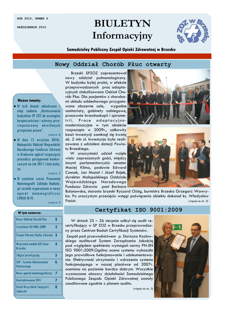 ROK 2010, NUMER 6 BIULETYN Informacyjny PAŹDZIERNIK 2010 Samodzielny Publiczny Zespół Opieki Zdrowotnej w Brzesku Nowy Oddział Chorób Płuc otwarty Ważne tematy: W tych dniach zakończono I etap zadania „Dostosowania budynków SP ZOZ do wymogów bezpieczeństwa i ochrony przeciwpożarowej określonych przepisami prawa”. (czytaj str. 6) W dniu 15 września 2010r. Małopolski Oddział Wojewódzki Narodowego Funduszu Zdrowia w Krakowie ogłosił rozpoczęcie procedury postępowań konkursowych na rok 2011 i lata kolejne. (czytaj str. 7) W ostatnim czasie Pracownia Mammografii Zakładu Radiologii została wyposażona w nowy aparat mammograficzny LORAD M-IV. (czytaj str. 7) Brzeski SPZOZ zaprezentował nowy oddział pulmonologiczny. W budynku byłej pralni, w efekcie przeprowadzonych prac adaptacyjnych zlokalizowano Odział Chorób Płuc. Dla pacjentów z chorobami układu oddechowego przygotowano obszerne sale, wygodne sanitariaty, gabinety zabiegowe, pracownie bronchoskopii i spirometrii. Prace adaptacyjnomodernizacyjne w tym obiekcie rozpoczęto w 2009r., całkowity koszt inwestycji zamknął się kwotą ok. 2 mln zł. Inwestycja była realizowana z udziałem dotacji Powiatu Brzeskiego. W uroczystości udział wzięło wielu zaproszonych gości, między innymi parlamentarzyści: senator Maciej Klima, posłowie Edward Czesak, Jan Musiał i Józef Rojek, dyrektor Małopolskiego Oddziału Wojewódzkiego Narodowego Funduszu Zdrowia pani Barbara Bulanowska, starosta brzeski Ryszard Ożóg, burmistrz Brzeska Grzegorz Wawryka. Po uroczystym przecięciu wstęgi poświęcenia obiektu dokonał ks. Władysław Pasiut. (więcej na str. 2) Certyfikat ISO 9001:2009 W tym numerze: Nowy Oddział Chorób Płuc 2 Certyfikat ISO 9001:2009 3 Święto Patrona Służby Zdrowia 3 Wręczenie medali 625-lecia Brzeska 4 Zdążyć przed grypą 5 SAP - System Alarmowania Pożarowego 6 Nowy aparat mammograficzny 7 Kontraktowanie 2011 7 Dzień Wszystkich Świętych i Zaduszki 8 W dniach 25 – 26 sierpnia odbył się audit recertyfikujący w SP ZOZ w Brzesku przeprowadzony przez Centrum Badań Certyfikacji Systemów. Zespół pod przewodnictwem p. Dariusza Kozłowskiego auditował System Zarządzania Jakością pod względem spełnienia wymagań normy PN-EN ISO 9001:2009.Ogólna ocena systemu wykazała jego prawidłowe funkcjonowanie i udokumentowanie. Efektywność utrzymania i wdrożenia systemu funkcjonującego w naszej placówce od 2007r. oceniono na poziomie bardzo dobrym. Wszystkie wyznaczone obszary działalności Samodzielnego Publicznego Zespołu Opieki Zdrowotnej zostały zauditowane zgodnie z planem auditu. (więcej na str. 3) BIULETYN INFORMACYJNY Str. 2 Nowy Oddział Chorób Płuc otwarty Ciąg dalszy ze strony 1 ... W okolicznościowym wystąpieniu Dyrektor SPZOZ mgr Józefa Szczurek - Żelazko podkreśliła, że „…oddział dysponuje wysoko wykwalifikowana kadrą medyczną zarówno lekarską jak pielęgniarską. Lokalizacja oddziału pulmonologii w kompleksie szpitala ma również inne niebagatelne znaczenie, a mianowicie zapewnia bliskość do dostępnej na pozostałych oddziałach aparatury diagnostycznej, możliwość szybkiej konsultacji ze specjalistami z pozostałych oddziałów. Nastąpiła zdecydowana poprawa warunków pracy personelu, zwiększył się komfort pobytu pacjentów. Poprzez koncentrację działalności szpitala w jednym miejscu udaje nam się obniżyć koszty jego funkcjonowania. Dwa lata temu kiedy pojawił się projekt przeniesienia ze „starego szpitala” naszych oddziałów tj. OPCH i Pulmonologii wiele osób wątpiło w celowość i sens tych działań, jak również wątpiono w rychłą modernizacje pomieszczeń pod potrzeby Oddziału pulmonologicznego . Te projekty stały się faktem, powstał PPZOL, świetnie wyposażony, oraz Pulmonologia funkcjonuje w nieporównywalnie lepszych warunkach. To świadczy o determinacji i konsekwencji w realizacji wytyczonych celów. I tą drogą zamierzamy iść dalej aby nasz szpital rozwijał się w takim jak dotychczas tempie, gwarantując społeczeństwu usługi o wysokim poziomie, pracownikom dobre warunki pracy.” Uroczystość była też okazją do odebrania przez dyrekcję szpitala certyfikatu jakości ISO na kolejny trzyletni okres certyfikacji. Ostatnim akcentem uroczystości było wręczenie medali 625lecia Brzeska zasłużonym pracownikom służby zdrowia przez burmistrza Brzeska Grzegorza Wawrykę. (red.) ROK 2010, NUMER 6 Str. 3 Certyfikat ISO 9001:2009 Ciąg dalszy ze strony 1 ... W trakcie spotkania otwierającego Pani Dyrektor Józefa Szczurek- Żelazko przedstawiła zmiany jakie zostały dokonane od drugiego auditu nadzoru, omówiono również strategię rozwoju na najbliższe lata oraz przedstawiono uaktualnioną Politykę Jakości. System Zarządzania Jakością wraz ze stworzonymi procedurami opisuje wewnętrzne procesy z uwzględnieniem wymagań normy PN- EN ISO 9001: 2009, obejmuje całość działalności SP ZOZ i został opisany w Księdze Jakości (wydanie II z dn. 27 lipca 2010r.) W wyniku przeprowadzonego auditu nie stwierdzono niezgodności w funkcjonującym Systemie Zarządzania Jakością. Pozytywnie oceniono podejmowane działania korygujące i zapobiegawcze. Raport z auditu zakończono wnioskiem o przyznanie certyfikatu w zakresie: udzielania świadczeń zdrowotnych w zakresie lecznictwa stacjonarnego oraz ambulatoryjnego w ramach podstawowej i specjalistycznej opieki medycznej wraz z diagnostyką. Uroczyste wręczenie certyfikatu miało miejsce w dn. 18.10.2010r. Pełnomocnik ds. ZSZJ Ewa Podłęcka 18 X 2010 – Święto Patrona Służby Zdrowia Św. Łukasza Podziękowania złożyli Z zawodu był lekarzem. Należał do ludzi wykształconych i doskonale obeznanych z ówczesną literaturą. Świadczy o tym piękny język grecki, kronikarska dokładność informacji i umiejętność zdobywania źródeł. Święty Łukasz pozostawił po sobie dwie bezcenne pamiątki, które zaskarbiły mu wdzięc