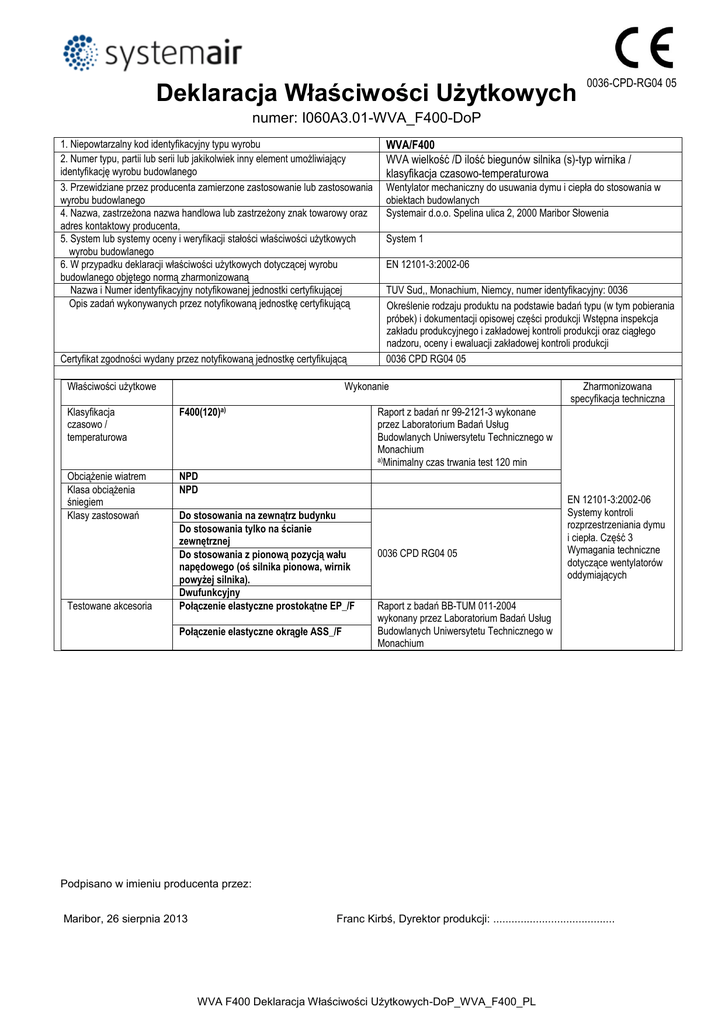 Deklaracja Właściwości Użytkowych 0036-CPD-RG04 05 numer: I060A3.01-WVA_F400-DoP 1. Niepowtarzalny kod identyfikacyjny typu wyrobu 2. Numer typu, partii lub serii lub jakikolwiek inny element umożliwiający identyfikację wyrobu budowlanego 3. Przewidziane przez producenta zamierzone zastosowanie lub zastosowania wyrobu budowlanego 4. Nazwa, zastrzeżona nazwa handlowa lub zastrzeżony znak towarowy oraz adres kontaktowy producenta, 5. System lub systemy oceny i weryfikacji stałości właściwości użytkowych wyrobu budowlanego 6. W przypadku deklaracji właściwości użytkowych dotyczącej wyrobu budowlanego objętego normą zharmonizowaną Nazwa i Numer identyfikacyjny notyfikowanej jednostki certyfikującej Opis zadań wykonywanych przez notyfikowaną jednostkę certyfikującą Certyfikat zgodności wydany przez notyfikowaną jednostkę certyfikującą Właściwości użytkowe Wentylator mechaniczny do usuwania dymu i ciepła do stosowania w obiektach budowlanych Systemair d.o.o. Spelina ulica 2, 2000 Maribor Słowenia System 1 EN 12101-3:2002-06 TUV Sud,, Monachium, Niemcy, numer identyfikacyjny: 0036 Określenie rodzaju produktu na podstawie badań typu (w tym pobierania próbek) i dokumentacji opisowej części produkcji Wstępna inspekcja zakładu produkcyjnego i zakładowej kontroli produkcji oraz ciągłego nadzoru, oceny i ewaluacji zakładowej kontroli produkcji 0036 CPD RG04 05 Wykonanie Klasyfikacja czasowo / temperaturowa F400(120)a) Obciążenie wiatrem Klasa obciążenia śniegiem Klasy zastosowań NPD NPD Testowane akcesoria WVA/F400 WVA wielkość /D ilość biegunów silnika (s)-typ wirnika / klasyfikacja czasowo-temperaturowa Zharmonizowana specyfikacja techniczna Raport z badań nr 99-2121-3 wykonane przez Laboratorium Badań Usług Budowlanych Uniwersytetu Technicznego w Monachium a)Minimalny czas trwania test 120 min Do stosowania na zewnątrz budynku Do stosowania tylko na ścianie zewnętrznej Do stosowania z pionową pozycją wału napędowego (oś silnika pionowa, wirnik powyżej silnika). Dwufunkcyjny Połączenie elastyczne prostokątne EP_/F Połączenie elastyczne okrągłe ASS_/F 0036 CPD RG04 05 EN 12101-3:2002-06 Systemy kontroli rozprzestrzeniania dymu i ciepła. Część 3 Wymagania techniczne dotyczące wentylatorów oddymiających Raport z badań BB-TUM 011-2004 wykonany przez Laboratorium Badań Usług Budowlanych Uniwersytetu Technicznego w Monachium Podpisano w imieniu producenta przez: Maribor, 26 sierpnia 2013 Franc Kirbś, Dyrektor produkcji: ........................................ WVA F400 Deklaracja Właściwości Użytkowych-DoP_WVA_F400_PL