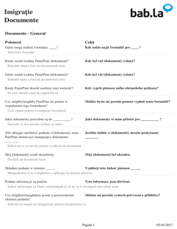 Imigrație Documente Documente - General Poloneză Cehă Gdzie mogę znaleźć formularz ____? Solicitare formular Kde můžu najít formulář pro ____ ? Kiedy został wydany Pana/Pani [dokument]? Întreabă când a fost un documentul emis Kdy byl váš [dokument] vydaný? Gdzie został wydany Pana/Pani [dokument]? Întreabă unde a fost un documentul emis Kde byl váš [dokument] vydaný? Kiedy Pana/Pani dowód osobisty traci ważność? Pe cine întrebi când îți expiră ID-ul Kdy vyprší platnost mého občanského průkazu? Czy mógłby/mogłaby Pan/Pani mi pomóc w wypełnieniu tego formularza? Cere ajutor pentru a completa formularul Mohl/a byste mi prosím pomoct vyplnit tento formulář? Jakie dokumenty potrzebne są do __________? Întreabă ce documente trebuie să aduci Jaké dokumenty si mám přinést pro __________ ? Aby ubiegać się/złożyć podanie o [dokument], musi Pan/Pani dostarczyć następujące dokumenty: _______. Indică de ce ai nevoie pentru a solicita un document Jestliže žádáte o [dokument], musíte poskytnout _______. Mój [dokument] został skradziony. Declară un document furat Můj [dokument] byl ukraden. Składam podanie w imieniu _____. Vyplňuji totu žádost jménem _____. Menționează că tu completezi o aplicație în numele altcuiva Podane informacje są poufne. Tyto informace jsou důvěrné. Indică informația ca fiind confidențială și că nu va fi divulgată altor părți terțe Czy mógłbym/mogłabym prosić o potwierdzenie Můžete mi prosím vystavit potvrzení o přihlášce? złożenia podania? Solicită un număr de înregistrare pentru înregistrarea ta Pagină 1 03.03.2017 Imigrație Documente Documente - Informații personale Poloneză Cehă Jak się Pan/Pani nazywa? Solicită numele unei persoane Jak se jmenuješ? Czy mógłby/mogłaby Pan/Pani podać swoją datę i miejsce urodzenia? Solicită cuiva locul și data nașterii Můžete mi prosím říct vaše místo a datum narození? Gdzie Pan/Pani mieszka? Solicită unde locuiește cineva Kde bydlíte? Jaki jest Pana/Pani adres? Solicită adresa cuiva Jaká je vaše adresa? Jakie posiada Pana/Pani obywatelstwo? Solicită cetățenia cuiva Jaké je vaše občanství? Kiedy przyjechał/a Pan/Pani do [nazwa kraju]? Solicită cuiva când a ajuns în acea țară Kdy jste přijeli do [country]? Czy mógłbym/mogłabym zobaczyć Pana/Pani dowód osobisty? Solicită ID-ul cuiva Můžete mi prosím ukázat váš občanský průkaz? Documente - Stare civilă Poloneză Cehă Mój stan cywilny: _____. Indică starea ta civilă Můj rodinný stav je ___________. kawaler/panna Stare civilă svobodný/á żonaty/zamężna Stare civilă ženatý/vdaná Pagină 2 03.03.2017 Imigrație Documente w separacji Stare civilă odděleni rozwodnik/rozwódka Stare civilă rozvedený/rozvedená w konkubinacie Stare civilă žijící ve společné domácnosti w rejestrowanym związku partnerskim Stare civilă v registrovaném partnerství w związku partnerskim Stare civilă nesezdaní partneři w związku partnerskim (ze wspólnym gospodarstwem domowym) Stare civilă v domácím partnerství wdowiec/wdowa Stare civilă vdovec/vdova Czy ma Pan/Pani dzieci? Întreabă dacă cineva are copii Máte děti? Czy mieszka Pan/Pani z osobami na Pana/Pani Žijí s vámi rodinní příslušníci? utrzymaniu? Întreabă dacă cineva primește ajutor financiar pentru persoanele cu care locuiește Chciałbym/Chciałabym skorzystać z prawa do łączenia rodzin. Indică-ți intenția de a te reuni cu familia ta Rád/a bych byl/a se svou rodinou. Documente - Înregistrare Poloneză Cehă Chciałbym/Chciałabym się zameldować (w nowym miejscu zamieszkania). Indică faptul că vrei să te înregistrezi Rád/a bych se zaregistroval/a ve městě. Pagină 3 03.03.2017 Imigrație Documente Jakie dokumenty wymagane są do meldunku? Întreabă de ce documente ai nevoie Jaké dokumenty si mám přinést? Czy za meldunek pobierana jest opłata? Întreabă dacă înregistrarea supune costuri Je registrace zpoplatněná? Chciałbym/Chciałabym zameldować się na pobyt Rád/a bych zaregistroval/a své trvalé bydliště. stały. Menționează că ești acolo pentru a-ți face înregistrarea Chciałbym/Chciałabym prosić o wydanie zaświadczenia o niekaralności. Menționează că vrei să aplici pentru cazier judiciar Rád/a bych požádal/a o výpis z trestního rejstříku. Chciałbym/Chciałabym złożyć podanie o Rád/a bych požádal/a o povolení k pobytu. zezwolenie na pobyt stały. Menționează că vrei să aplici pentru un permis de ședere Documente - Asigurare medicală Poloneză Cehă Mam kilka pytań dotyczących ubezpieczenia Rád/a bych se zeptat/a na pár otázek ohledně zdrowotnego. zdravotního pojištění. Menționează că ai câteva întrebări despre asigurarea de sănătate Czy muszę wykupić prywatne ubezpieczenie Potřebuji soukromé zdravotní pojištění? zdrowotne? Întreabă dacă ai nevoie de asigurare medicală privată Co obejmuje to ubezpieczenie zdrowotne? Întreabă despre acoperirea asigurării Co je všechno zahrnuto v zdravotním pojištění? Opłaty za pobyt w szpitalu Exemplu de acoperire a asigurării medicale Poplatky za pobyt v nemocnici Opłaty za konsultacje u specjalistów Exemplu de acoperire de asigurare medicală Poplatky za konsultace se specialisty Pagină 4 03.03.2017 Imigrație Documente Badania diagnostyczne Exemplu de acoperire a asigurării de sănătate Diagnostické testy Zabiegi chirurgiczne Exemplu de acoperire a asigurării de sănătate Chirurgické zákroky Leczenie psychiatryczne Exemplu de acoperire a asigurării de sănătate Psychiatrická léčba Leczenie stomatologiczne Exemplu de acoperire a asigurării de sănătate Zubní ošetření Leczenie okulistyczne Exemplu de acoperire a asigurării de sănătate Oční ošetření Documente - Viză Poloneză Cehă W jakim celu ubiega się Pan/Pani o wizę? Întreabă de ce se solicită o viză de intrare