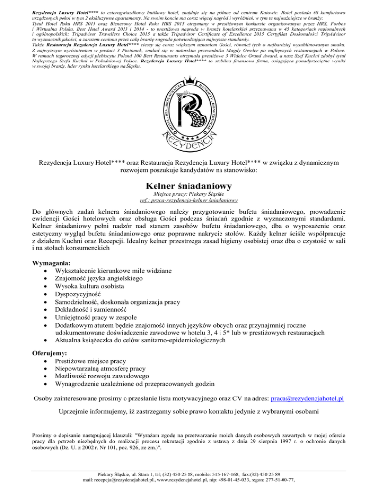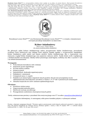 Rezydencja Luxury Hotel**** to czterogwiazdkowy butikowy hotel, znajduje się na północ od centrum Katowic. Hotel posiada 68 komfortowo urządzonych pokoi w tym 2 ekskluzywne apartamenty. Na swoim koncie ma coraz więcej nagród i wyróżnień, w tym te najważniejsze w branży: Tytuł Hotel Roku HRS 2015 oraz Biznesowy Hotel Roku HRS 2015 otrzymany w prestiżowym konkursie organizowanym przez HRS, Forbes i Wirtualna Polska. Best Hotel Award 2013 i 2014 - to prestiżowa nagroda w branży hotelarskiej przyznawana w 45 kategoriach regionalnych i ogólnopolskich; Tripadvisor Travellers Choice 2015 a także Tripadvisor Certificate of Excellence 2015 Certyfikat Doskonałości TripAdvisor to wyznacznik jakości, a zarazem ceniona przez całą branżę nagroda potwierdzająca najwyższe standardy. Także Restauracja Rezydencja Luxury Hotel**** cieszy się coraz większym uznaniem Gości, również tych o najbardziej wysublimowanym smaku. Z najwyższym wyróżnieniem w postaci 3 Poziomek, znalazł się w autorskim przewodniku Magdy Gessler po najlepszych restauracjach w Polsce. W ramach tegorocznej edycji plebiscytu Poland 100 Best Restaurants otrzymała prestiżowe 3 Widelce Grand Award, a nasz Szef Kuchni zdobył tytuł Najlepszego Szefa Kuchni w Południowej Polsce. Rezydencja Luxury Hotel**** to stabilna finansowo firma, osiągająca ponadprzeciętne wyniki w swojej branży, lider rynku hotelarskiego na Śląsku. Rezydencja Luxury Hotel**** oraz Restauracja Rezydencja Luxury Hotel**** w związku z dynamicznym rozwojem poszukuje kandydatów na stanowisko: Kelner śniadaniowy Miejsce pracy: Piekary Śląskie ref.: praca-rezydencja-kelner śniadaniowy Do głównych zadań kelnera śniadaniowego należy przygotowanie bufetu śniadaniowego, prowadzenie ewidencji Gości hotelowych oraz obsługa Gości podczas śniadań zgodnie z wyznaczonymi standardami. Kelner śniadaniowy pełni nadzór nad stanem zasobów bufetu śniadaniowego, dba o wyposażenie oraz estetyczny wygląd bufetu śniadaniowego oraz poprawne nakrycie stołów. Każdy kelner ściśle współpracuje z działem Kuchni oraz Recepcji. Idealny kelner przestrzega zasad higieny osobistej oraz dba o czystość w sali i na stołach konsumenckich Wymagania: Wykształcenie kierunkowe mile widziane Znajomość języka angielskiego Wysoka kultura osobista Dyspozycyjność Samodzielność, doskonała organizacja pracy Dokładność i sumienność Umiejętność pracy w zespole Dodatkowym atutem będzie znajomość innych języków obcych oraz przynajmniej roczne udokumentowane doświadczenie zawodowe w hotelu 3, 4 i 5* lub w prestiżowych restauracjach Aktualna książeczka do celów sanitarno-epidemiologicznych Oferujemy: Prestiżowe miejsce pracy Niepowtarzalną atmosferę pracy Możliwość rozwoju zawodowego Wynagrodzenie uzależnione od przepracowanych godzin Osoby zainteresowane prosimy o przesłanie listu motywacyjnego oraz CV na adres: [email protected] Uprzejmie informujemy, iż zastrzegamy sobie prawo kontaktu jedynie z wybranymi osobami Prosimy o dopisanie następującej klauzuli: "Wyrażam zgodę na przetwarzanie moich danych osobowych zawartych w mojej ofercie pracy dla potrzeb niezbędnych do realizacji procesu rekrutacji zgodnie z ustawą z dnia 29 sierpnia 1997 r. o ochronie danych osobowych (Dz. U. z 2002 r. Nr 101, poz. 926, ze zm.)". Piekary Śląskie, ul. Stara 1, tel; (32) 450 25 88, mobile: 515-167-168, fax:(32) 450 25 89 mail: [email protected]., www.rezydencjahotel.pl, nip: 498-01-45-033, regon: 277-51-00-77,