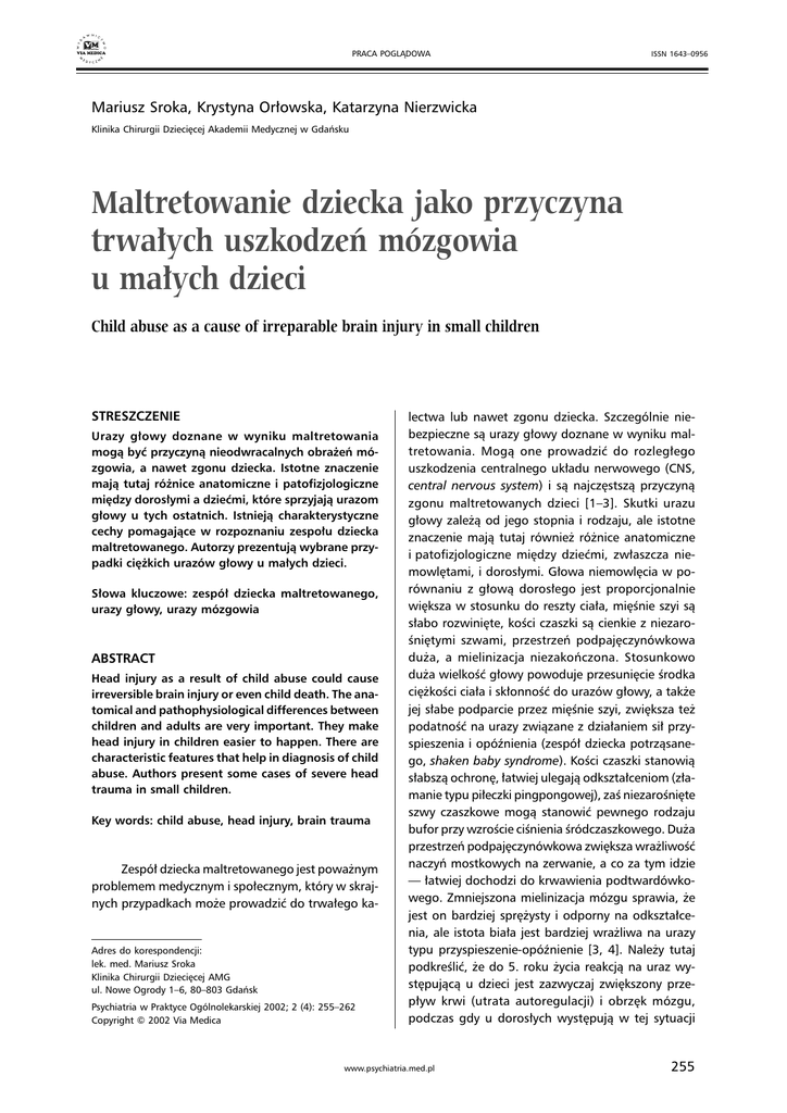 PRACA POGLĄDOWA ISSN 1643–0956 Mariusz Sroka, Krystyna Orłowska, Katarzyna Nierzwicka Klinika Chirurgii Dziecięcej Akademii Medycznej w Gdańsku Maltretowanie dziecka jako przyczyna trwałych uszkodzeń mózgowia u małych dzieci Child abuse as a cause of irreparable brain injury in small children STRESZCZENIE Urazy głowy doznane w wyniku maltretowania mogą być przyczyną nieodwracalnych obrażeń mózgowia, a nawet zgonu dziecka. Istotne znaczenie mają tutaj różnice anatomiczne i patofizjologiczne między dorosłymi a dziećmi, które sprzyjają urazom głowy u tych ostatnich. Istnieją charakterystyczne cechy pomagające w rozpoznaniu zespołu dziecka maltretowanego. Autorzy prezentują wybrane przypadki ciężkich urazów głowy u małych dzieci. Słowa kluczowe: zespół dziecka maltretowanego, urazy głowy, urazy mózgowia ABSTRACT Head injury as a result of child abuse could cause irreversible brain injury or even child death. The anatomical and pathophysiological differences between children and adults are very important. They make head injury in children easier to happen. There are characteristic features that help in diagnosis of child abuse. Authors present some cases of severe head trauma in small children. Key words: child abuse, head injury, brain trauma Zespół dziecka maltretowanego jest poważnym problemem medycznym i społecznym, który w skrajnych przypadkach może prowadzić do trwałego ka- Adres do korespondencji: lek. med. Mariusz Sroka Klinika Chirurgii Dziecięcej AMG ul. Nowe Ogrody 1–6, 80–803 Gdańsk Psychiatria w Praktyce Ogólnolekarskiej 2002; 2 (4): 255–262 Copyright © 2002 Via Medica lectwa lub nawet zgonu dziecka. Szczególnie niebezpieczne są urazy głowy doznane w wyniku maltretowania. Mogą one prowadzić do rozległego uszkodzenia centralnego układu nerwowego (CNS, central nervous system) i są najczęstszą przyczyną zgonu maltretowanych dzieci [1–3]. Skutki urazu głowy zależą od jego stopnia i rodzaju, ale istotne znaczenie mają tutaj również różnice anatomiczne i patofizjologiczne między dziećmi, zwłaszcza niemowlętami, i dorosłymi. Głowa niemowlęcia w porównaniu z głową dorosłego jest proporcjonalnie większa w stosunku do reszty ciała, mięśnie szyi są słabo rozwinięte, kości czaszki są cienkie z niezarośniętymi szwami, przestrzeń podpajęczynówkowa duża, a mielinizacja niezakończona. Stosunkowo duża wielkość głowy powoduje przesunięcie środka ciężkości ciała i skłonność do urazów głowy, a także jej słabe podparcie przez mięśnie szyi, zwiększa też podatność na urazy związane z działaniem sił przyspieszenia i opóźnienia (zespół dziecka potrząsanego, shaken baby syndrome). Kości czaszki stanowią słabszą ochronę, łatwiej ulegają odkształceniom (złamanie typu piłeczki pingpongowej), zaś niezarośnięte szwy czaszkowe mogą stanowić pewnego rodzaju bufor przy wzroście ciśnienia śródczaszkowego. Duża przestrzeń podpajęczynówkowa zwiększa wrażliwość naczyń mostkowych na zerwanie, a co za tym idzie — łatwiej dochodzi do krwawienia podtwardówkowego. Zmniejszona mielinizacja mózgu sprawia, że jest on bardziej sprężysty i odporny na odkształcenia, ale istota biała jest bardziej wrażliwa na urazy typu przyspieszenie-opóźnienie [3, 4]. Należy tutaj podkreślić, że do 5. roku życia reakcją na uraz występującą u dzieci jest zazwyczaj zwiększony przepływ krwi (utrata autoregulacji) i obrzęk mózgu, podczas gdy u dorosłych występują w tej sytuacji www.psychiatria.med.pl 255 Psychiatria w Praktyce Ogólnolekarskiej 2002, tom 2, nr 4 skurcz i zmniejszenie przepływu, co ma znaczenie w rozległości urazu mózgowia [3]. Uraz mózgowia powoduje uszkodzenia pierwotne i wtórne. Uszkodzenie pierwotne polega na nieodwracalnym uszkodzeniu neuronów w momencie wypadku. W miejscu uderzenia głowy powstaje fala uderzeniowa ze znacznym wzrostem ciśnienia, zaś po stronie przeciwnej powstaje ciśnienie ujemne, powodujące przy dużych urazach uwalnianie gazów z osocza i rozrywanie drobnych naczyń (mechanizm contre coupe) [5]. Przemieszczająca się fala ciśnieniowa przenosi się na rdzeń przedłużony, powodując objawy wstrząśnienia lub stłuczenia pnia mózgu. Do uszkodzeń wtórnych dochodzi po wypadku, gdy martwicy ulegają neurony, które nie ucierpiały w czasie bezpośredniego urazu. We wczesnym okresie jest to przede wszystkim skutek niedokrwienia, hipoksji lub anoksji, czyli zaburzeń bezpośrednio związanych z perfuzją mózgu (przepływem mózgowym) [4, 5]. Należy tu przypomnieć regułę Monro i Kelliego, według której ciśnienie perfuzyjne mózgu zależy bezpośrednio od różnicy średniego ciśnienia tętniczego i ciśnienia wewnątrzczaszkowego: CPM = ŚCT – CWC. Ciśnienie wewnątrzczaszkowe w czaszce stanowiącej zamkniętą przestrzeń o stałej objętości zależy od trzech nieściśliwych składników: mózgu, płynu mózgowo-rdzeniowego oraz krwi. Zwiększenie objętości jednego z wyżej wymienionych składników lub pojawienie się nowego składnika (guz, krwawienie, ropień), o ile nie jest kompensowane zmniejszeniem się objętości pozostałych składników, musi doprowadzić do wzrostu ciśnienia śródczaszkowego, a co za tym idzie — do spadku perfuzji i niedokrwienia mózgu. Występujący u dzieci pourazowy obrzęk mózgu, poprzez zaburzenie perfuzji i niedotlenienie mózgu, powiększa więc zakres uszkodzeń i w skrajnych przypadkach może prowadzić do wgłobienia mózgu. W wielu przypadkach służba zdrowia jest pierwszą instytucją, do której trafia maltretowane dziecko. To my musimy zadecydować, czy dany uraz zakwalifikować do przypadkowych, czy też wykazać, że był on wynikiem celowego działania [6]. Należy podkreślić stosowaną w klinice autorów zasadę „zachowania czujności wobec zespołu dziecka maltretowanego” analogicznie do „czujności onkologicznej”. Dziecko nal