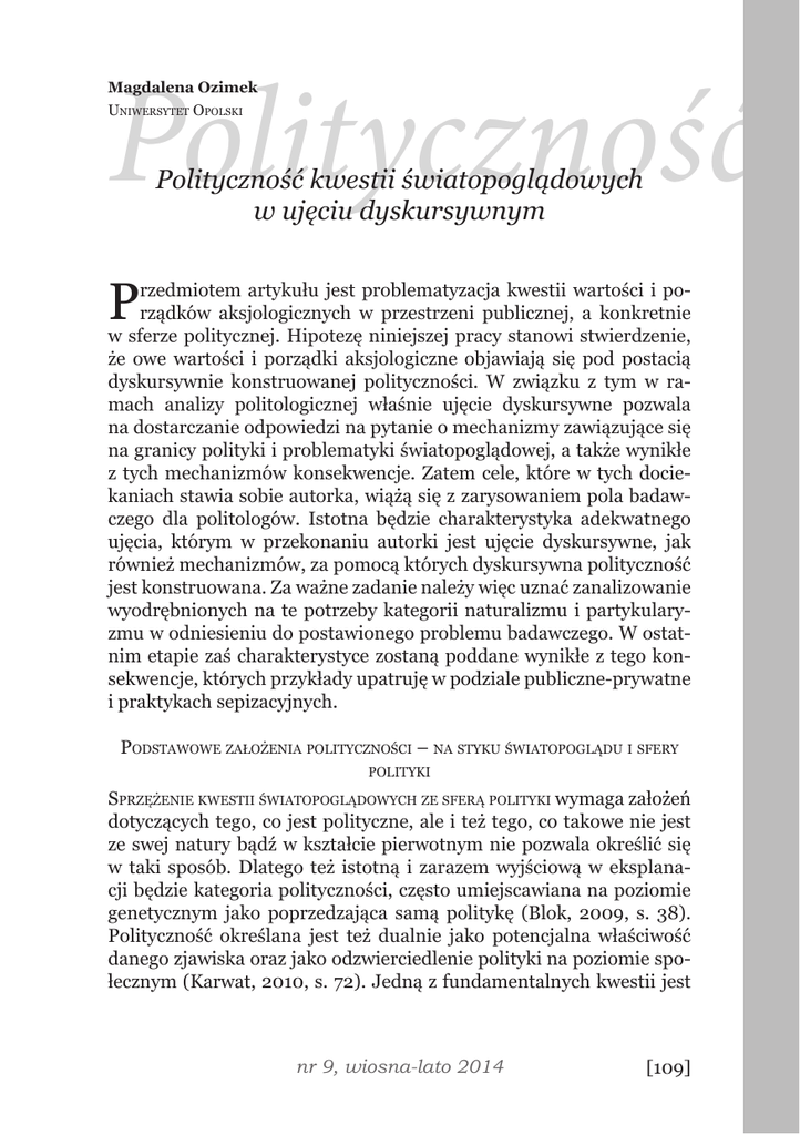 Polityczność Magdalena Ozimek Uniwersytet Opolski Polityczność kwestii światopoglądowych w ujęciu dyskursywnym P rzedmiotem artykułu jest problematyzacja kwestii wartości i porządków aksjologicznych w przestrzeni publicznej, a konkretnie w sferze politycznej. Hipotezę niniejszej pracy stanowi stwierdzenie, że owe wartości i porządki aksjologiczne objawiają się pod postacią dyskursywnie konstruowanej polityczności. W związku z tym w ramach analizy politologicznej właśnie ujęcie dyskursywne pozwala na dostarczanie odpowiedzi na pytanie o mechanizmy zawiązujące się na granicy polityki i problematyki światopoglądowej, a także wynikłe z tych mechanizmów konsekwencje. Zatem cele, które w tych dociekaniach stawia sobie autorka, wiążą się z zarysowaniem pola badawczego dla politologów. Istotna będzie charakterystyka adekwatnego ujęcia, którym w przekonaniu autorki jest ujęcie dyskursywne, jak również mechanizmów, za pomocą których dyskursywna polityczność jest konstruowana. Za ważne zadanie należy więc uznać zanalizowanie wyodrębnionych na te potrzeby kategorii naturalizmu i partykularyzmu w odniesieniu do postawionego problemu badawczego. W ostatnim etapie zaś charakterystyce zostaną poddane wynikłe z tego konsekwencje, których przykłady upatruję w podziale publiczne-prywatne i praktykach sepizacyjnych. Podstawowe założenia polityczności – na styku światopoglądu i sfery polityki Sprzężenie kwestii światopoglądowych ze sferą polityki wymaga założeń dotyczących tego, co jest polityczne, ale i też tego, co takowe nie jest ze swej natury bądź w kształcie pierwotnym nie pozwala określić się w taki sposób. Dlatego też istotną i zarazem wyjściową w eksplanacji będzie kategoria polityczności, często umiejscawiana na poziomie genetycznym jako poprzedzająca samą politykę (Blok, 2009, s. 38). Polityczność określana jest też dualnie jako potencjalna właściwość danego zjawiska oraz jako odzwierciedlenie polityki na poziomie społecznym (Karwat, 2010, s. 72). Jedną z fundamentalnych kwestii jest nr 9, wiosna-lato 2014 [109] Magdalena Ozimek antysubstancjalne ujęcie tegoż pojęcia, zaproponowane przez Carla Schmitta, uważanego za twórcę polityczności jako kategorii. Dookreślił on, że to co polityczne może czerpać z każdej dziedziny, jeśli tylko zaistnieje tam antagonizm o wystarczającym natężeniu, zmuszającym do pozycjonowania na osi wróg-przyjaciel (co za sprawą kontynuatorów jego myśli ulegało pewnym modyfikacjom). Oznacza to, że polityczność nie ma jednej właściwej sobie substancji, lecz stać się nią może wiele problemów (Schmitt, 2000, s. 198). Wynika z tego podkreślany przez Mirosława Karwata relacyjny charakter określania tego co polityczne, będący antytezą formalistycznych określeń polityki. Implikuje to wyjaśnianie tego co polityczne nie na zasadzie sztywno określonych ram definicyjnych, ale jako pewną konfigurację – właśnie „cechę relacyjną” – ujawniającą się w obliczu zaistniałych okoliczności. Jednocześnie polityczność może być tylko jednym z wymiarów zjawiska bądź przedmiotu (Karwat, 1996, s. 108–109; Karwat, 2010, s. 68–69). Może ona pojawić się wtórnie, ale i być przypisana jako cecha pierwotna. Polityczność partii politycznych nie ulega wątpliwości, ale już takie potraktowanie różnych form sztuki wywołuje wiele dyskusji, czy to z racji użycia ich jako narzędzia gry politycznej, czy też przez potraktowanie ich jako przejawów aspiracji autorów do wyrażenia poglądu politycznego (Karwat, 2010, s. 73–75). Istotne jest podkreślenie, iż pojęcie polityczności ma znacznie szerszy zakres niż ściśle pojmowana polityka, co sprawia, że jest bardziej efemeryczne. Jednocześnie pozwala na uchwycenie niuansów skomplikowanej kwestii politycznego uwikłania (Karwat, 2010, s. 70; Mouffe, 2008, s. 24). Otwartość tej kategorii i wiążąca się z tym elastyczność, nie pozbawiona jednocześnie rygorów naukowości, jest adekwatna w stosunku do charakteru przedmiotu artykułu. Pod względem definicyjnym i koncepcyjnym za punkt wyjścia obieram myśl Chantal Mouffe, która w swoim modelu agonistycznej demokracji dookreśla polityczność względem polityki i definiuje ją jako ogół wszelkich antagonizmów obecnych w społeczeństwie (Mouffe, 2008, s. 24; Mouffe, 2005, s. 118–122). Uszczegóławiając kategorię agonizmu, Ch. Mouffe podkreśla inspirację Schmittowskim podejściem do konfliktu i wynikłego z tego antagonizmu jako spiritus movens polityczności. Jednocześnie sygnalizuje konieczność rewizji i tym samym zaadaptowania tego podejścia w ramy liberalnej demokracji. W systemie tym zaistnienie totalnej wrogości nie pozwoliłoby na funkcjonowanie zróżnicowanych podmiotów na tej samej przestrzeni. Ch. Mouffe proponuje więc wspomniany agonistyczny model [110] refleksje Polityczność kwestii światopoglądowych w ujęciu dyskursywnym demokracji (Mouffe, 2005, s. 118–122). Zasadniczym założeniem autorki jest przejście od Schmittowskiej wrogości egzystencjalnej (antagonizmu) do pojęcia przeciwnika, zwalczanego jedynie ideowo, bez podważania możliwości zaistnienia jego tożsamości w ramach pluralistycznego reżimu demokratycznego (agonizm) (Mouffe, 2005, s. 119). Biorąc pod uwagę funkcjonalność definicji dla potrzeb przedmiotu niniejszego tekstu oraz koncepcję Ch. Mouffe, pod pojęciem polityczności będę rozumiała konfrontację różnych, alternatywnych względem siebie wizji, odbywającą się w sferze publicznej (Mouffe, 2005, s. 25). Nie bez znaczenia pozostają statusy poznawcze i ontologiczne omawianych kategorii. Nadawane na różnej drodze przez różne orientacje i perspektywy badawcze i teoretyczne. Polityczność problemów światopoglądowych zgodnie ze wskazanymi założeniami poddaje się wiwisekcji w ramach perspektywy dyskursywnej, która na gruncie politologii wp