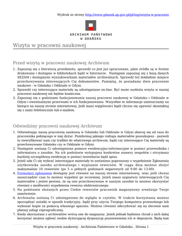 Wydruk ze strony http://www.gdansk.ap.gov.pl/pl/top/wizyta-w-pracowni Wizyta w pracowni naukowej Przed wizytą w pracowni naukowej Archiwum 1. Zapoznaj się z literaturą przedmiotu, sprawdź co jest już opracowane, jakie źródła są w formie drukowane i dostępne w bibliotekach bądź w Internecie. Następnie zapoznaj się z bazą danych SEZAM i dostępnymi wyszukiwarkami materiałów archiwalnych. Sprawdź też dokładnie miejsce przechowywania interesujących Cię dokumentów. Pamiętaj, że posiadamy dwie pracownie naukowe - w Gdańsku i Oddziale w Gdyni. 2. Sprawdź czy interesujące materiały są udostępniane on-line. Być może osobista wizyta w naszej pracowni naukowej nie będzie konieczna. 3. Zapoznaj się z godzinami funkcjonowania naszej pracowni naukowej w Gdańsku i Oddziale w Gdyni i ewentualnymi przerwami w ich funkcjonowaniu. Wszystkie te informacje umieszczamy na bieżąco na naszej stronie internetowej. Jeśli masz wątpliwości bądź chcesz się upewnić skontaktuj się z nami telefonicznie lub e-mailem. Odwiedziny pracowni naukowej Archiwum 1. Odwiedzając naszą pracownię naukową w Gdańsku lub Oddziale w Gdyni skieruj się od razu do pracownika pełniącego w niej dyżur. Poinformuj jakiego rodzaju materiałów poszukujesz - pozwoli to zweryfikować nam czy trafiłeś do właściwego archiwum, bądź czy interesujące Cię materiały są przechowywane Gdańsku czy w Oddziale w Gdyni. 2. Następnie zostaną Ci udostępnione pomoce ewidencyjno-informacyjne w postaci przewodnika i informatora o zasobie. Na ich podstawie wytypujesz konkretne numery zespołów i otrzymasz bardziej szczegółową ewidencję w postaci inwentarza bądź spisu. 3. Jeżeli uda Ci się wybrać interesujące materiały to zostaniesz poproszony o wypełnienie Zgłoszenia użytkownika zasobu archiwalnego i wypisanie rewersów. W ciągu dnia możesz złożyć maksymalnie 10 rewersów (po 5 o pełnych godzinach zegarowych od 9.00 do 13.00). 4. Formularz zgłoszenia dostępny jest również na naszej stronie internetowej, więc jeśli chcesz zaoszczędzić czas to możesz wypełnić go wcześniej. Jeżeli znasz sygnatury interesujących Cię materiałów i jesteś pewien, że są one przechowywane w naszym zasobie to możesz skorzystać również z możliwości wypełnienia rewersu elektronicznego. 5. Na podstawie złożonych przez Ciebie rewersów pracownik magazynowy zrealizuje Twoje zamówienie. 6. Archiwalia zostaną Ci udostępnione do wglądu w czytelni. W trakcie korzystania możesz sporządzać notatki w sposób tradycyjny, bądź przy użyciu Twojego komputera przenośnego lub wykonać kopie za pomocą własnego aparatu. Możesz również zdecydować się na zlecenie nam płatnej usługi reprograficznej. 7. Kiedy skorzystasz z archiwaliów wrócą one do magazyny. Jeżeli jednak będziesz chciał z nich dalej korzystać możesz zgłosić osobie dyżurującej dyspozycję pozostawienia ich w depozycie. Będą tam Wizyta w pracowni naukowej - Archiwum Państwowe w Gdańsku , Strona 1 one czekały na Ciebie do dwóch tygodni. Jeżeli nie zgłosisz się do pracowni naukowej w tym czasie to zostaną one zwrócone do magazynu. Wizyta w pracowni naukowej - Archiwum Państwowe w Gdańsku , Strona 2